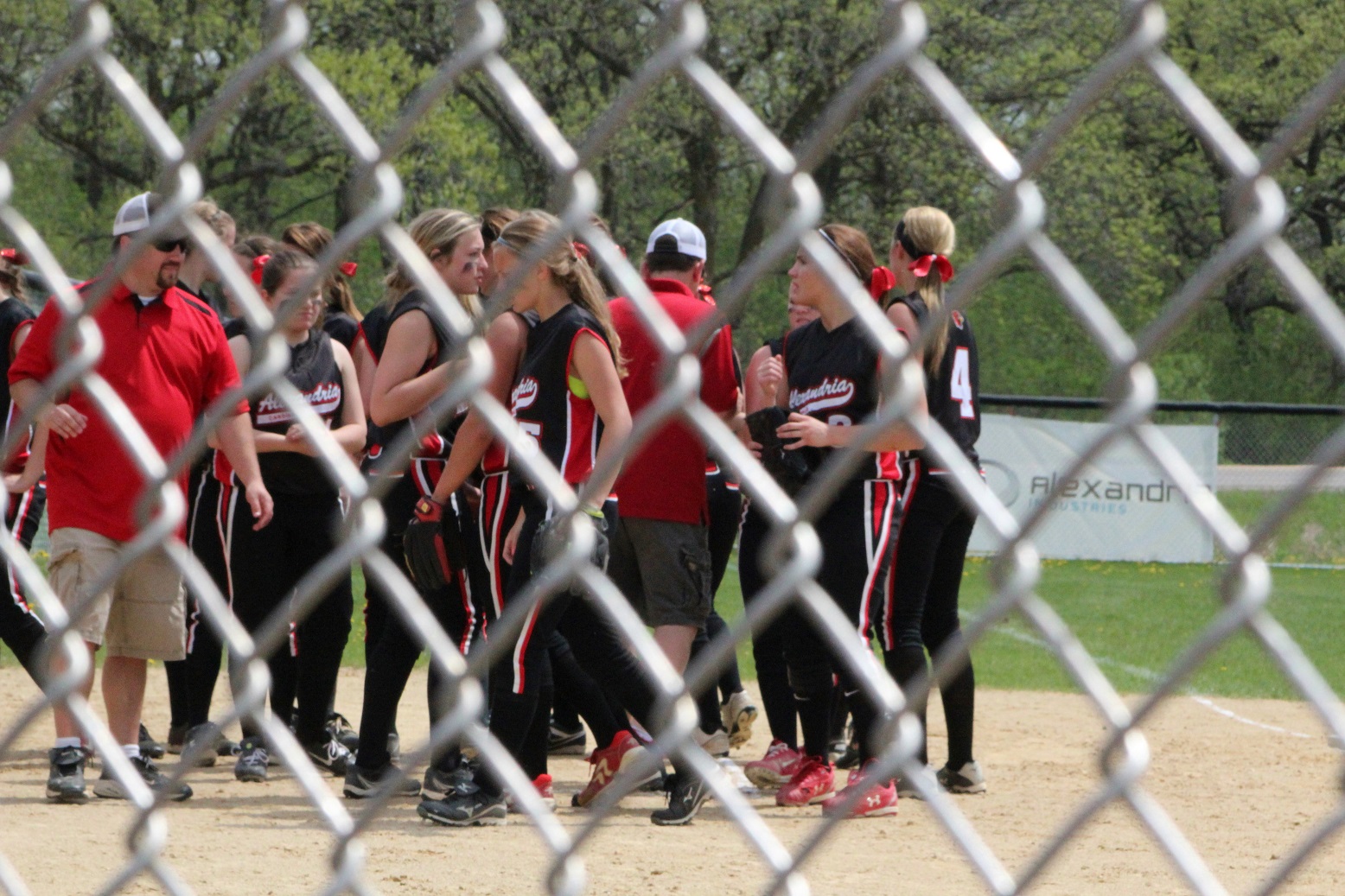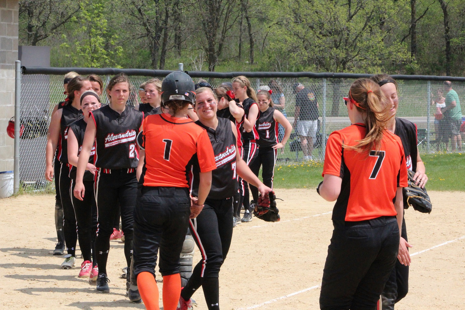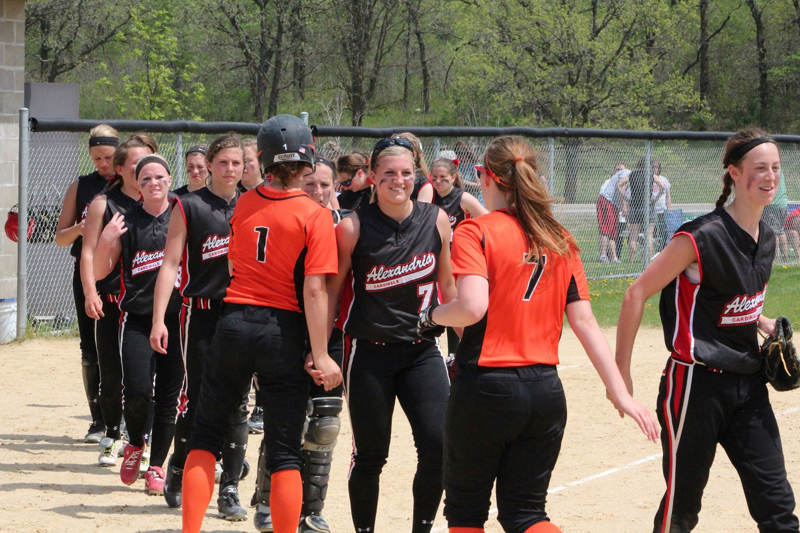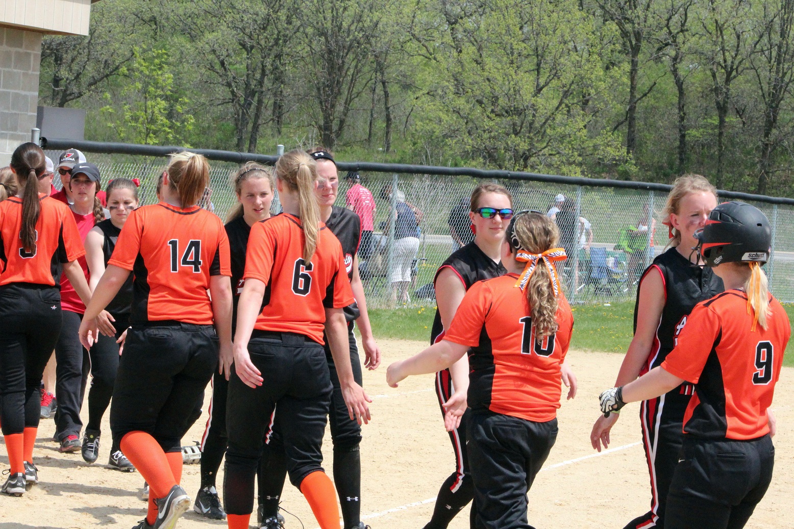 [There’s Taylor in the red helmet getting congrats from her teammates.]