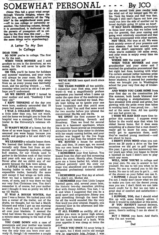 Editor’s further note: Just got our first graduation notice. It’s a reminder to once again share Dad’s column to me . . . a mere 49 years ago. It’s time to congratulate all those who graduate this year, the last class ever out of Jefferson, and to thank you all for keeping the old alumni entertained throughout the years with your abilities and passions in sports, music, theatre, and scholastics. (I seriously do not understand the attraction among older people to live in 55+ communities?) Now go out there and conquer the world: