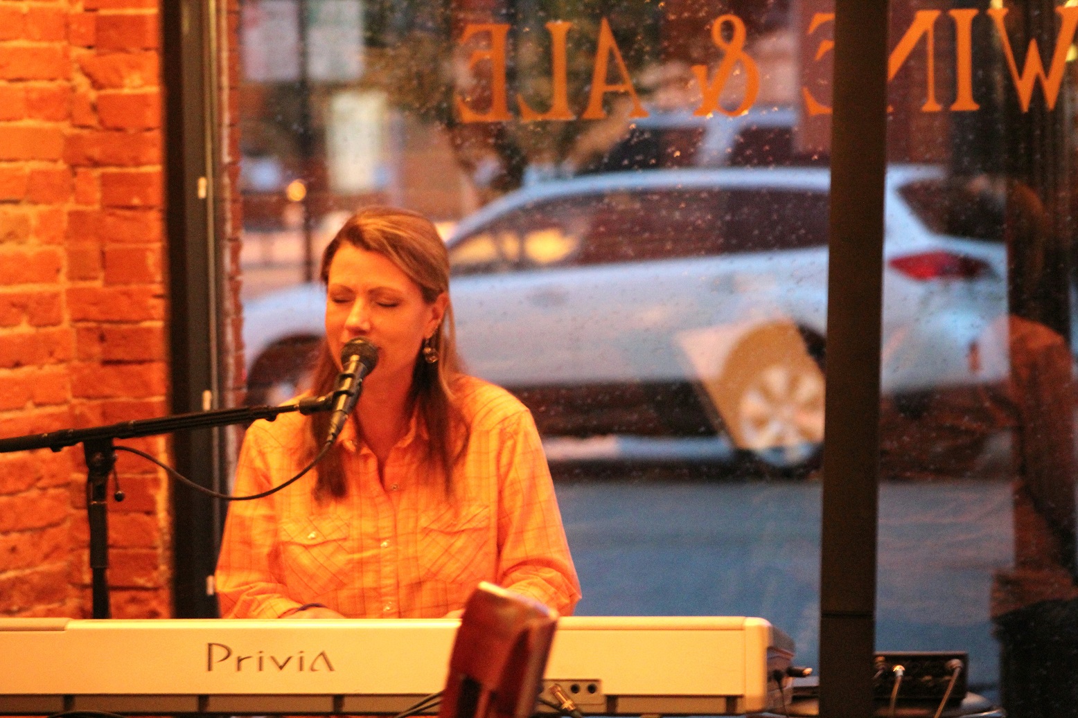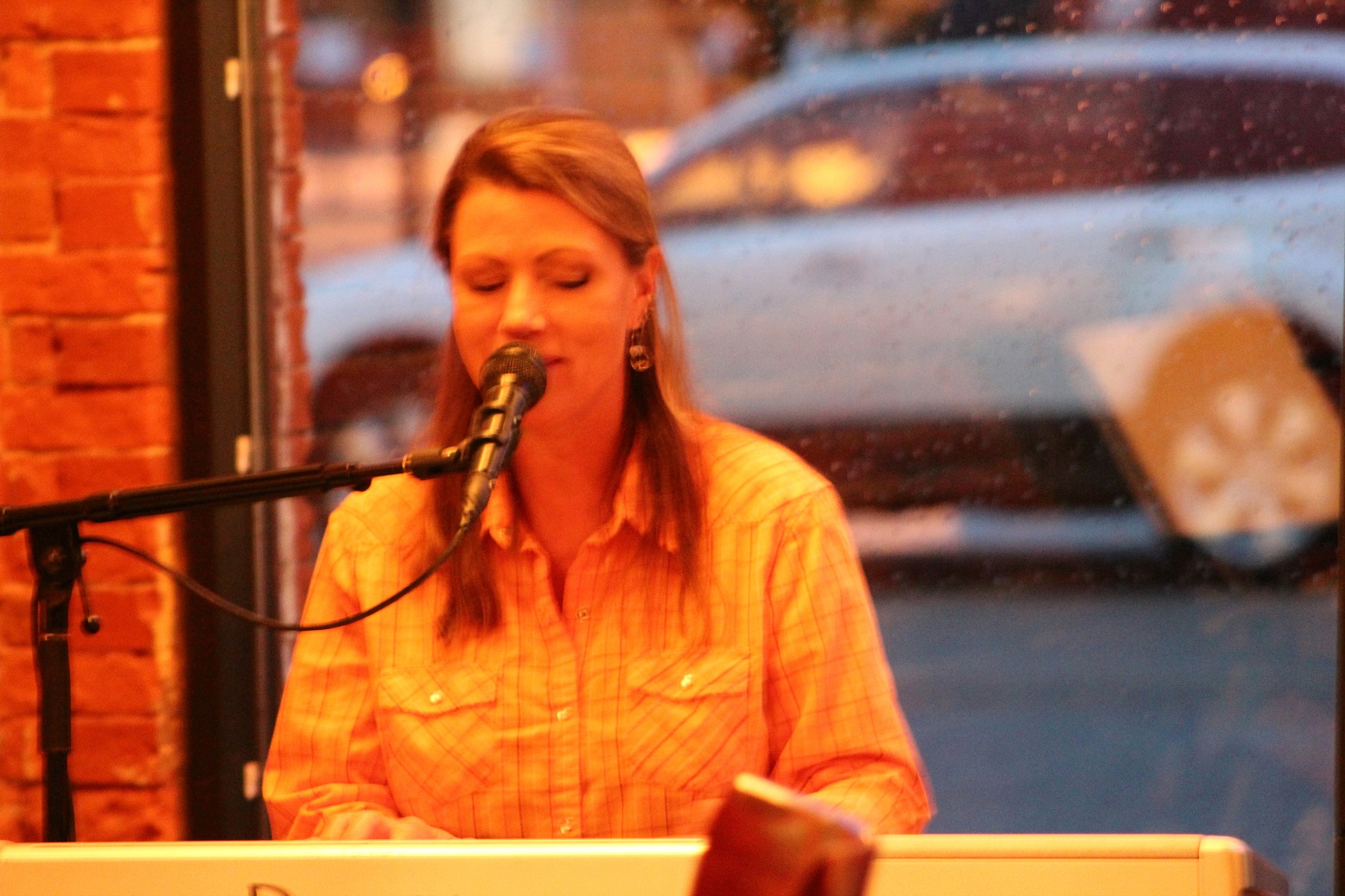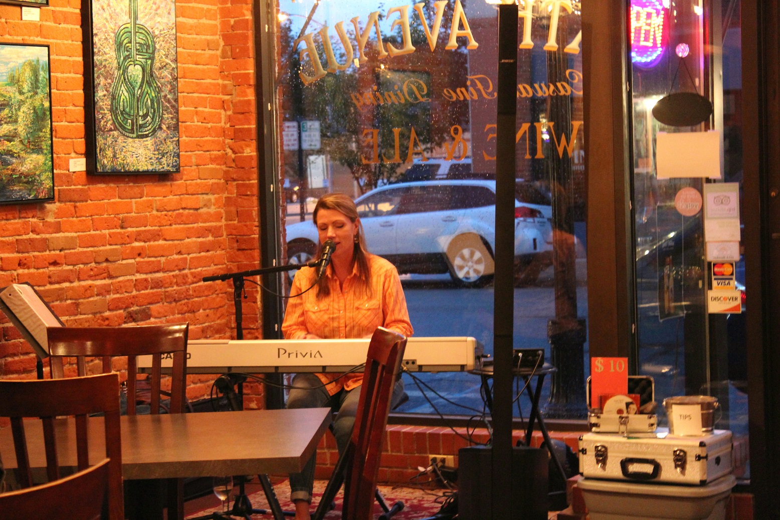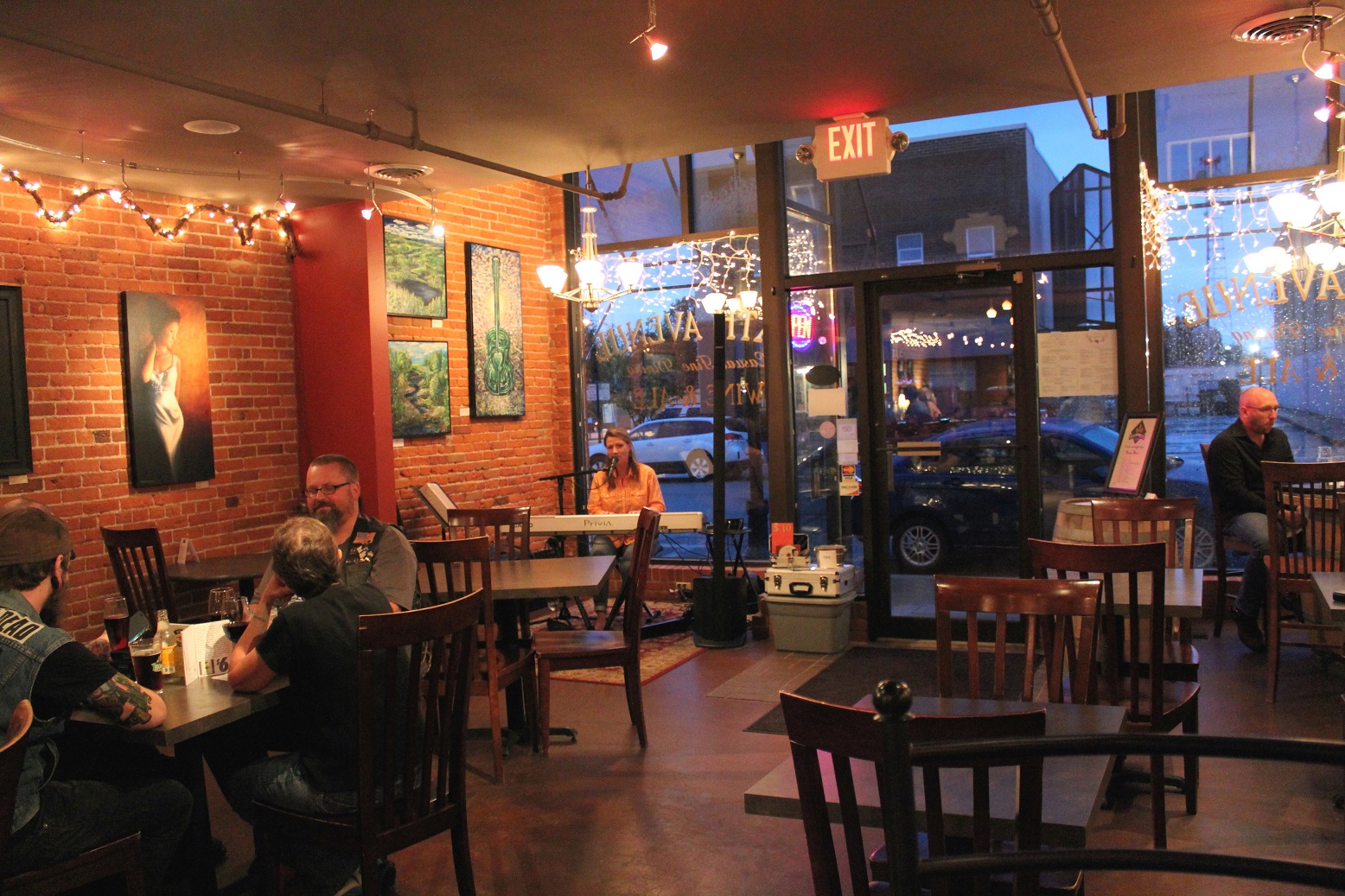 [It was a little too dark to get many good photos of Lisa (the deluge du jour was continuing outside), so I included the now “art museum” look to SAWA, on this wall featuring works from local artist Tracy Anderson, with Bruce Hecksel’s, of Patchouli, works on the far right.]