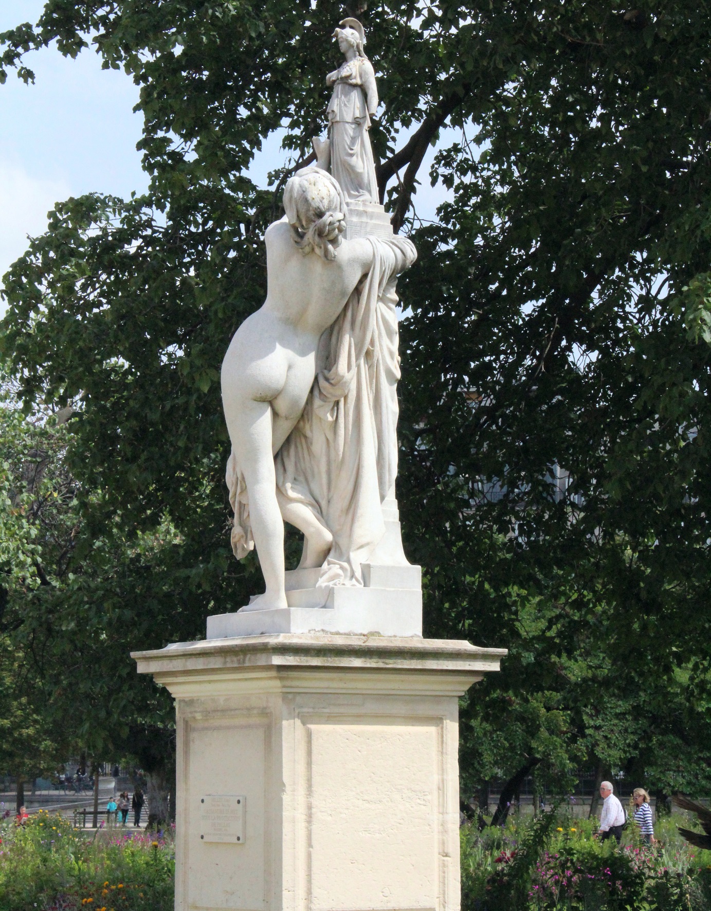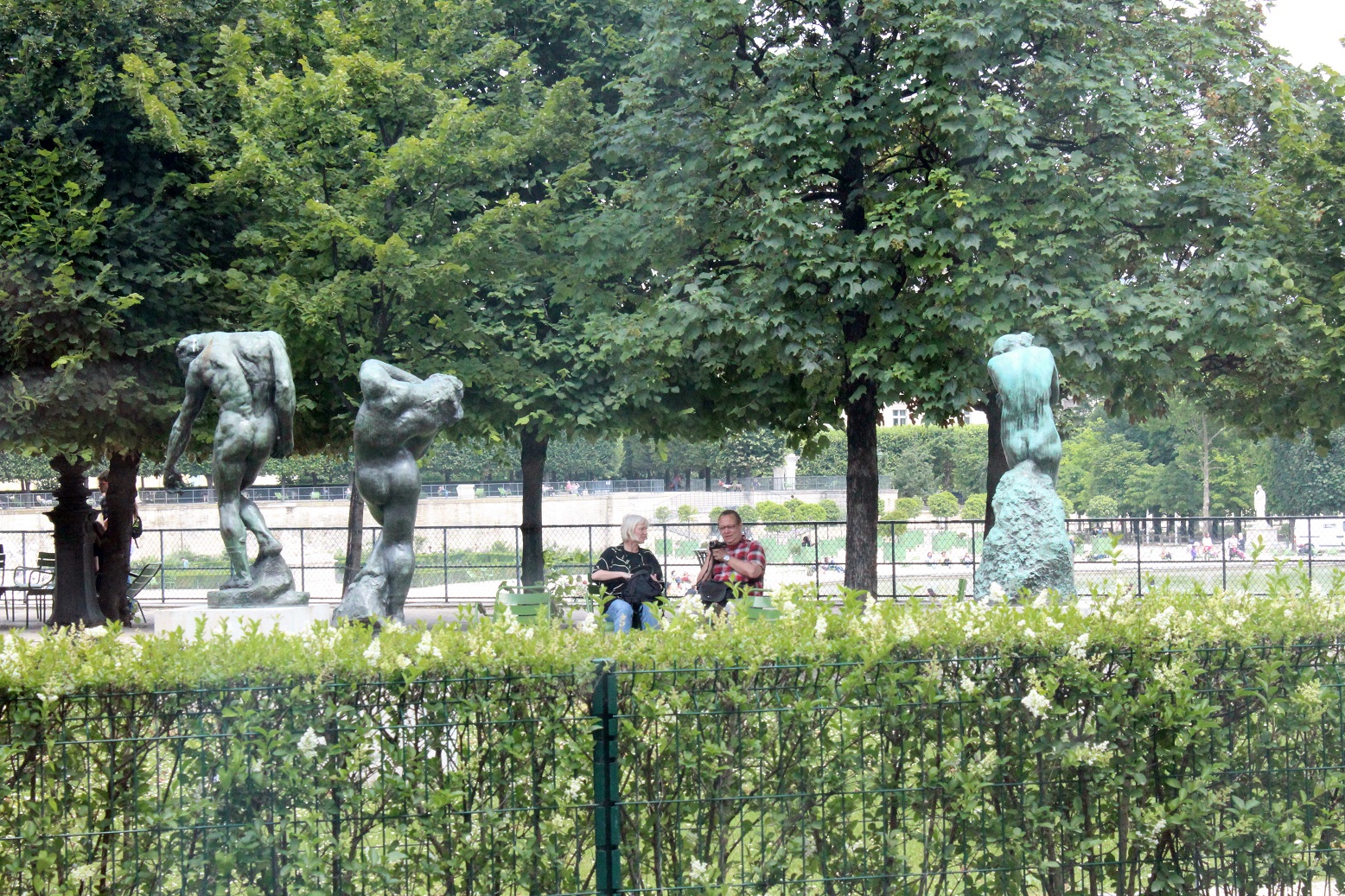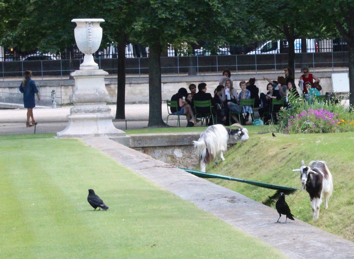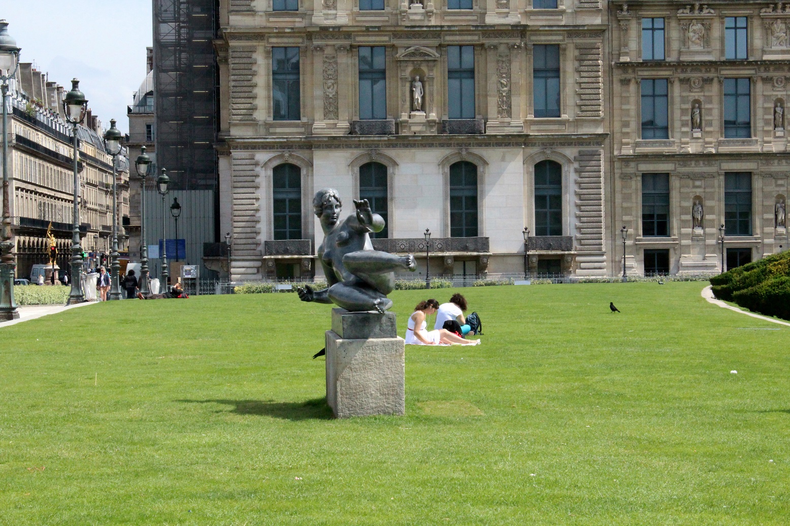 [The crow took refuge behind people enjoying the sun on the grass. Oh, and I believe the statue to be a Maillol named “Mediterrane.”]