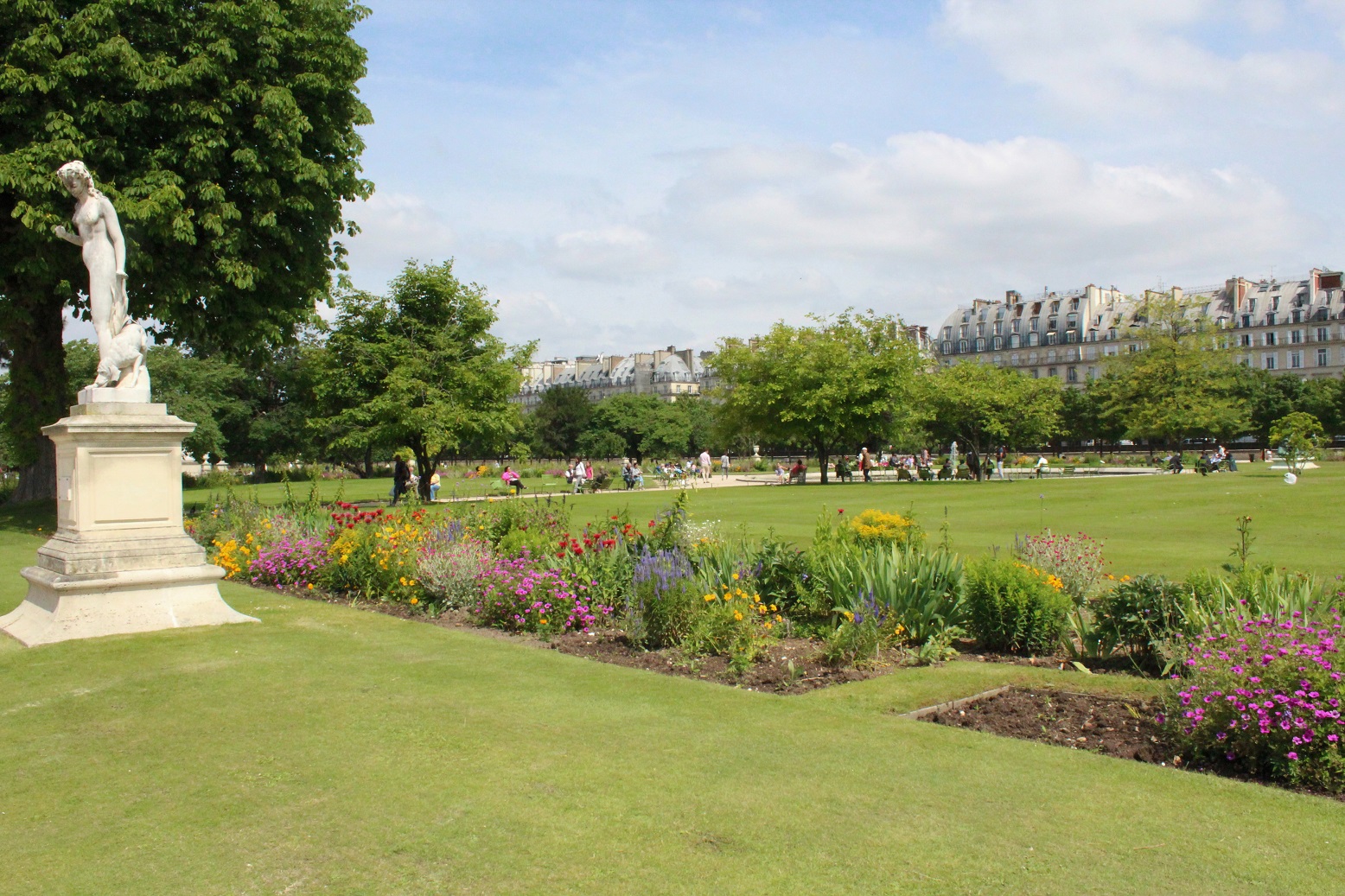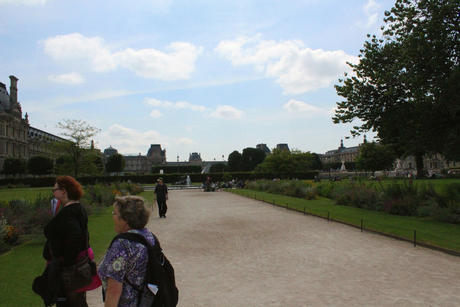 [Looking back toward the Louvre while Elizabeth and Reetz admire the flora.]