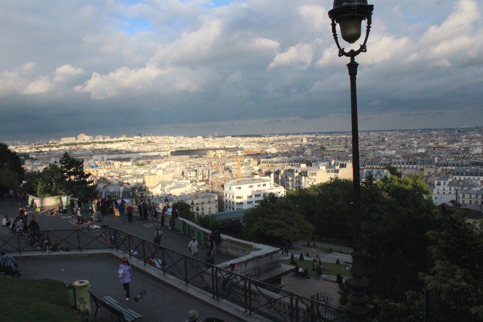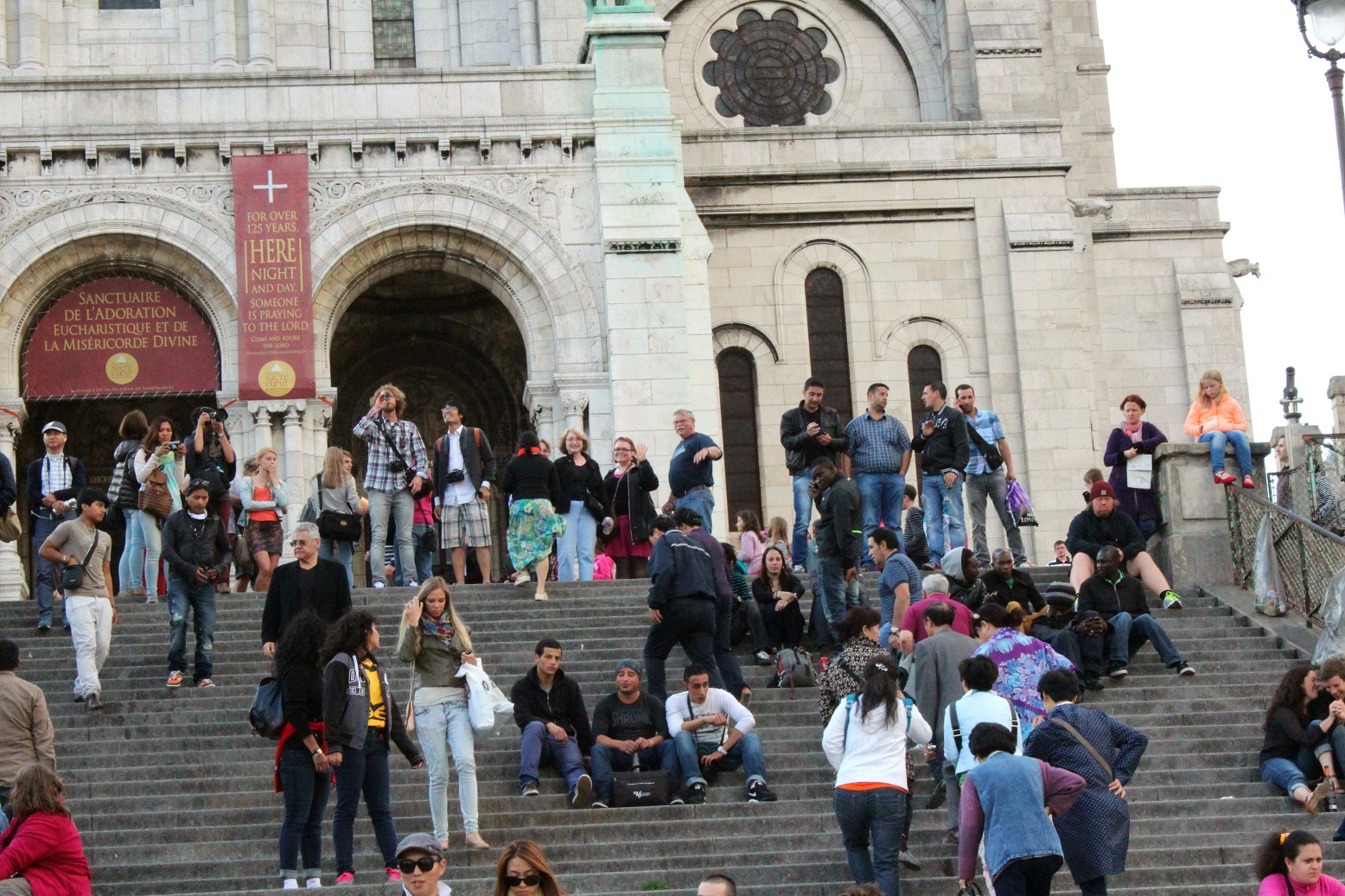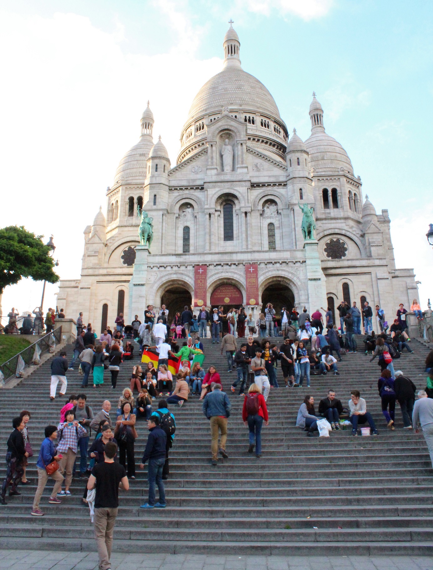 [The Sacre Coeur was behind us. I guess people were sitting on the steps waiting for the City of Lights to . . . light up?]