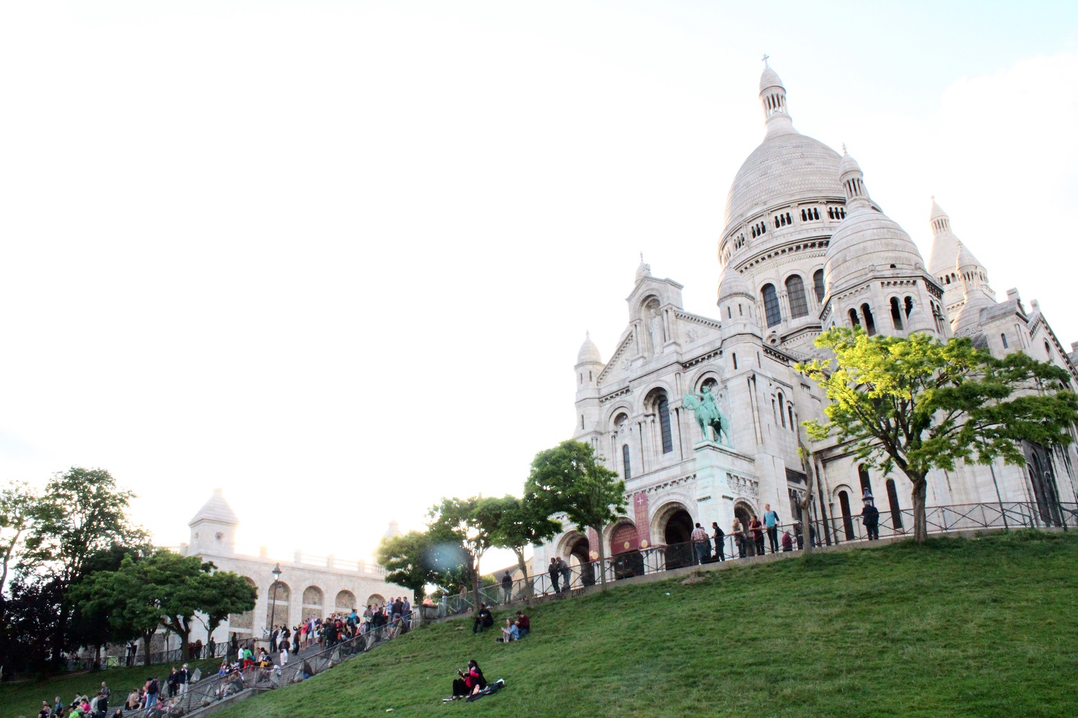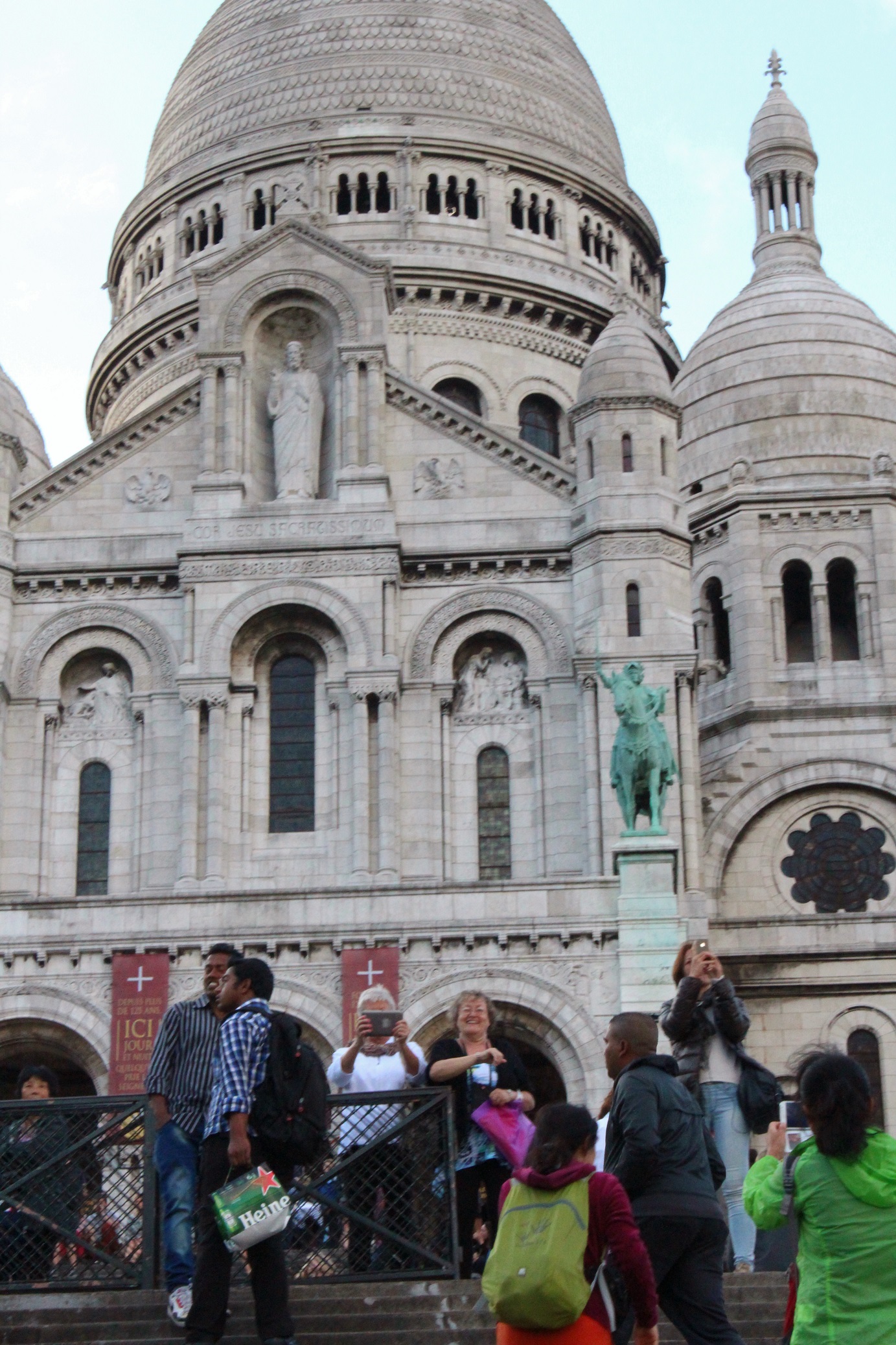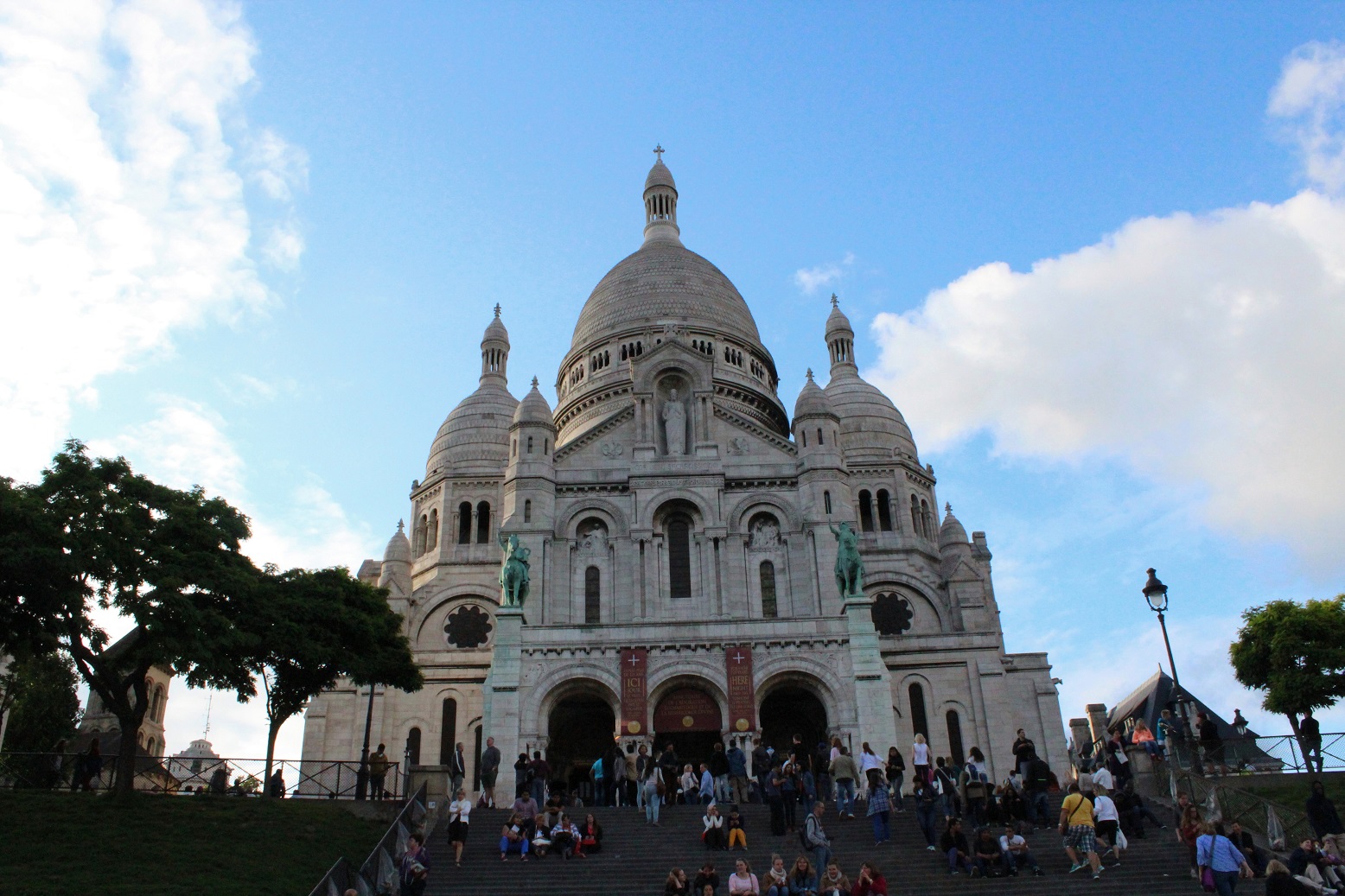 [A closer upper view of the Basilica of Sacre Coeur on Montmartre.]