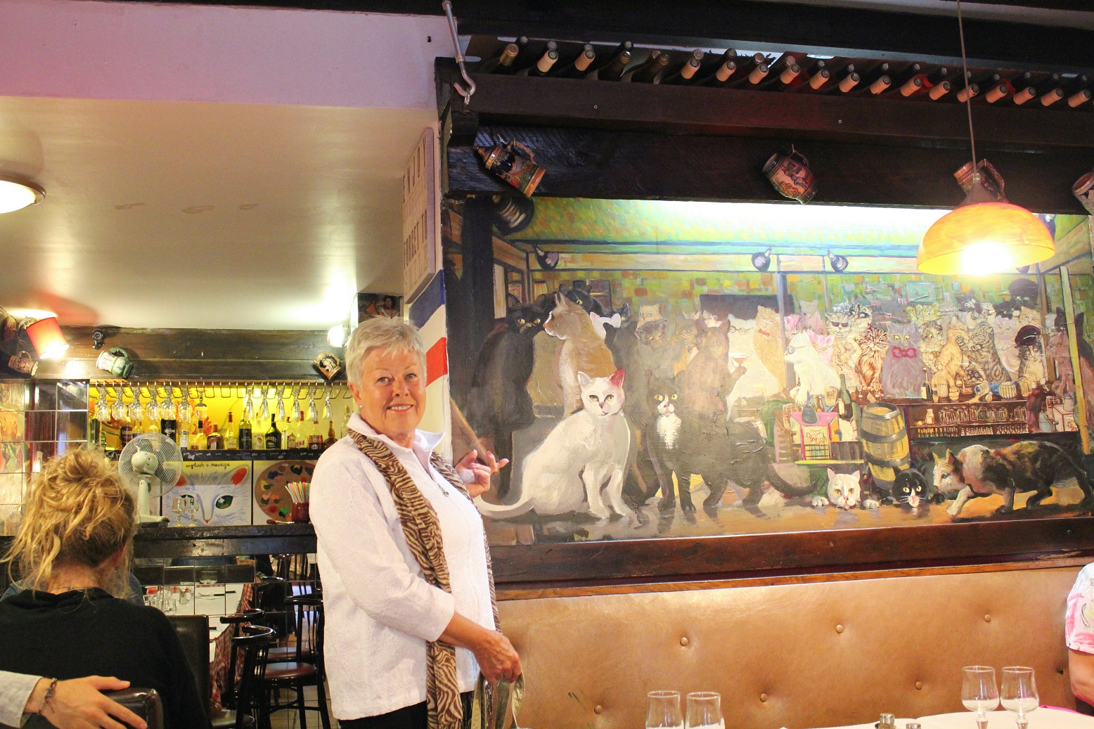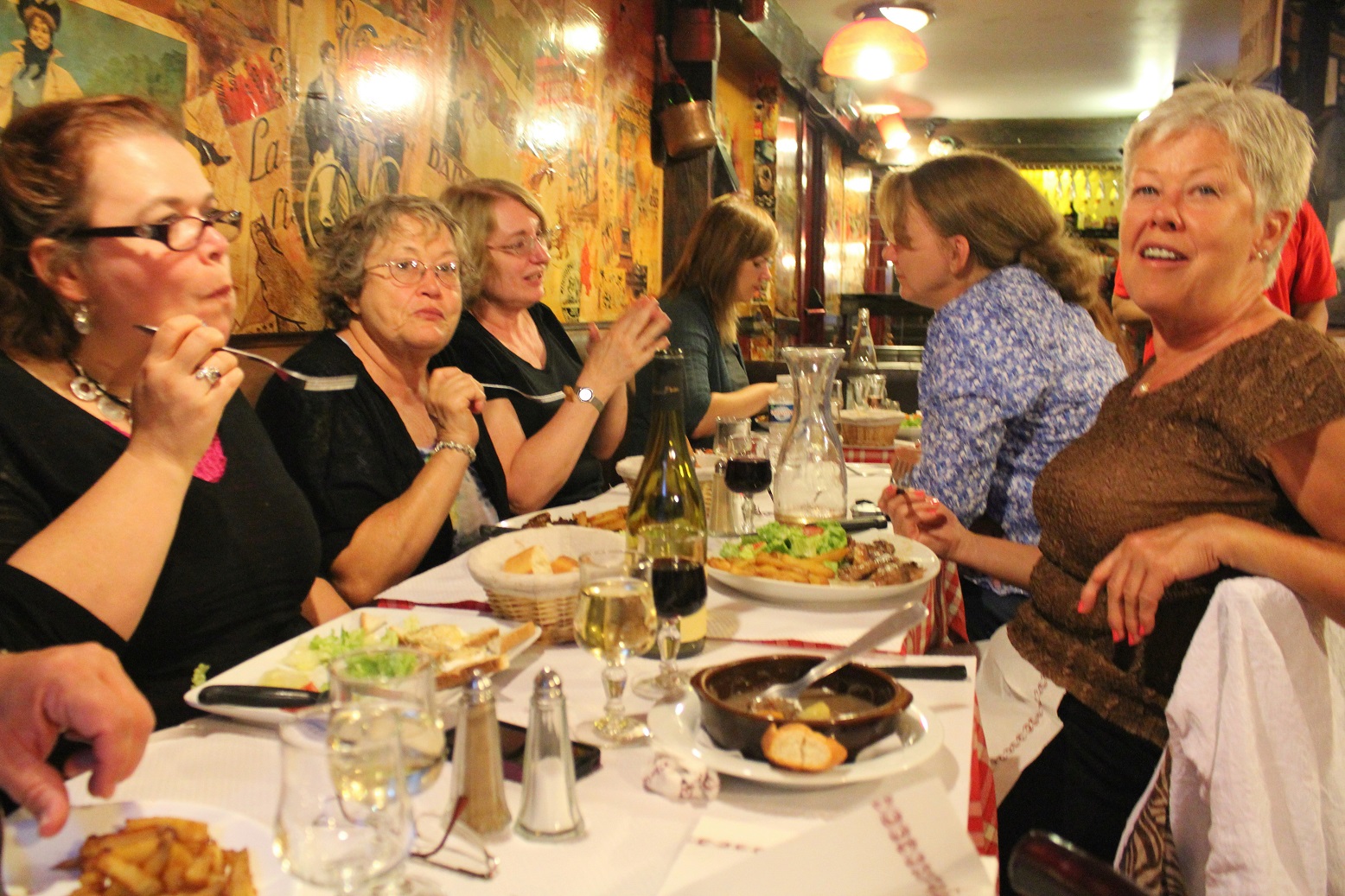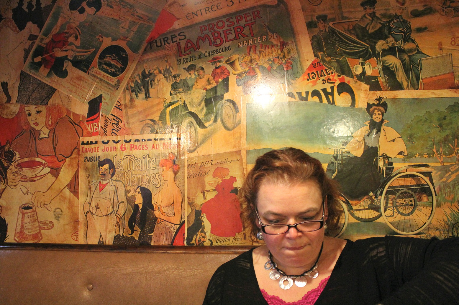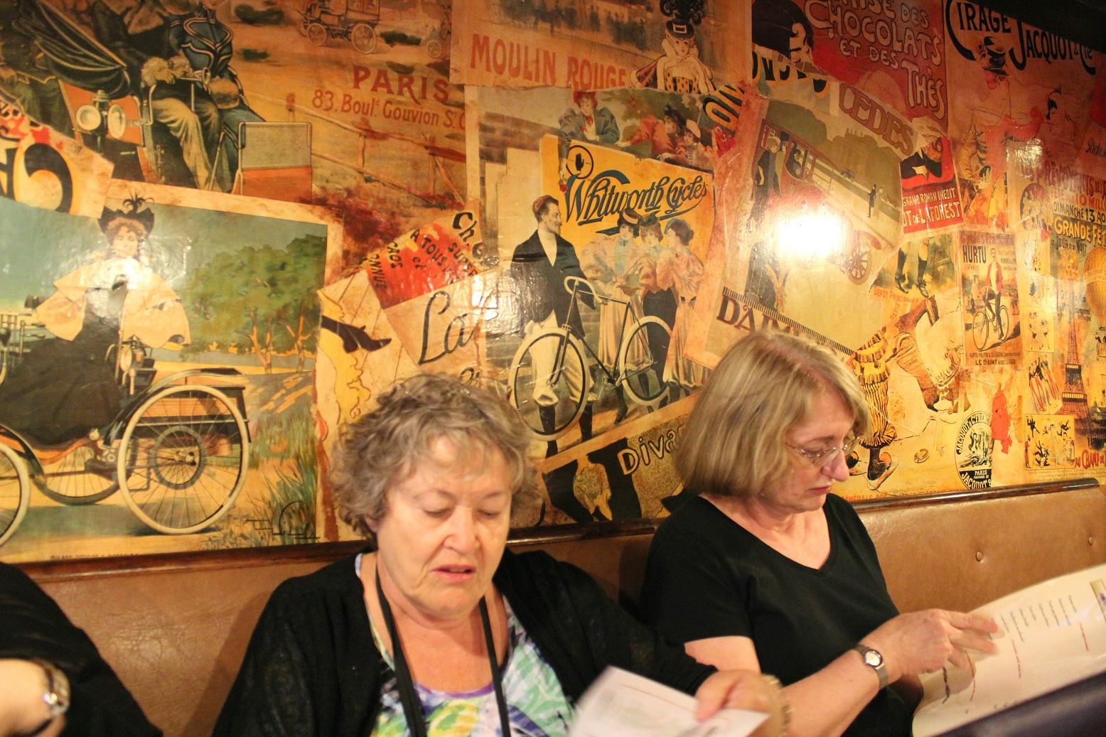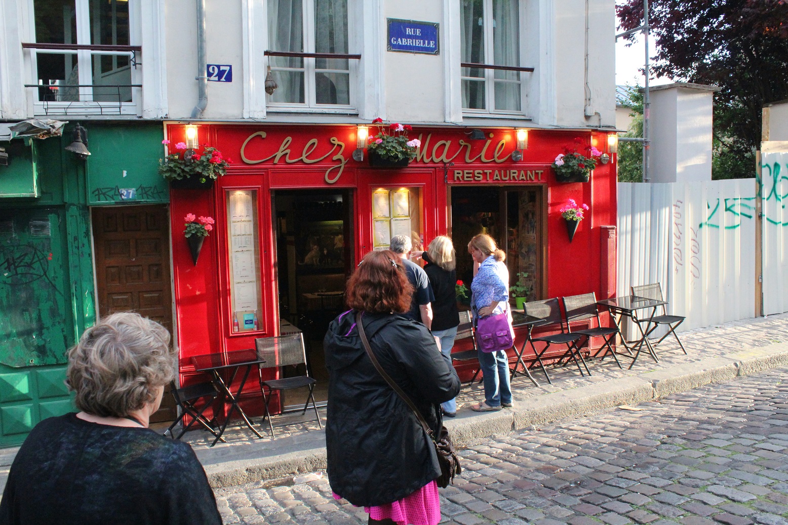 [Unbeknownst to us during the day’s activities, Elizabeth had a plan for the evening. A café on Montmartre appealed to her sense of dining adventure. And what fun, the classic subway exit/entrance at Montmartre. 🙂 ]