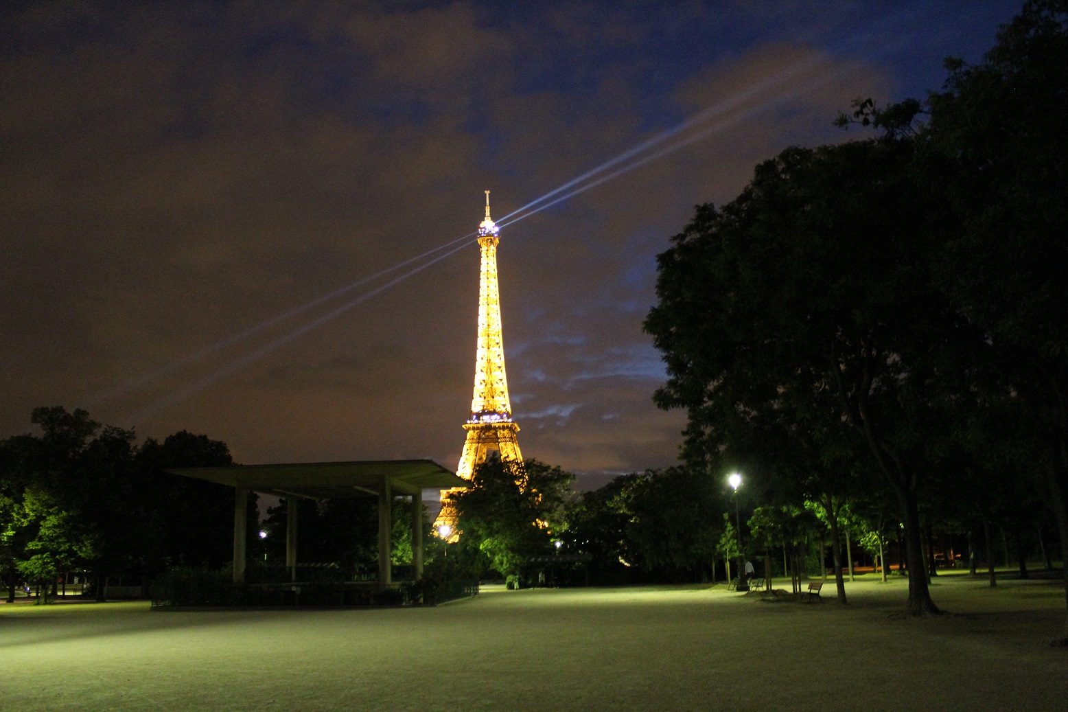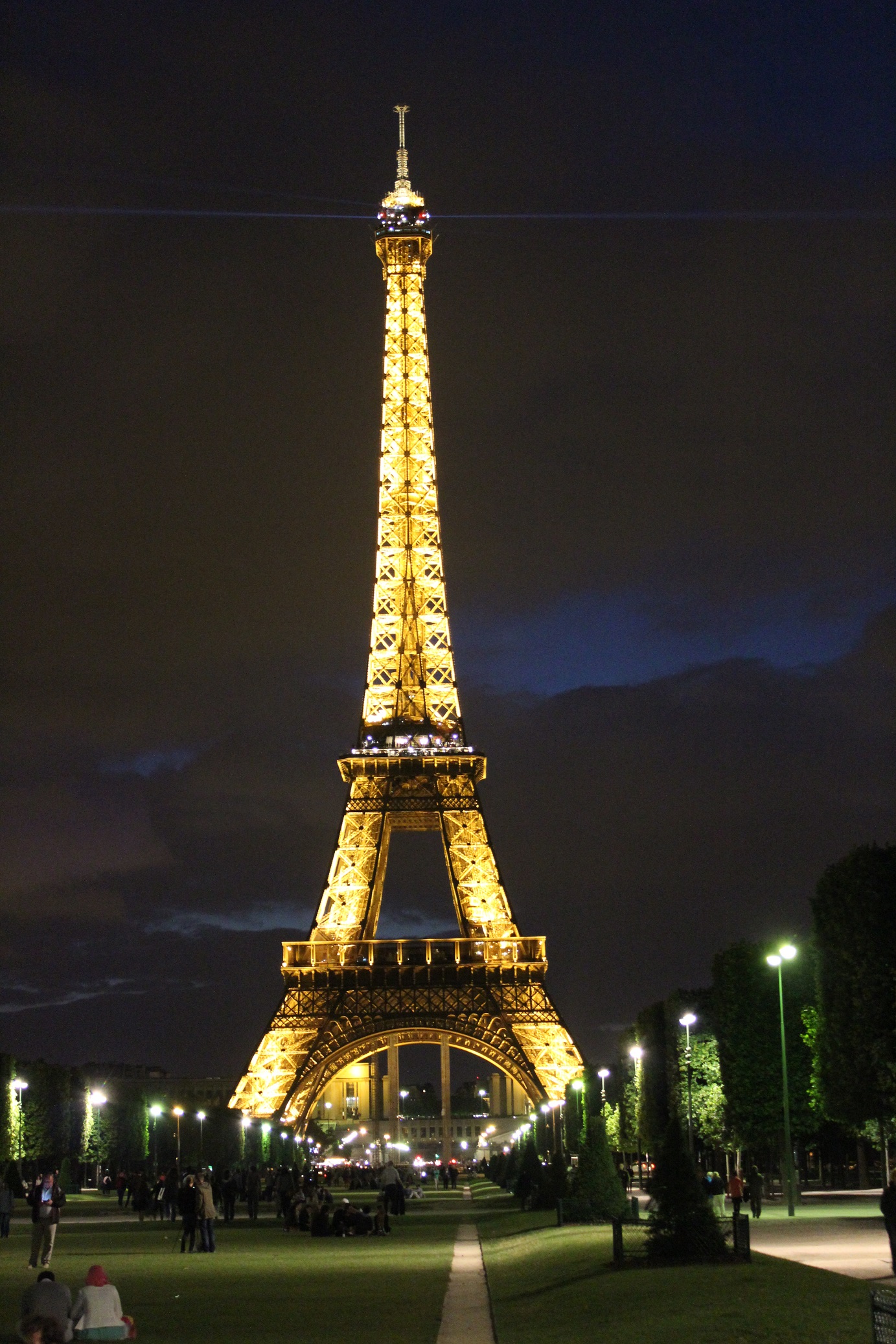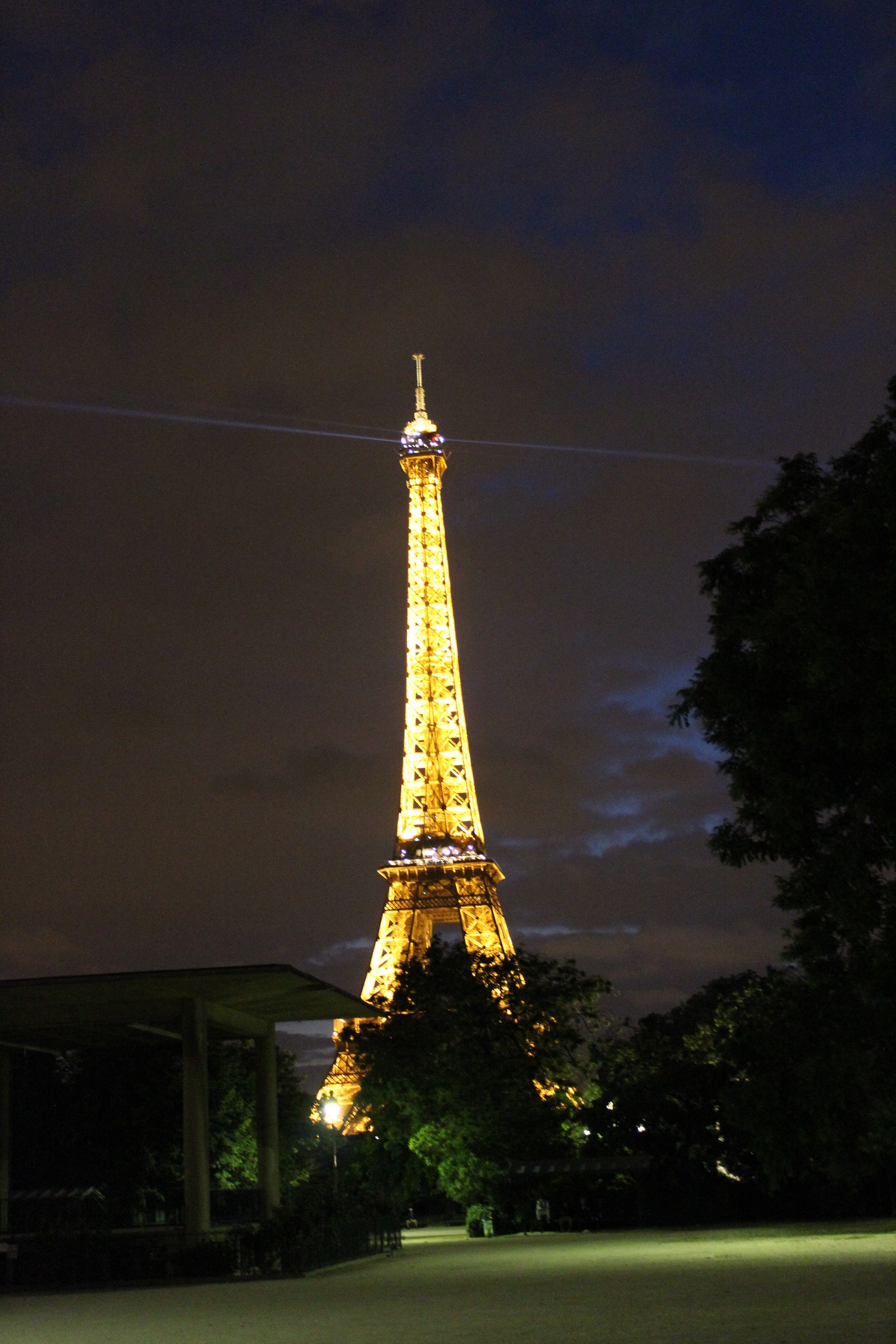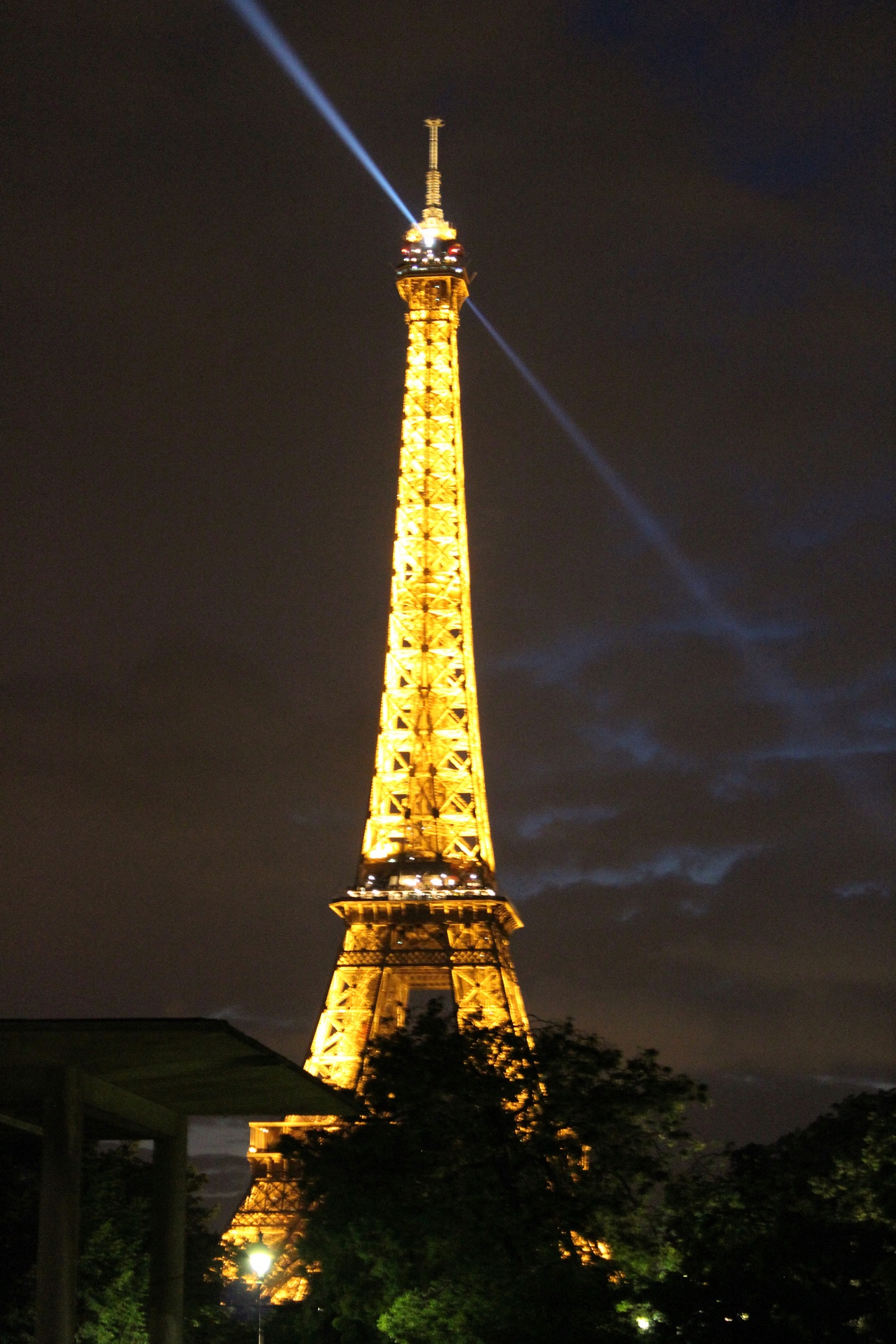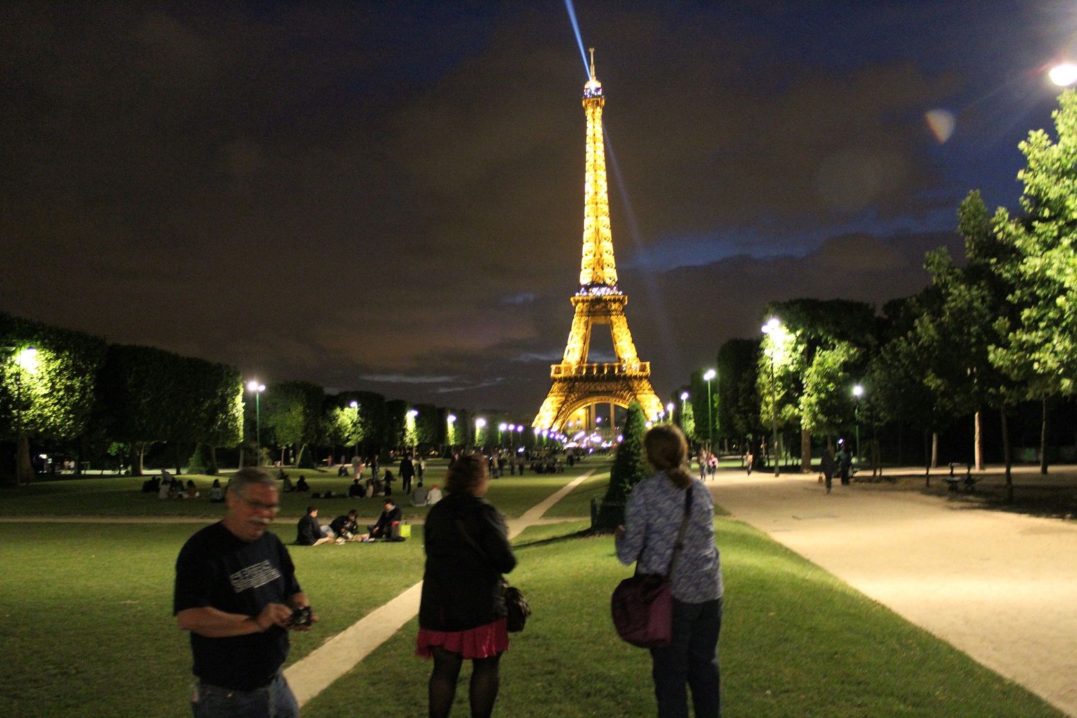 [Back at the hotel, we hied the three blocks for this view. It must have been 11:00, because the Tower puts on a light show the first ten minutes after the top of the hour.]