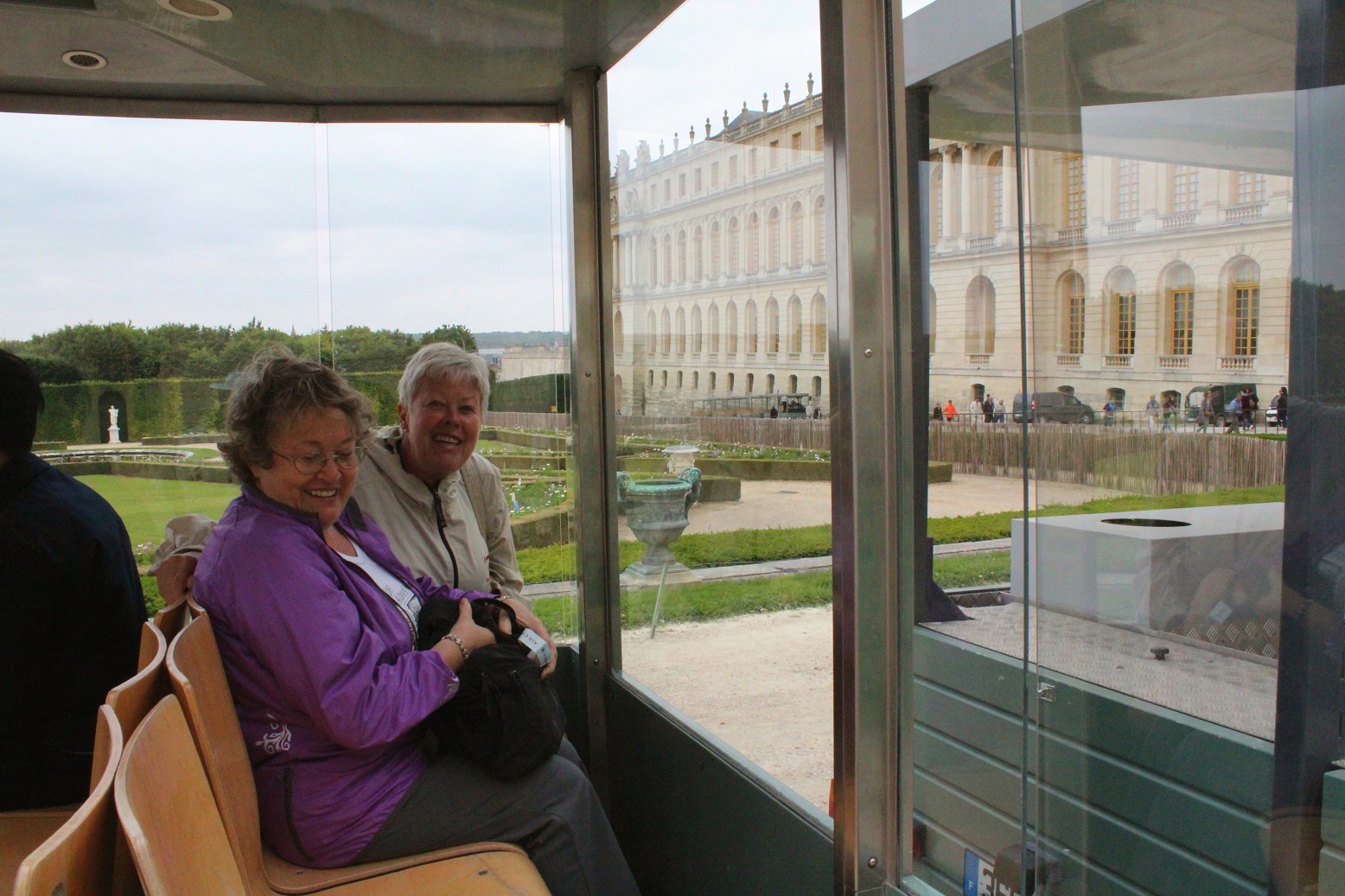[We’ll end Part 1 with The Biddies on the tram ready for a tour of the gardens (Part 2). Did I mention we ran into a couple we met on our river cruise here? Amazing! As I recall, they were a part of the fun-loving French-Canadian group. There were times I felt a tad hot and claustrophobic on the palace tour – it’s basically wall-to-wall people and I presume that is just the standard way it is. If I had to do it again, less time inside the palace and more time out in the gardens.]