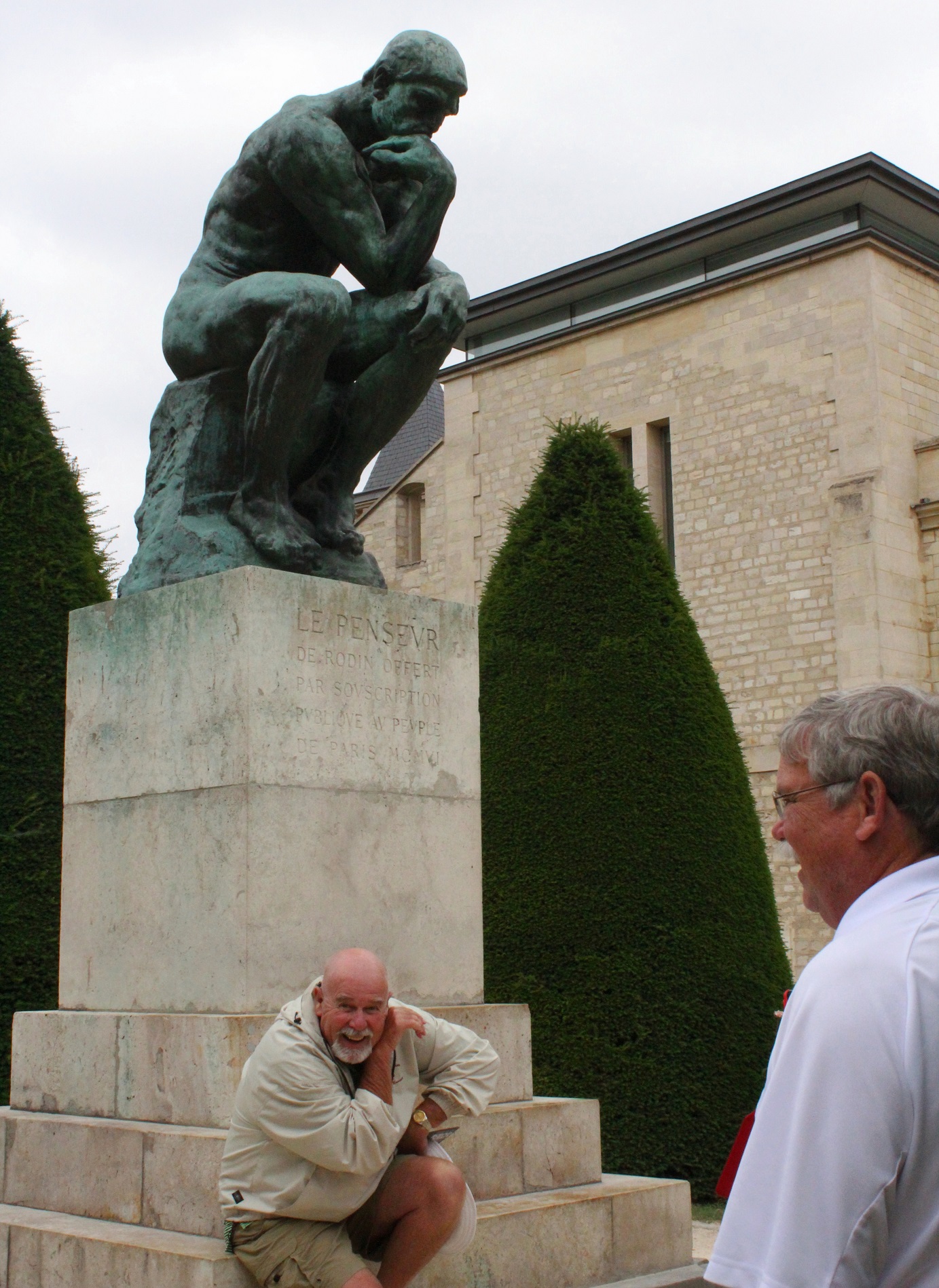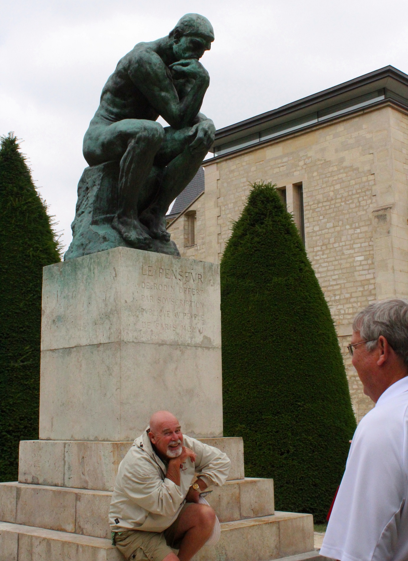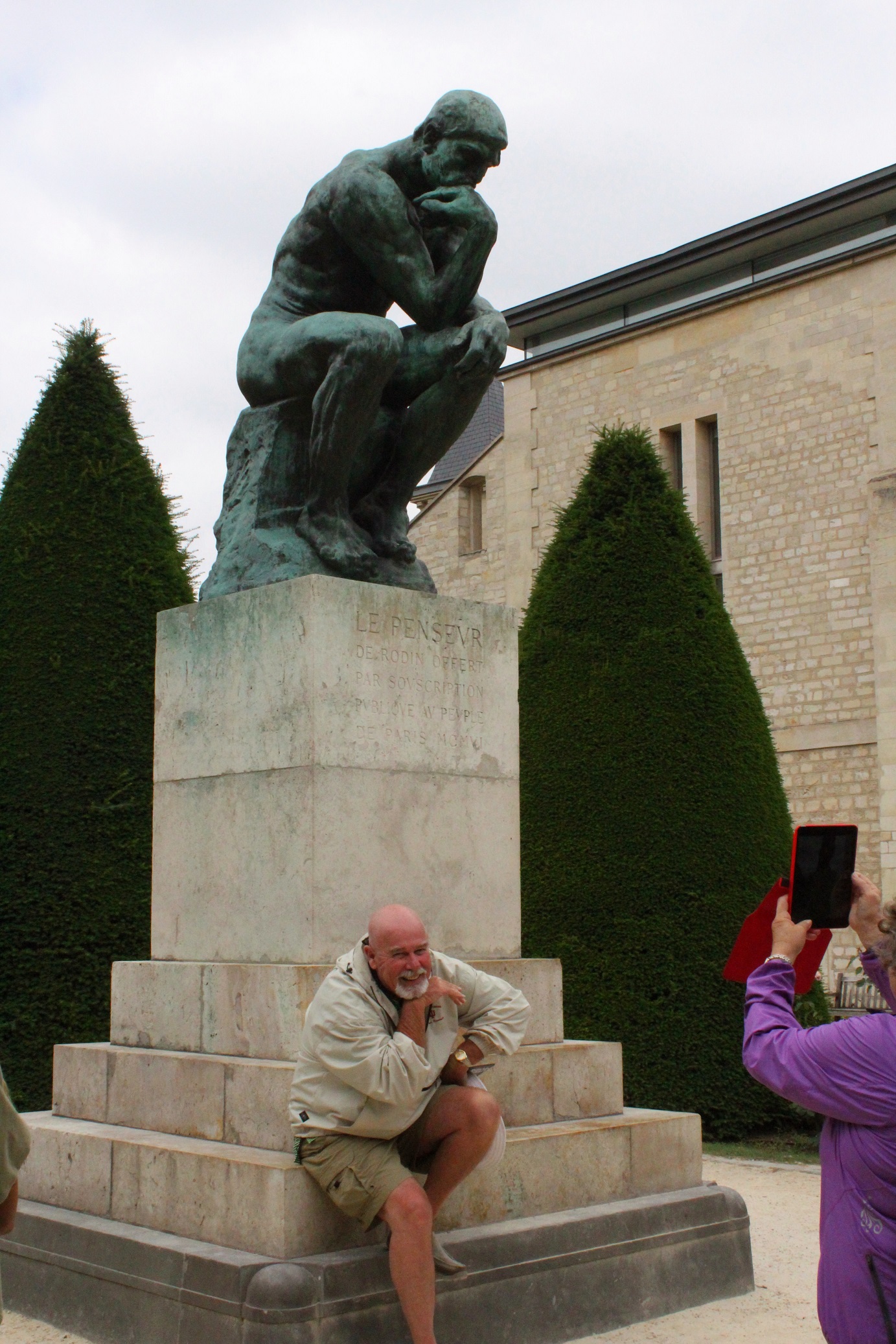 While posing for Rodin’s “The Thinker” — Tom, your hand wasn’t positioned correctly. “The Thinker’s” hand is curled inward and resting on the right side of his face. Just a little observation.