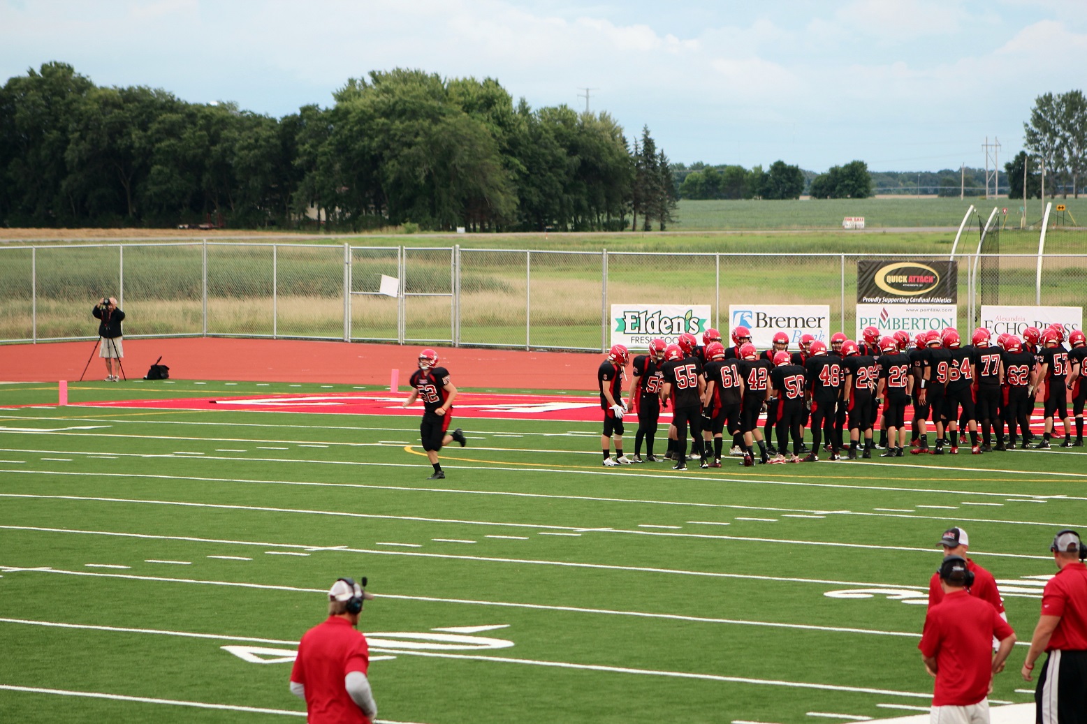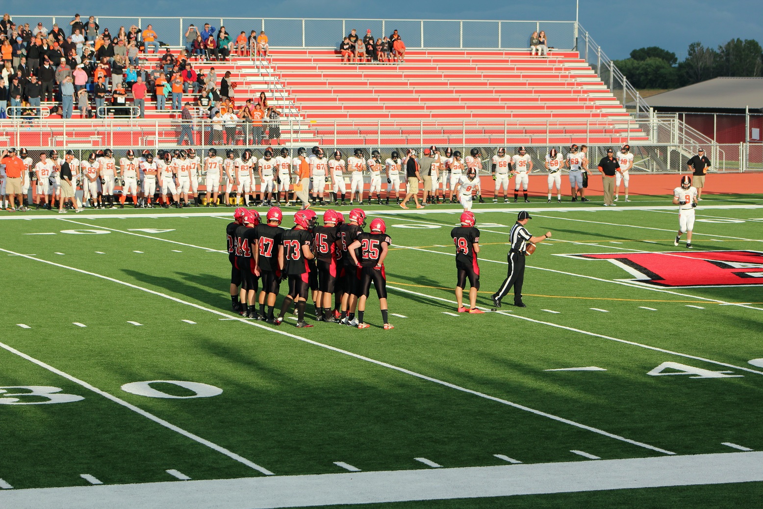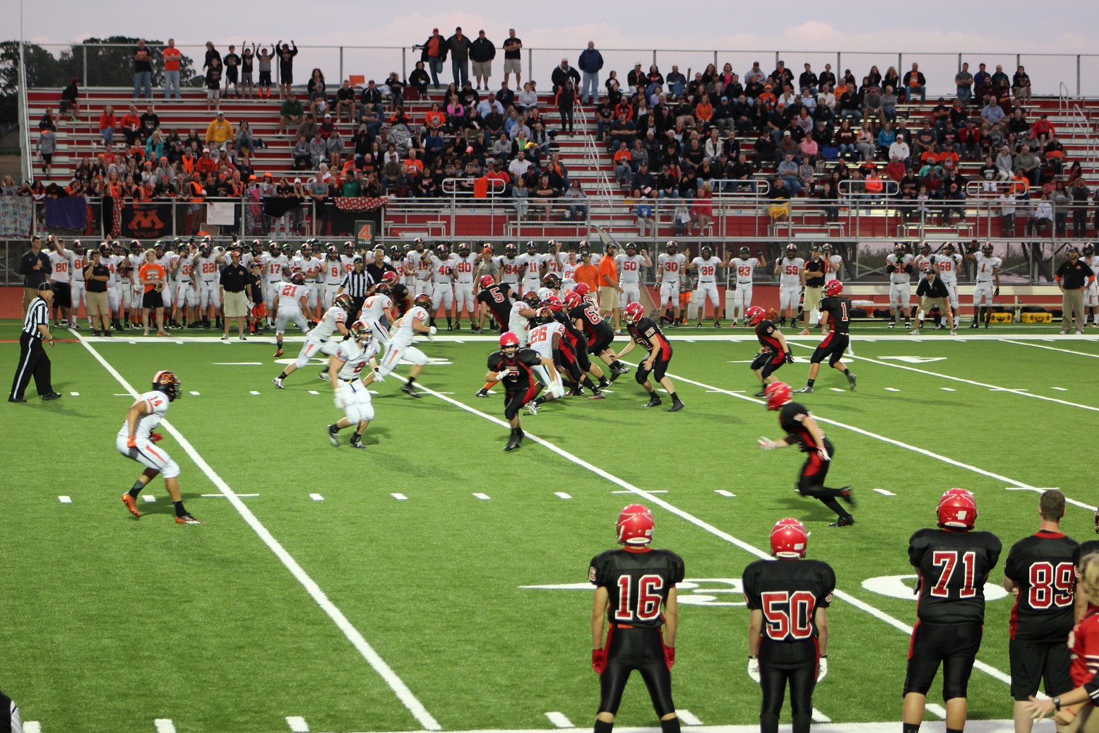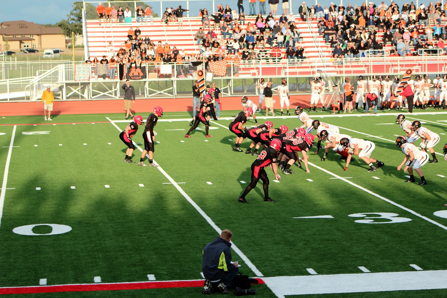 [As the team is introduced, we had to keep an eye out for Brayden Amundson (7), junior, 6’3″, 178 lbs., wide receiver, who is the grandson of Marlene and Richie Braun. The Brauns were sitting with us, celebrating Richie’s 83rd birthday on the night.]