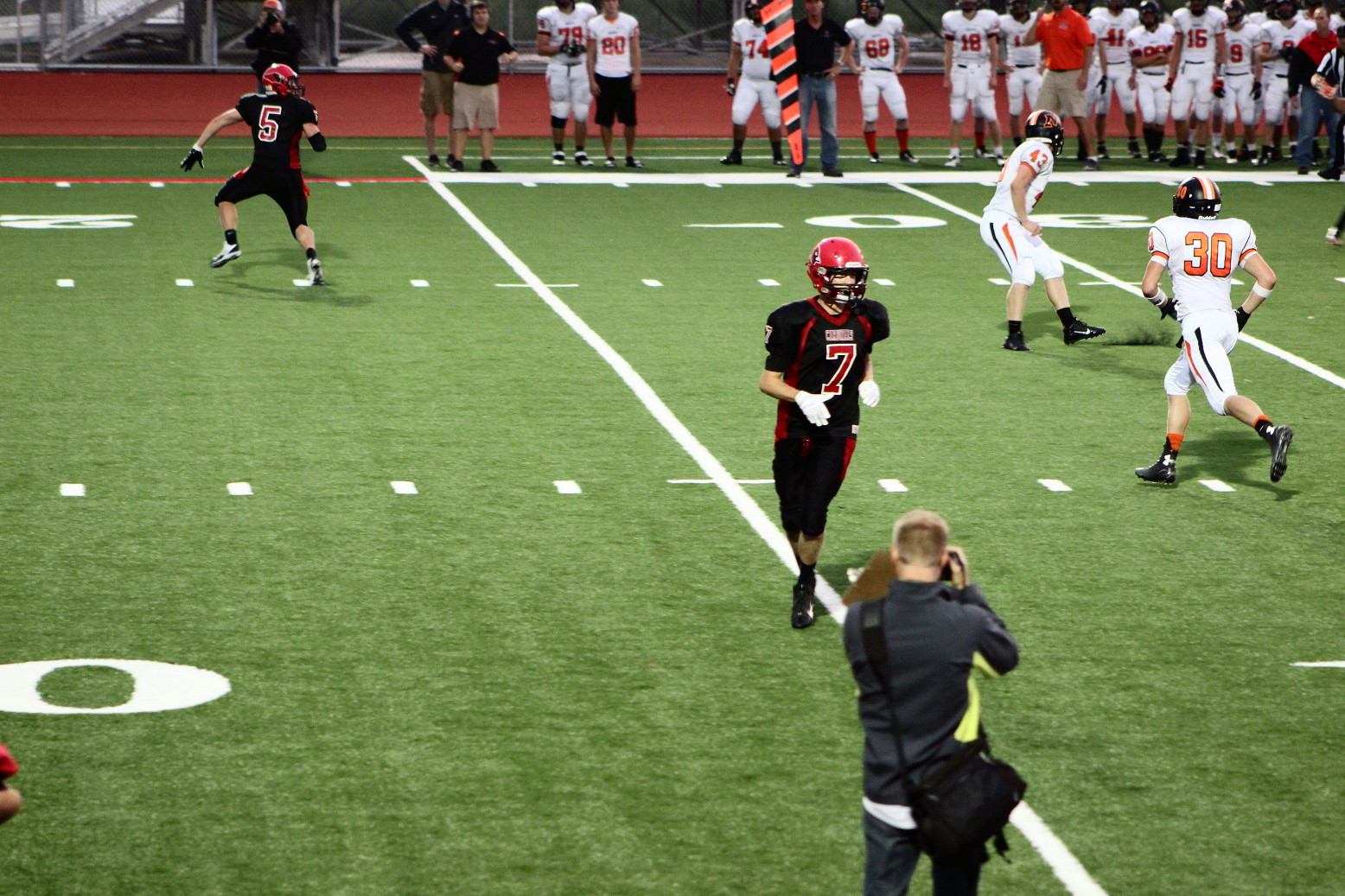 [Anatomy of a (almost) touchdown play. With little time left, Roste drops back to pass, has to do some scrambling, eventually finds Gorghuber again (I believe) for the tying touchdown. The play was well-covered by three on-site photographers. Unfortunately, as so often happens when a quarterback scrambles, ineligible receivers drifted downfield. Penalty – no touchdown. 😦 ]