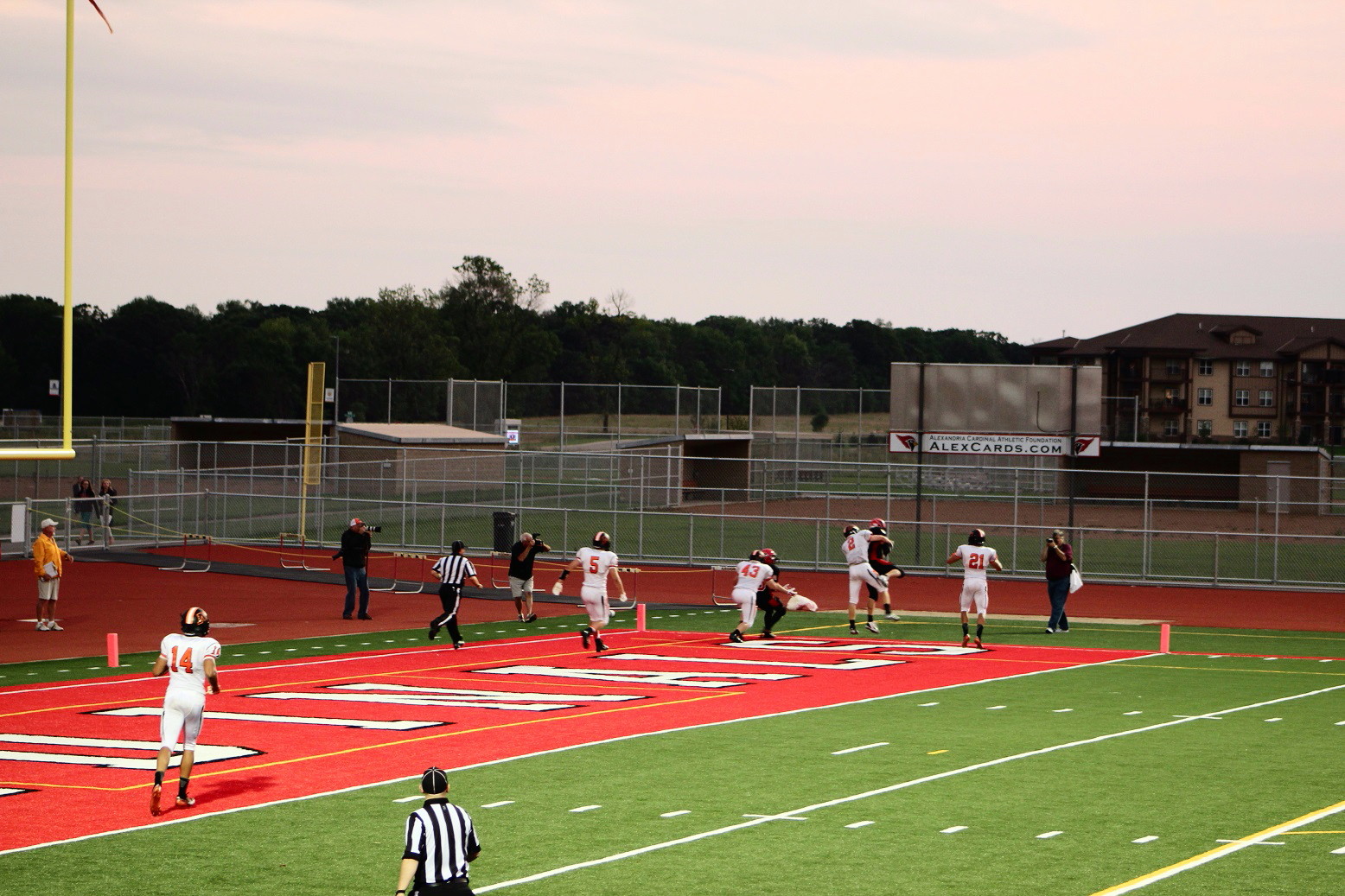 [This obviously is after a Spuds score as Justin Cumberbatch (43), senior, 5’10”, 227 lbs., linebacker, state wrestling champ, returns a kick-off. The Cards were down 12 – 0 in the first quarter and appeared to be overmatched.]