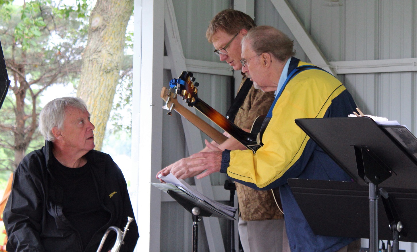 [August 17, the Mel Lamar Trio at the winery. Here Mel explains to Bill the finer points of bonsai trimming, as Al listens on intently.]