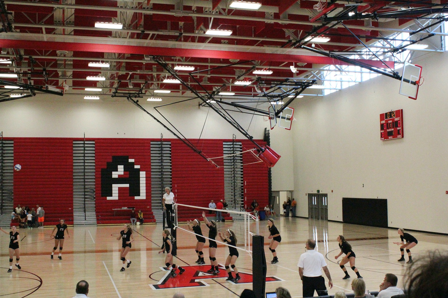[I got there just in time to see how the nets are stored in the ceiling. As it was rising, I heard a loud pop and thought a cable had snapped or something? But it made it. Oh, and the JV is playing in the foreground – I believe they won 2 – 1.]
