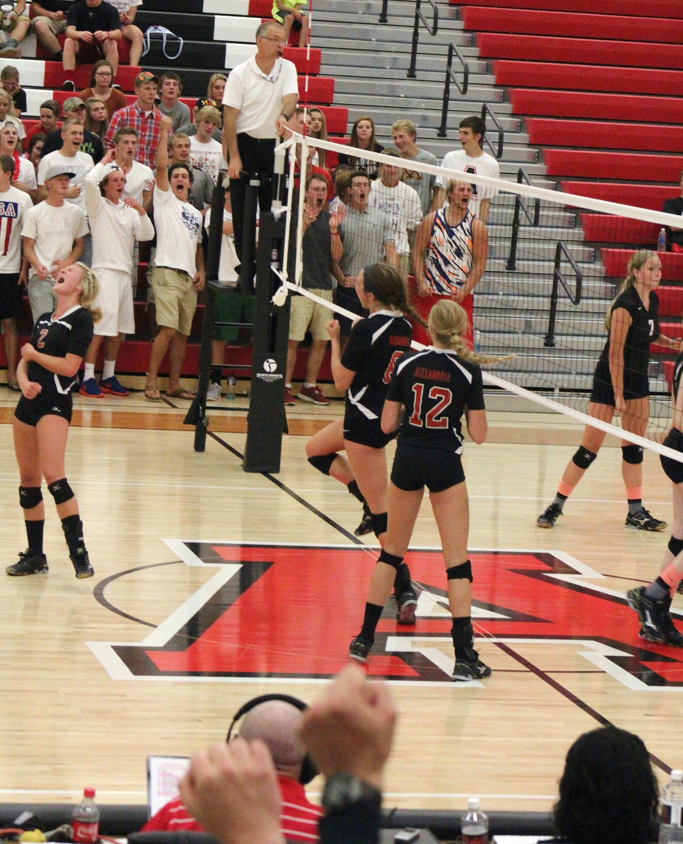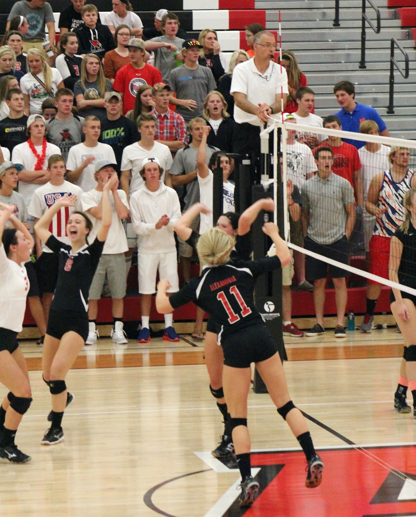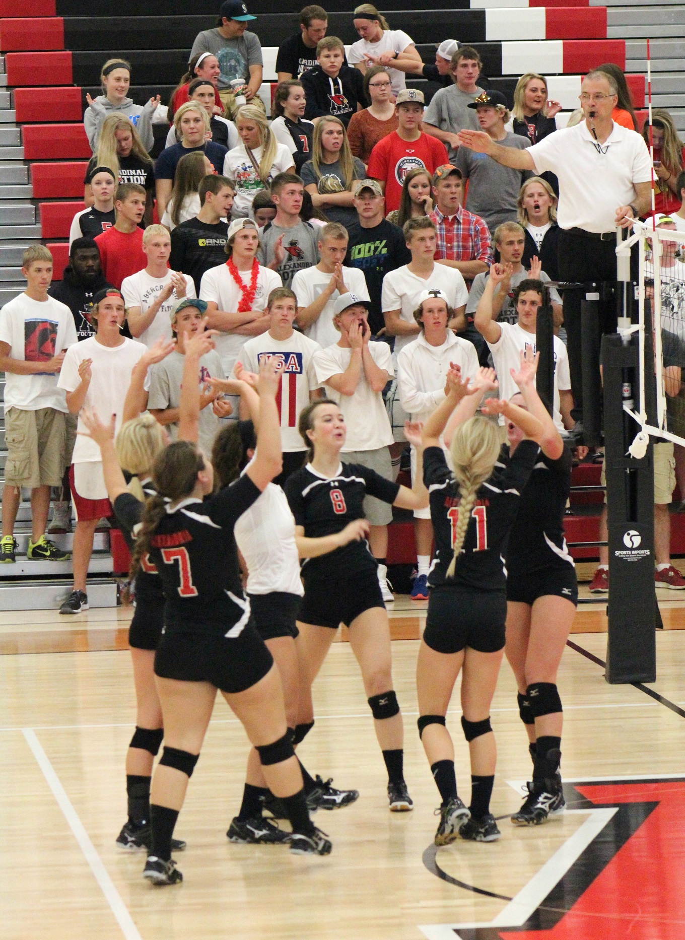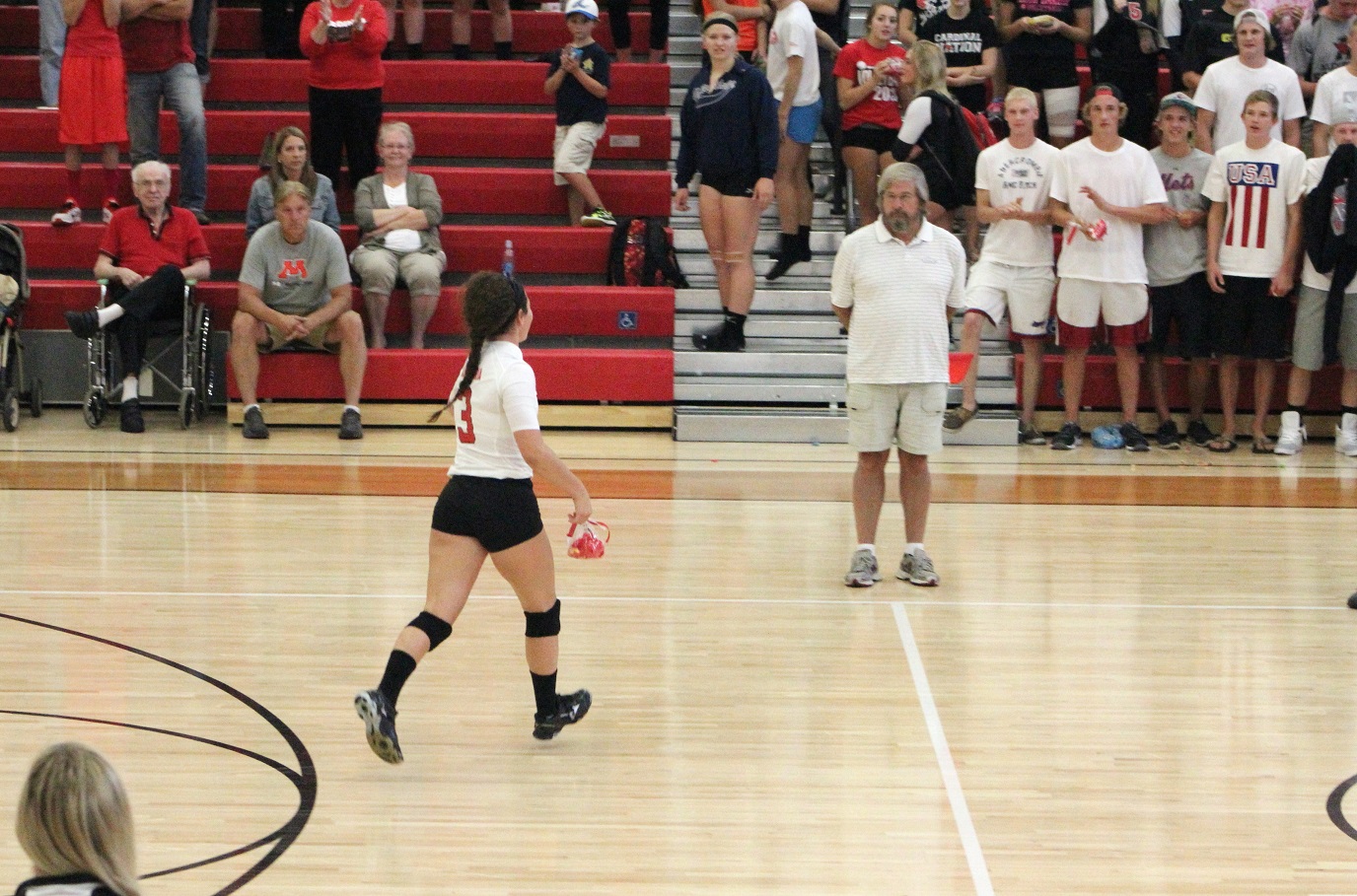 [Let’s celebrate our victory in game 3. We did that despite at one time having 4 straight service faults, and it would have been a 5th except the Spuds played a serve that was going long. This is a senior dominated team, led by the 3 up front all-arounders of Liz, Kalley, and Amanda; and the server/defenders, Gretchen and Katie. We need a few more players to step forward to help balance the team for consistency. Alexis may have done that on this night.]