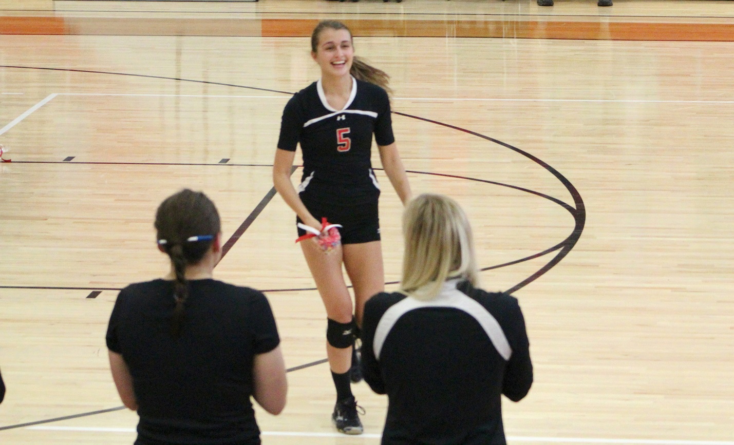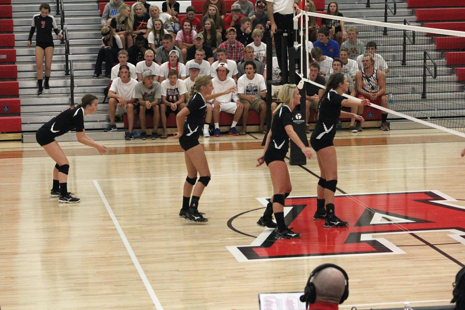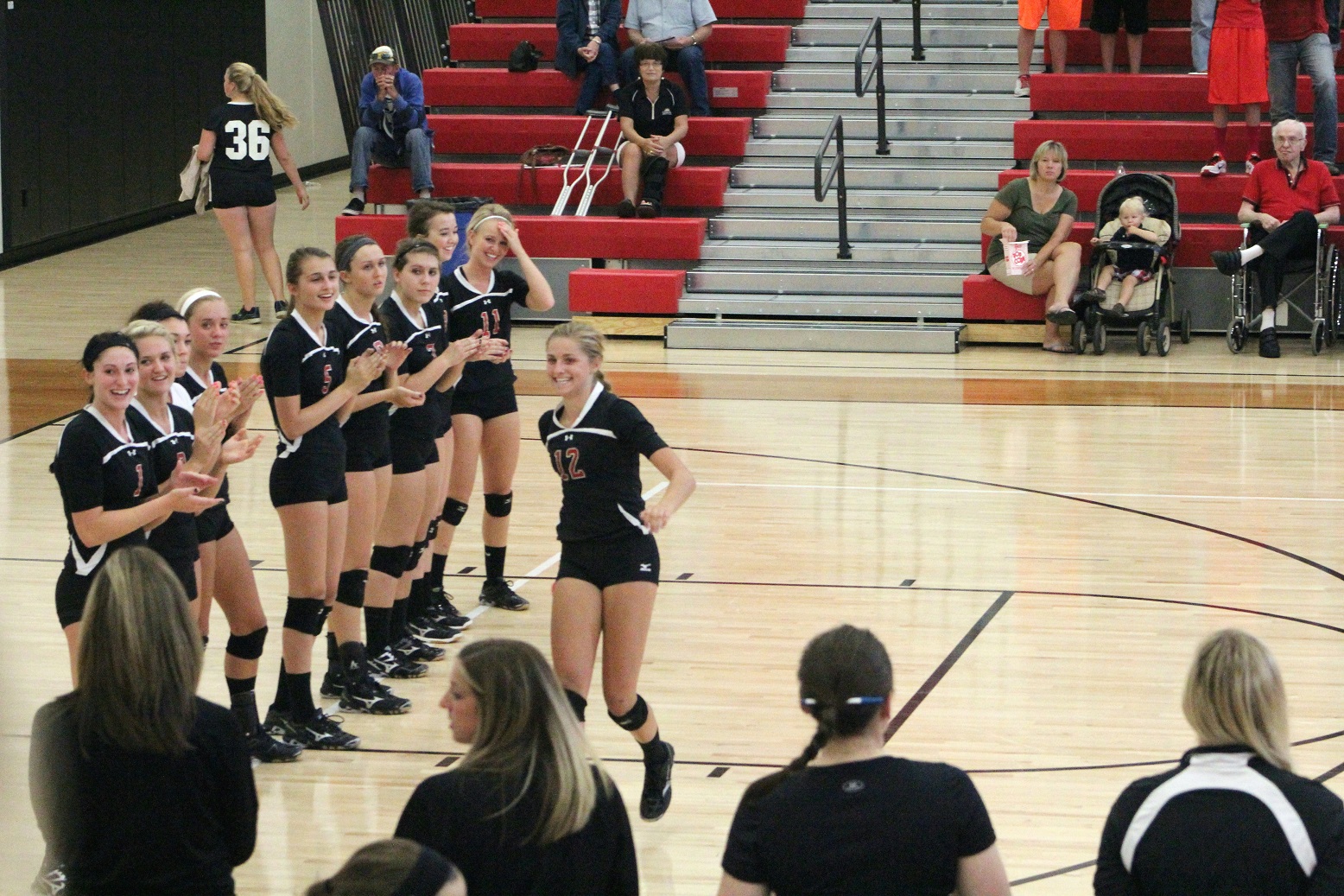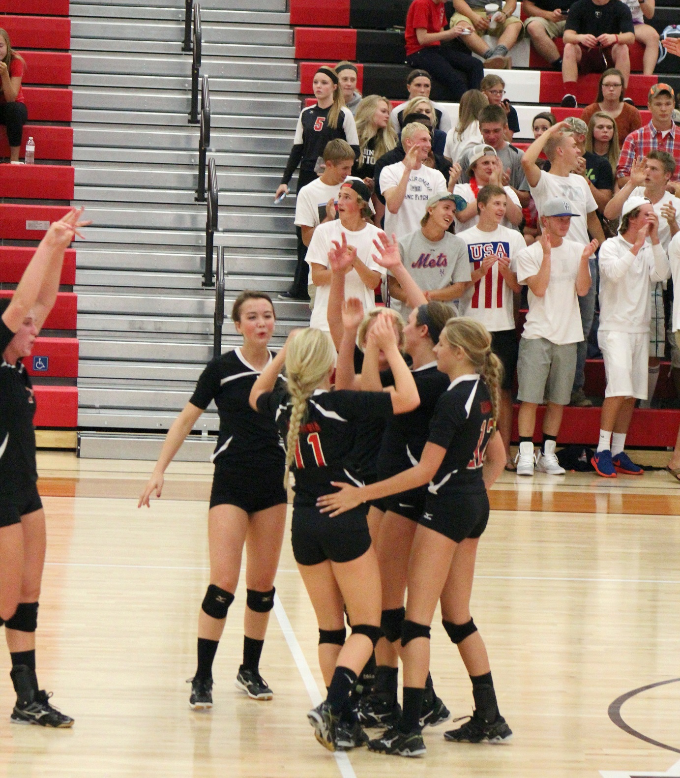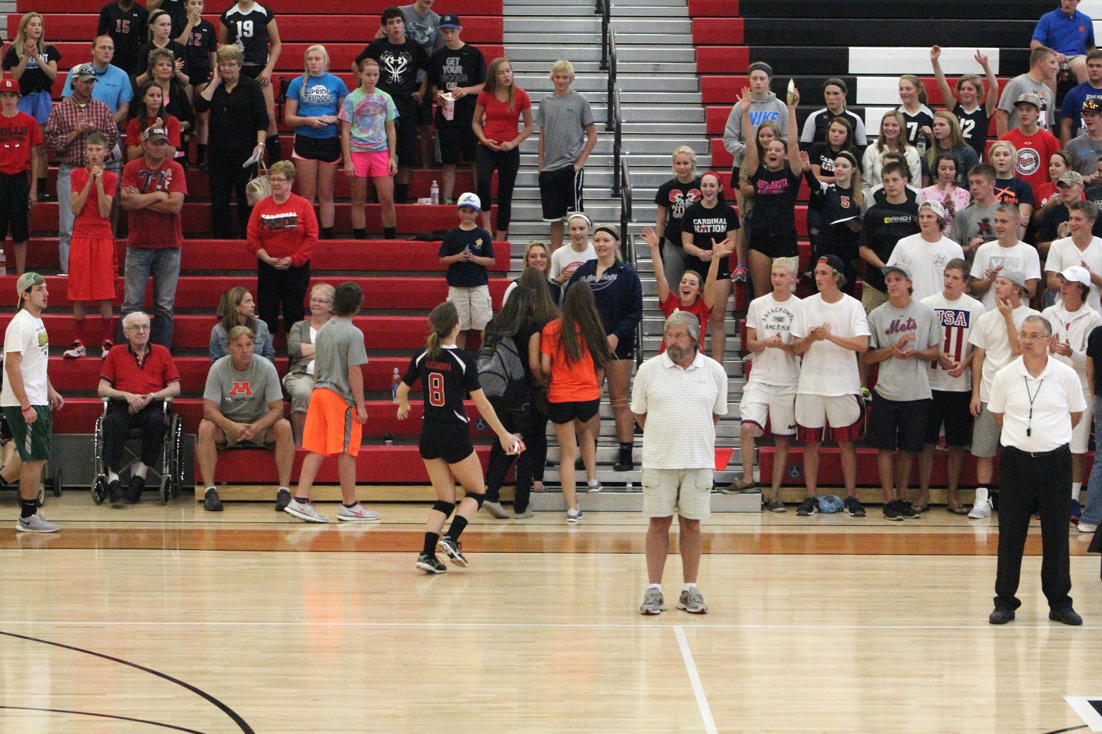 [Let’s celebrate our victory in game 3. We did that despite at one time having 4 straight service faults, and it would have been a 5th except the Spuds played a serve that was going long. This is a senior dominated team, led by the 3 up front all-arounders of Liz, Kalley, and Amanda; and the server/defenders, Gretchen and Katie. We need a few more players to step forward to help balance the team for consistency. Alexis may have done that on this night.]