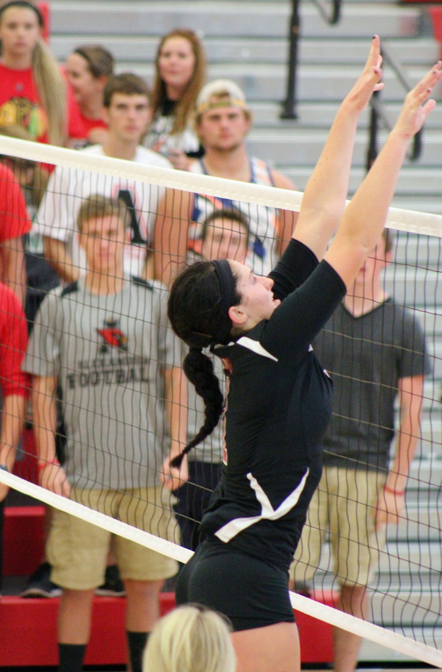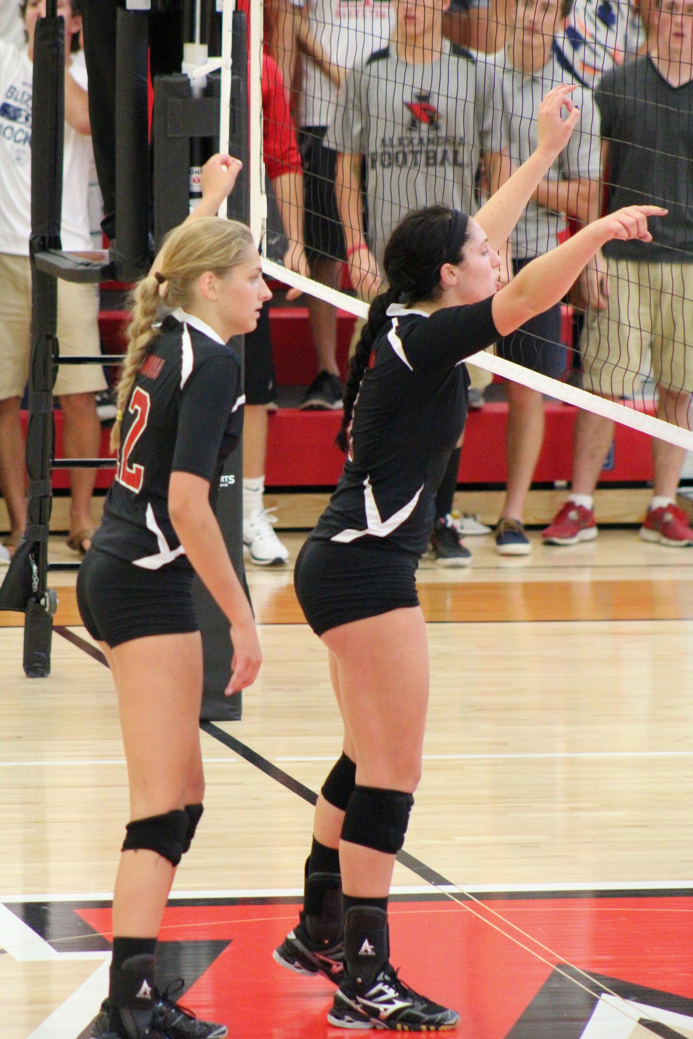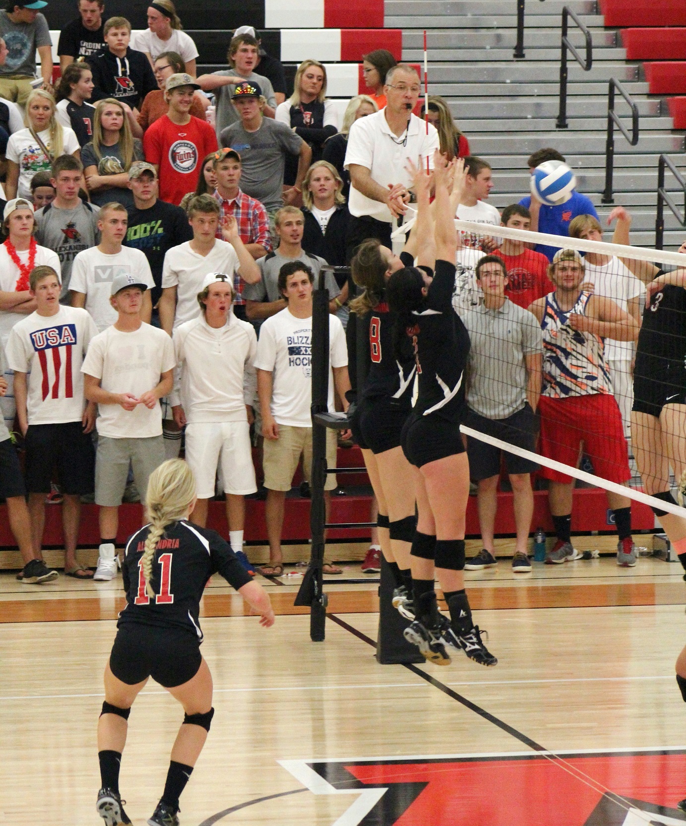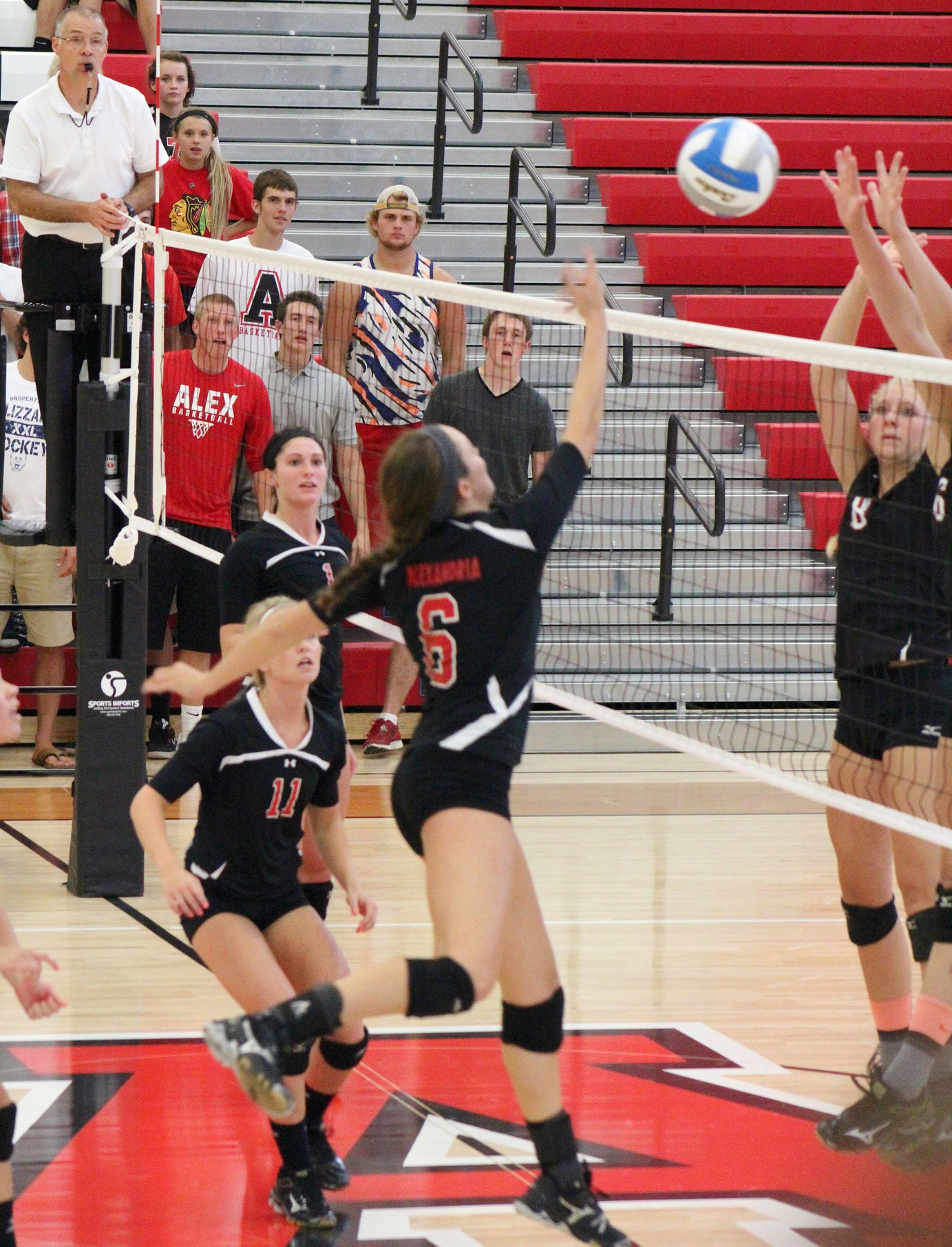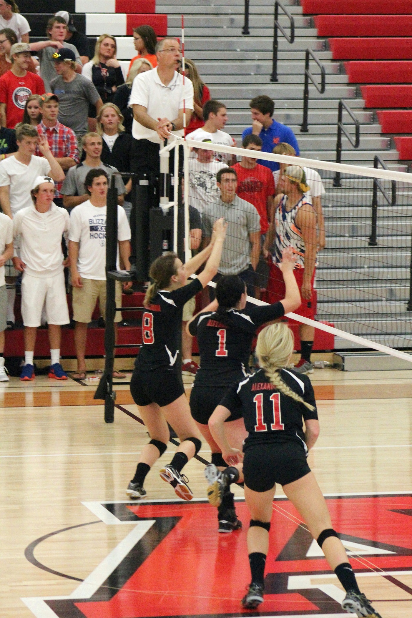 [Anatomy of a “stuff” point: 1) Alexis, Liz, and Amanda all slide left; 2) Alexis and Liz go up, Amanda awaits a “foul tip;” 3) – 5) Oh joy, we stuffed ’em!!]