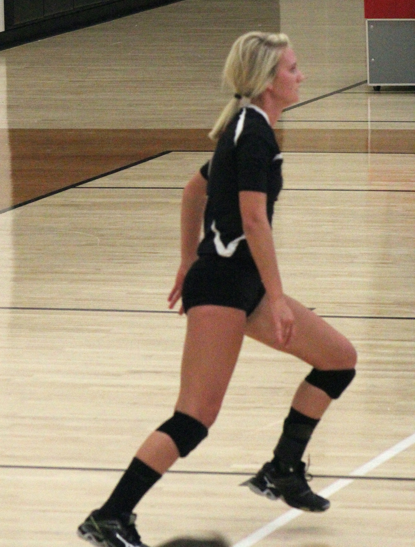 [Liz jump serves. And back from a starring role over the years at Jefferson – the blue garbage can! 🙂 ]