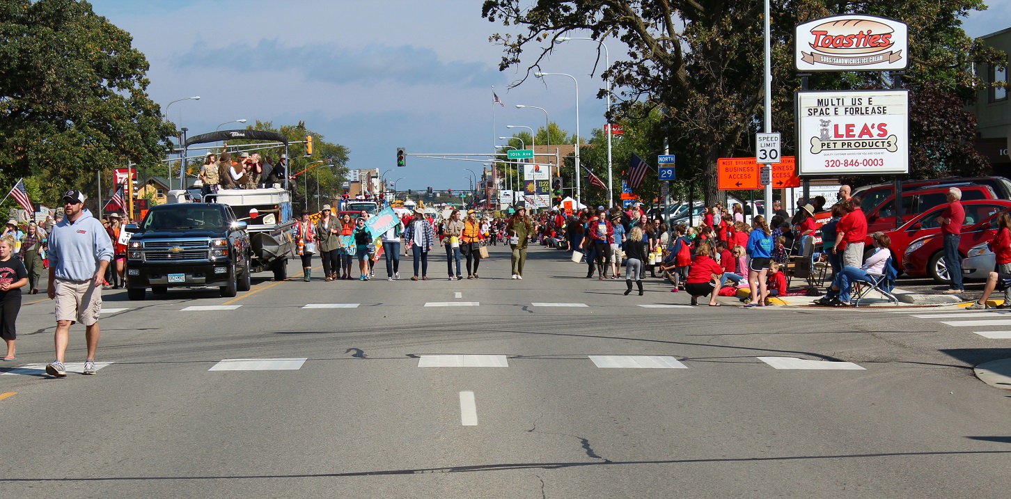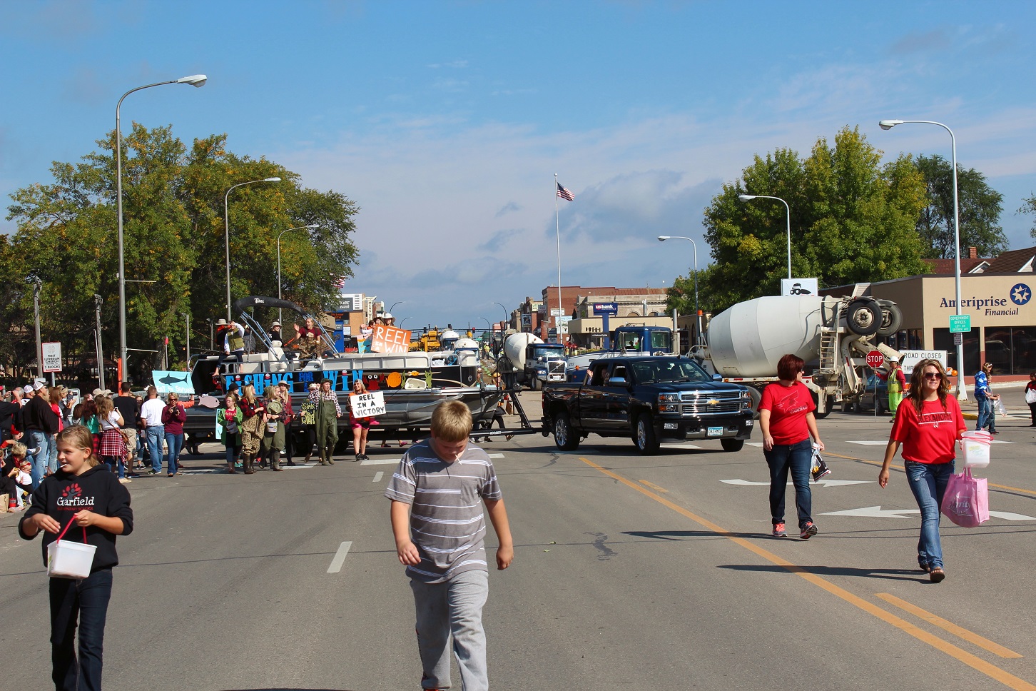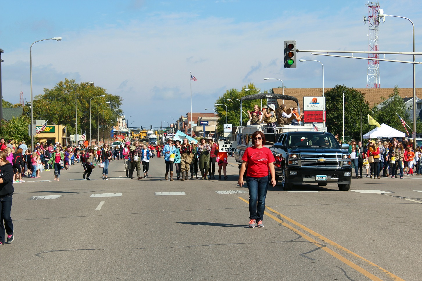 [We turned onto Broadway at 9th. Sara got to walk down the middle of our main drag probably for the first time since she played for the Alex marching band.]
