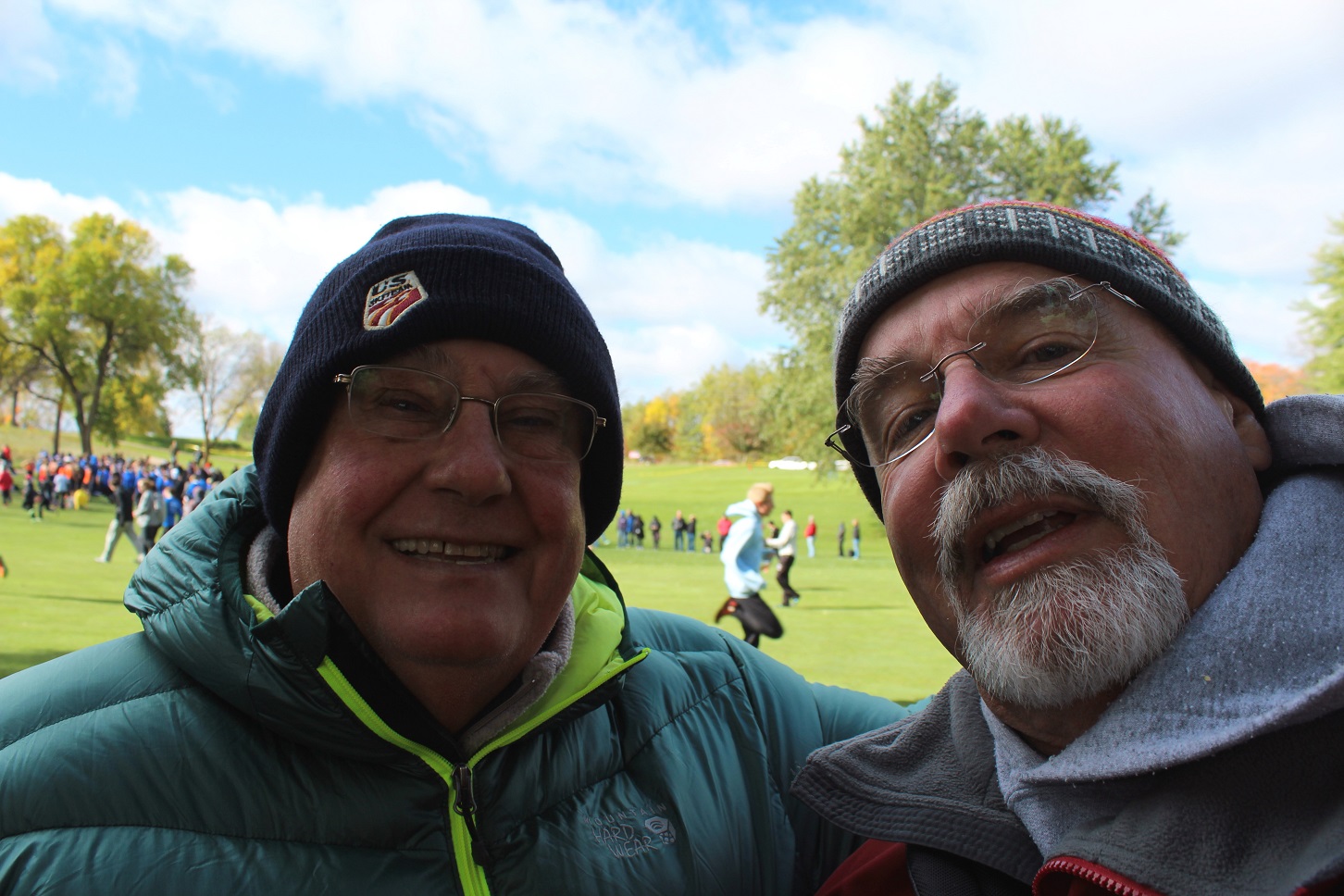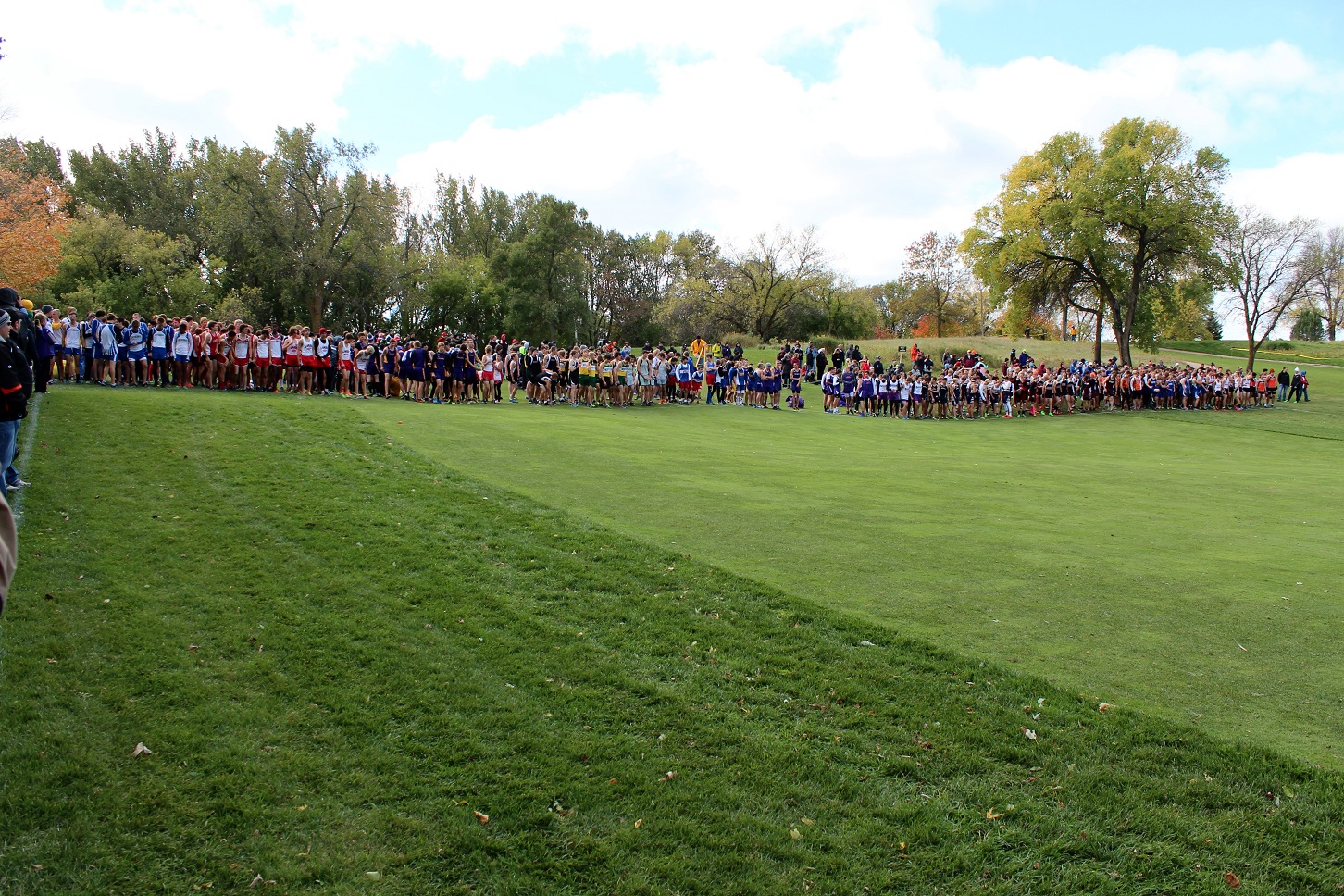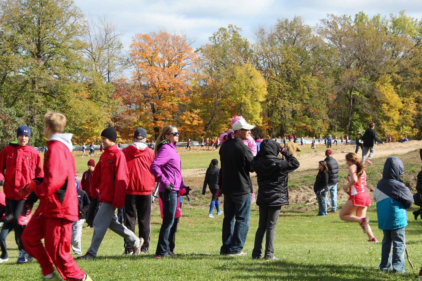 [One week after an 80-degree weekend, “Weakie” picked me up for the 42nd Lions Meet of Champions at Arrowwood Resort. 26 cross-country teams from all over the state participated. This is the line-up for the JV boys – I believe it was mentioned there were over 300 runners in just this race. There were 6 separate races, boys and girls at junior high, JV, and varsity levels. Oh, and I did I mention we were wearing parkas? I believe the wind chills may have been in the 20’s when this race began.