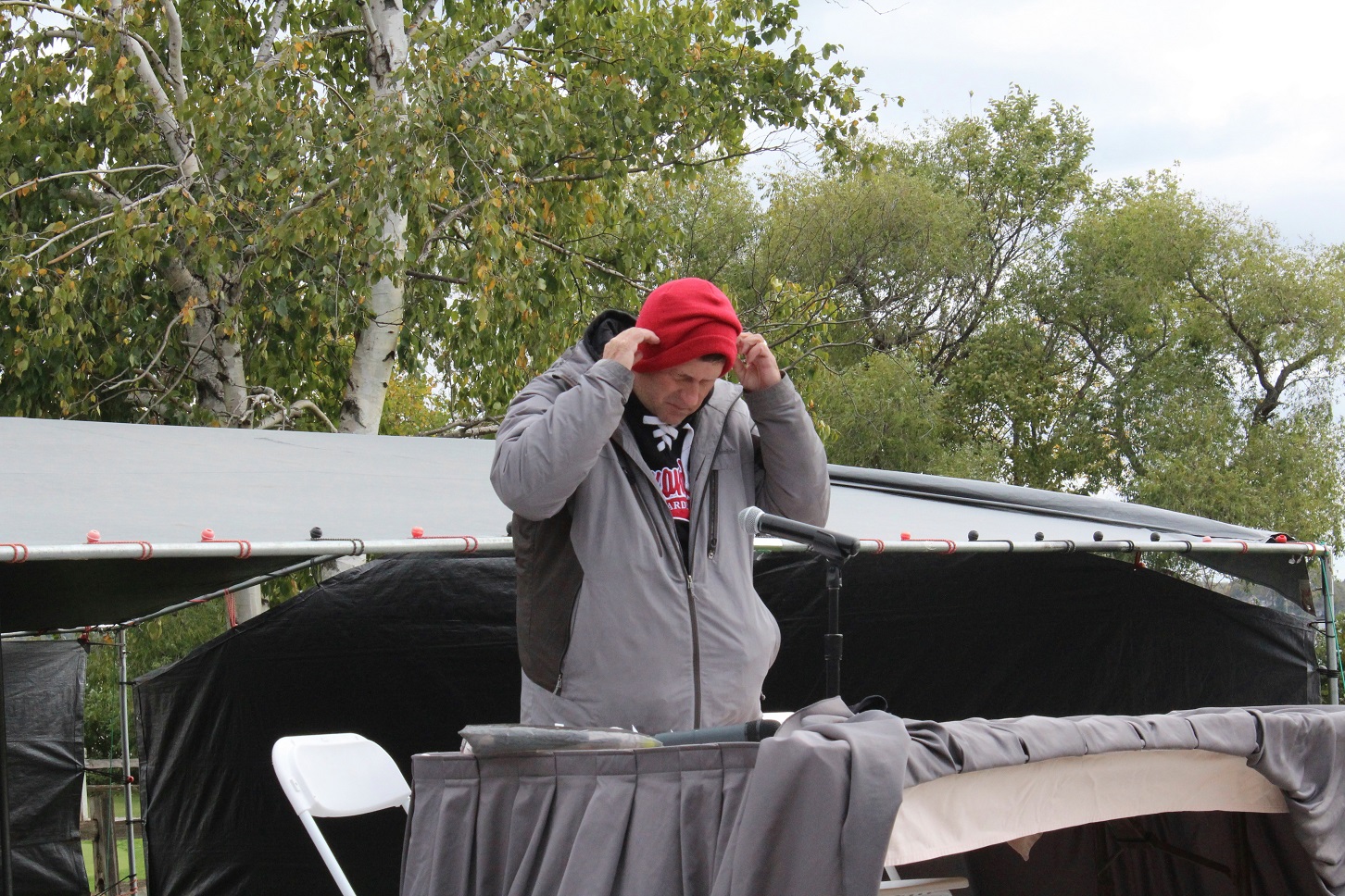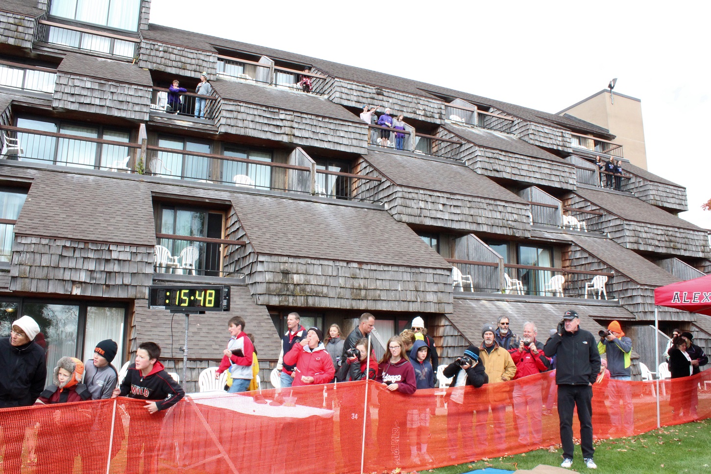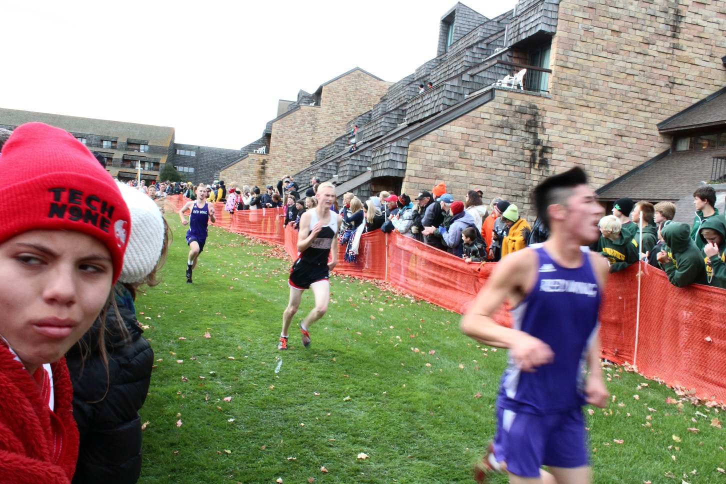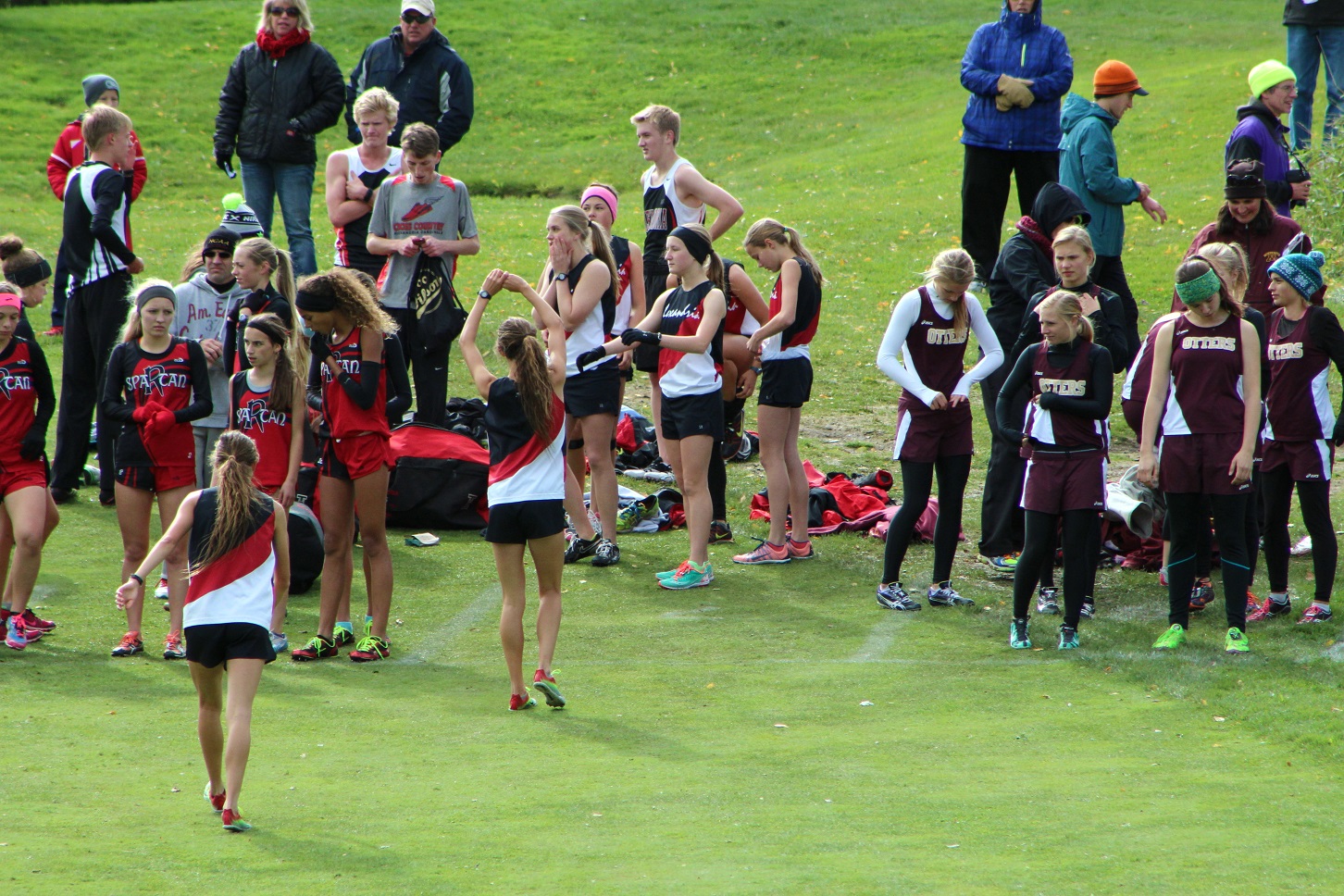 [One week after an 80-degree weekend, “Weakie” picked me up for the 42nd Lions Meet of Champions at Arrowwood Resort. 26 cross-country teams from all over the state participated. This is the line-up for the JV boys – I believe it was mentioned there were over 300 runners in just this race. There were 6 separate races, boys and girls at junior high, JV, and varsity levels. Oh, and I did I mention we were wearing parkas? I believe the wind chills may have been in the 20’s when this race began.