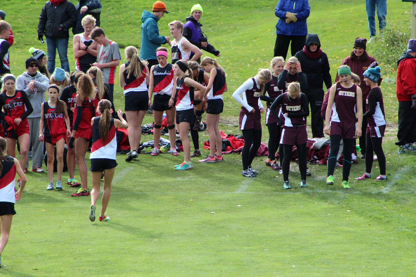 [We finally staggered to the starting line as the JV boys were assembling, in larger masses than the girls!]