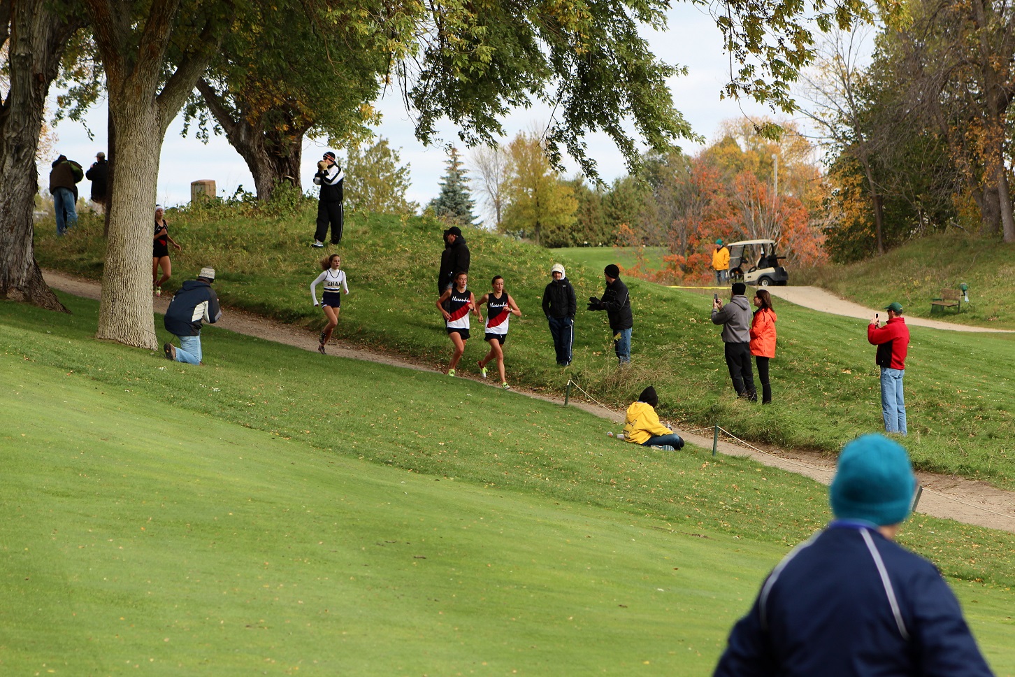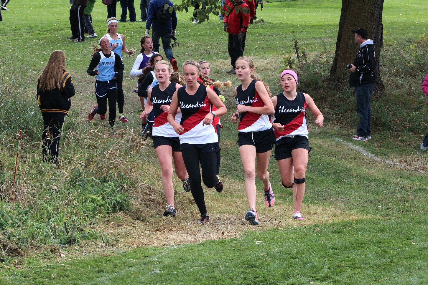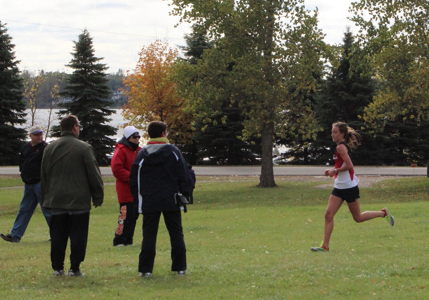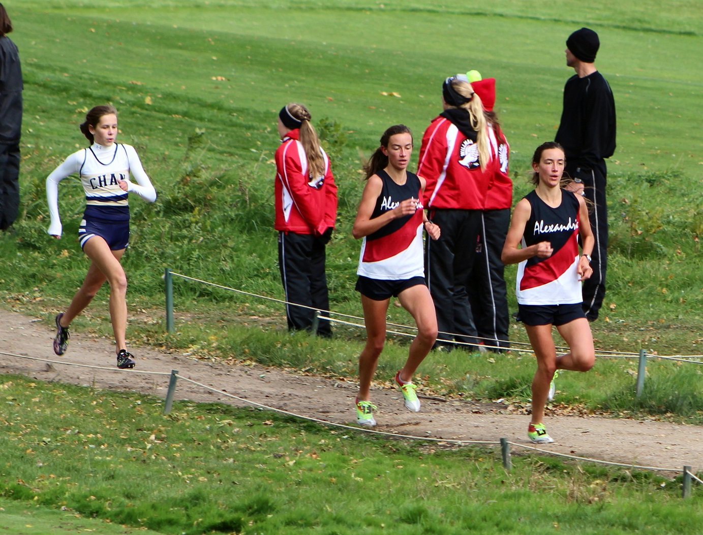 [The meet was to feature the top 3 runners in the state, the Hasz sisters and Jenna Trudeson from Bemidji. Trudeson decided not to run, so the next top ten runner in the field was from Chanhassen. Early on you could see those runners starting to separate from the field. The ultimate 3rd place finisher for team Alex, Allison O’Kane (I believe immediately above) held that position pretty much from the start as well.]