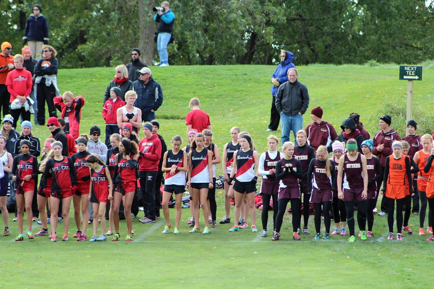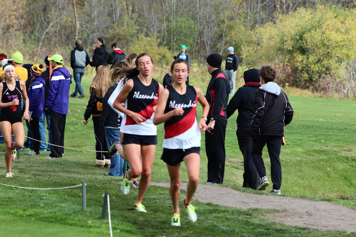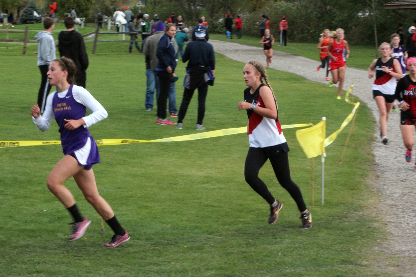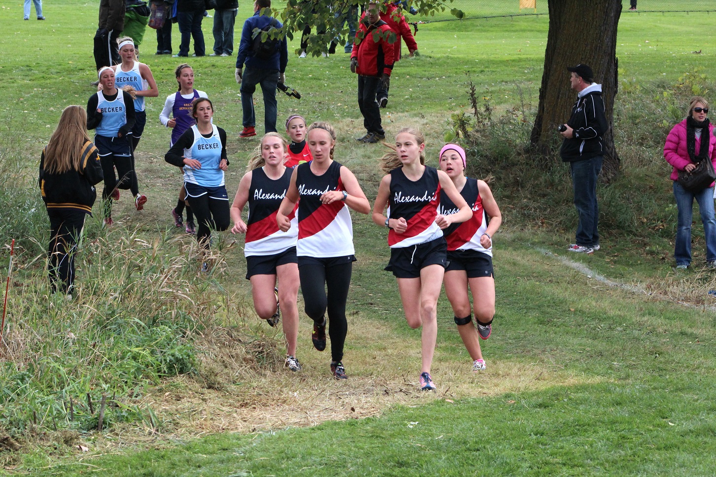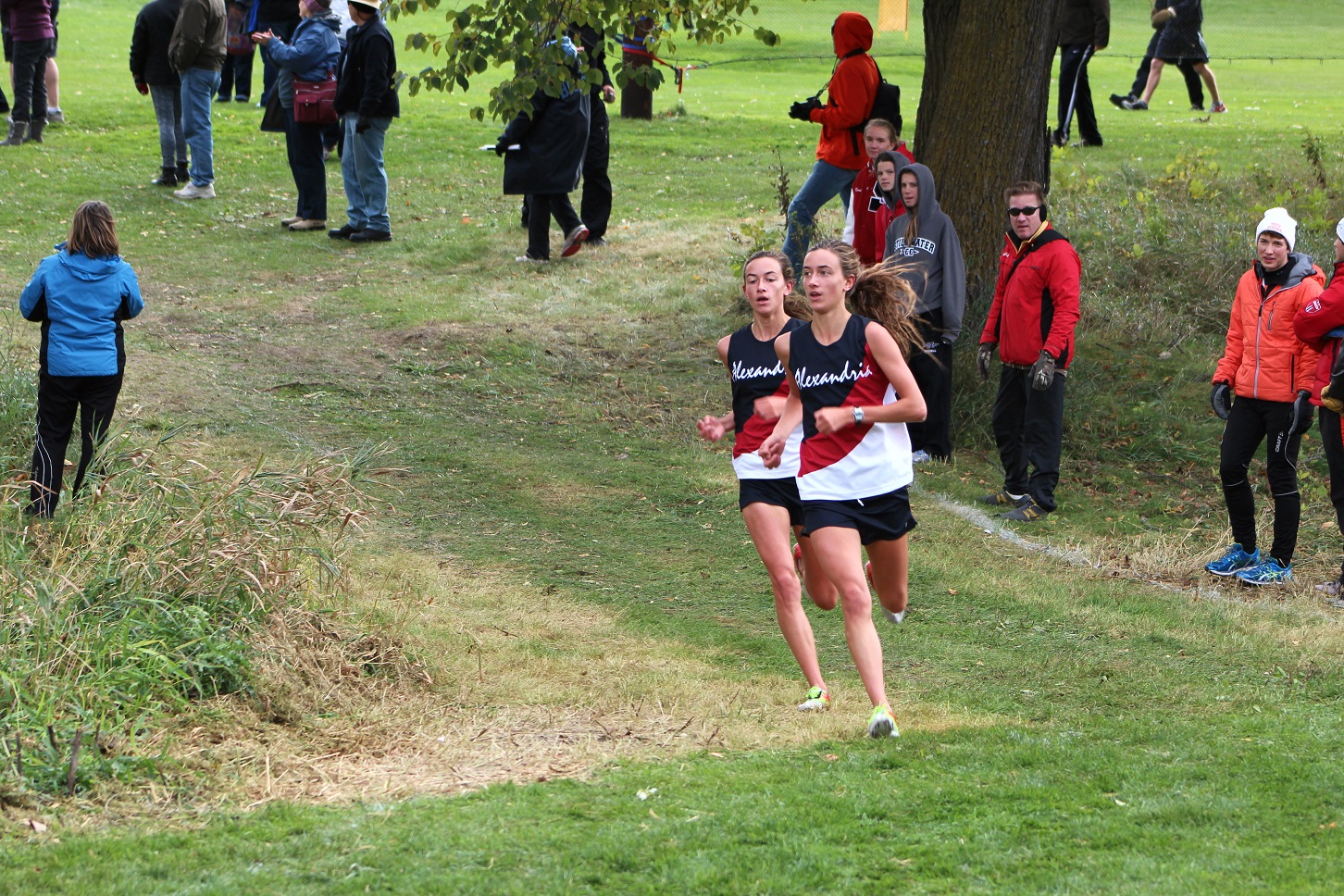 [The meet was to feature the top 3 runners in the state, the Hasz sisters and Jenna Trudeson from Bemidji. Trudeson decided not to run, so the next top ten runner in the field was from Chanhassen. Early on you could see those runners starting to separate from the field. The ultimate 3rd place finisher for team Alex, Allison O’Kane (I believe immediately above) held that position pretty much from the start as well.]