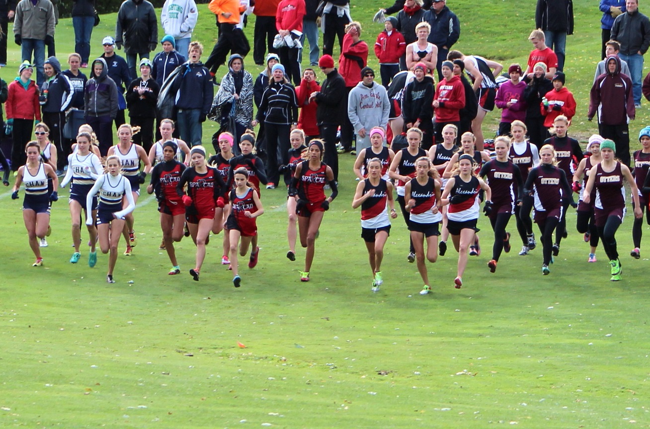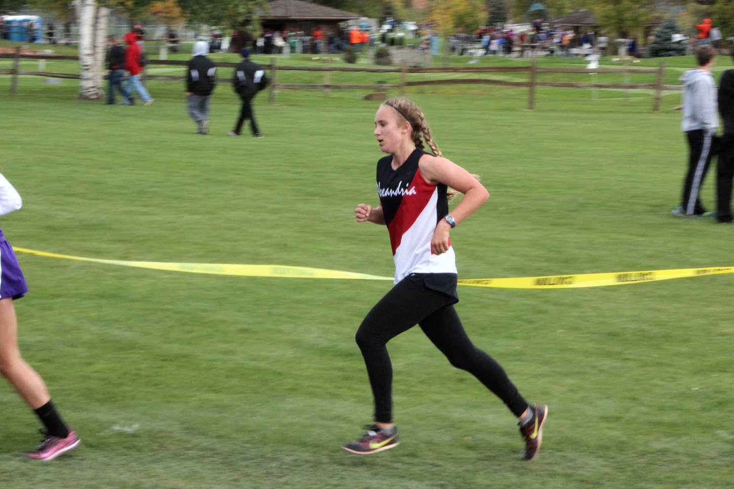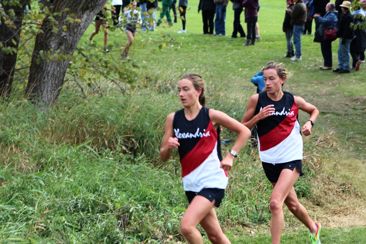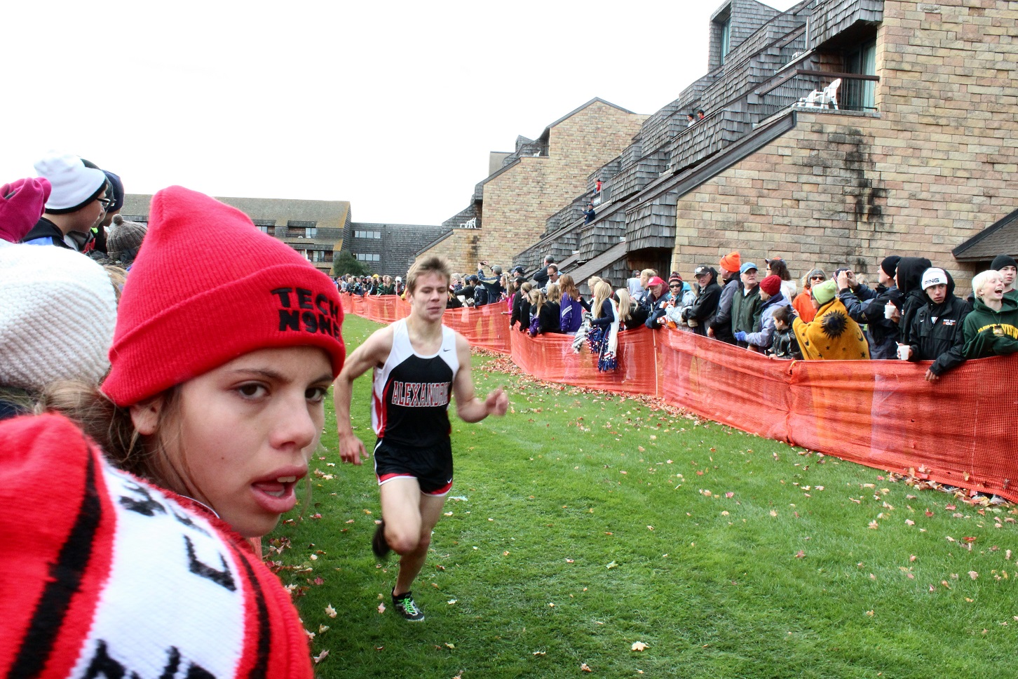 [The meet was to feature the top 3 runners in the state, the Hasz sisters and Jenna Trudeson from Bemidji. Trudeson decided not to run, so the next top ten runner in the field was from Chanhassen. Early on you could see those runners starting to separate from the field. The ultimate 3rd place finisher for team Alex, Allison O’Kane (I believe immediately above) held that position pretty much from the start as well.]