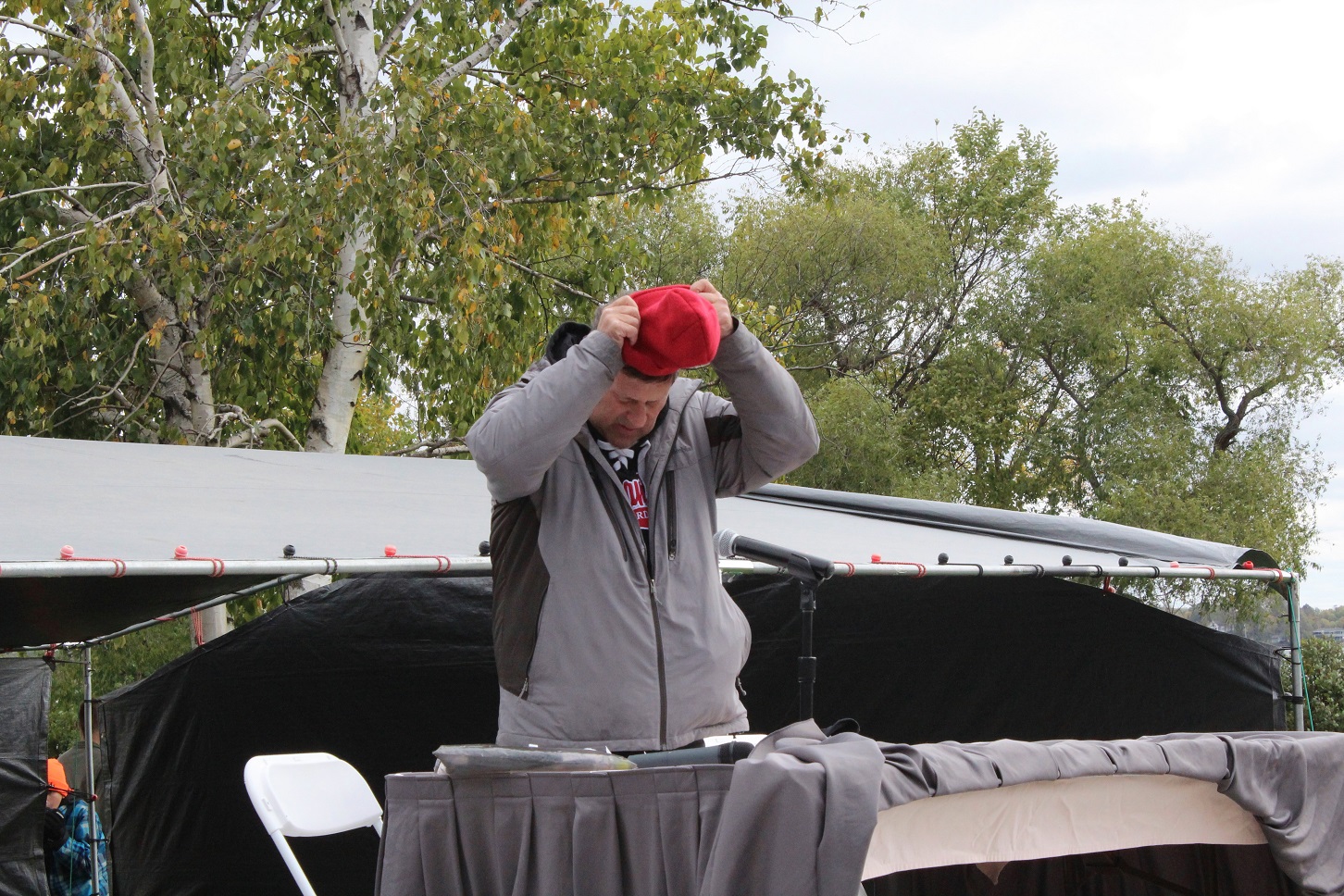 [Jerry Hansen of the Lions assists the emcee for trophy presentations.]