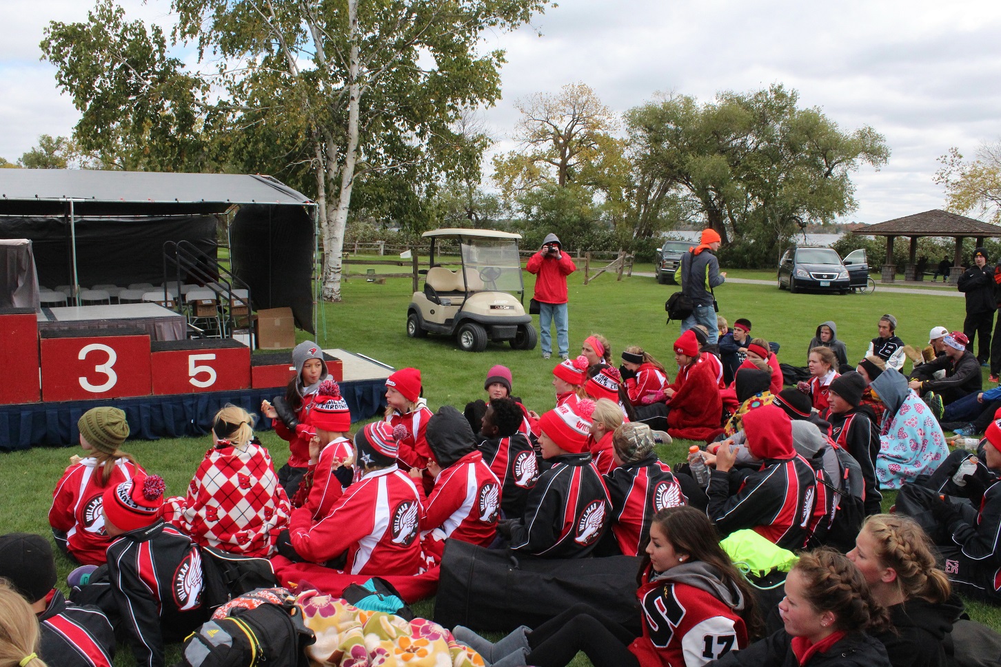 [Meanwhile, back at the cross-country awards ceremony, the participants group together for warmth like walruses.]