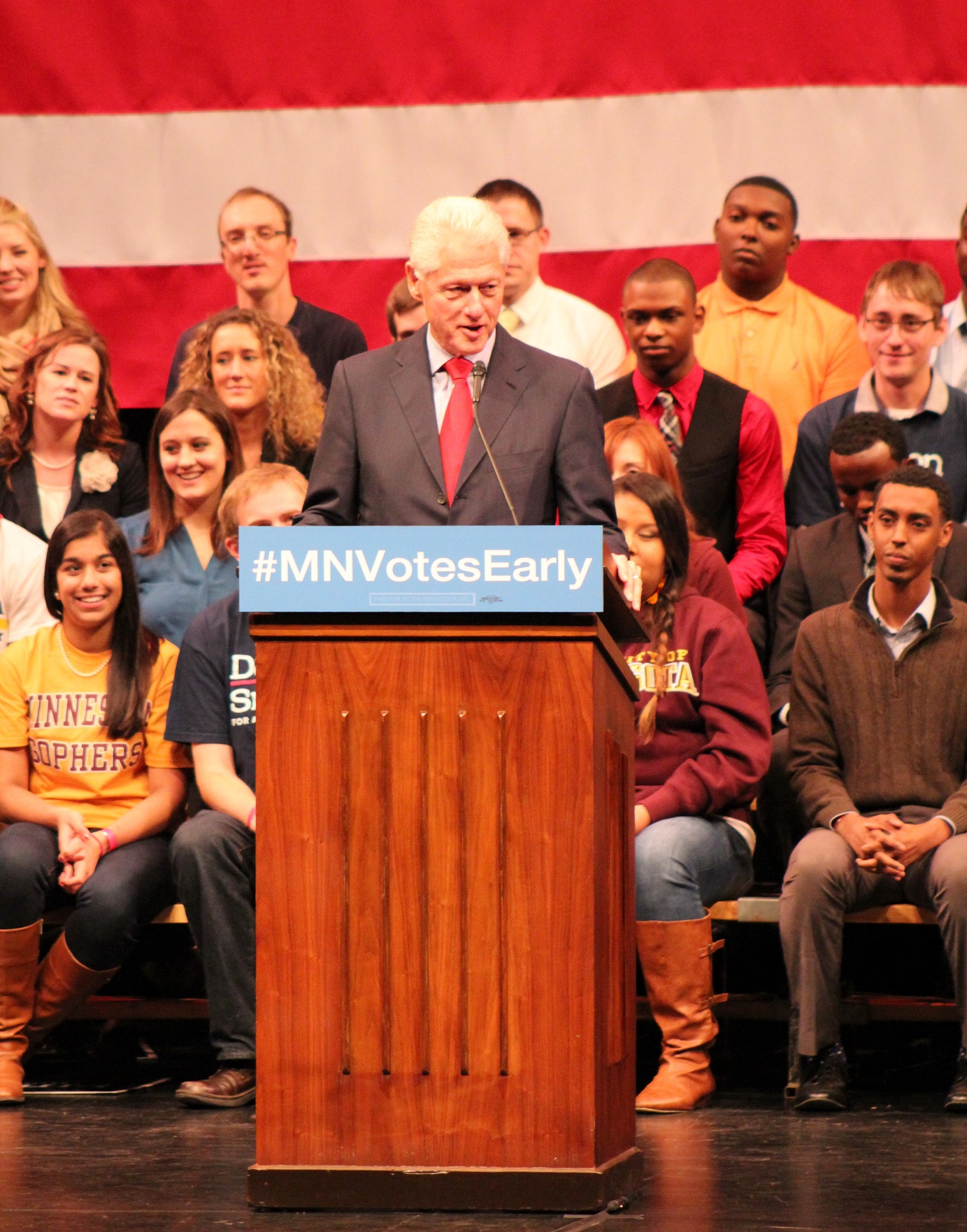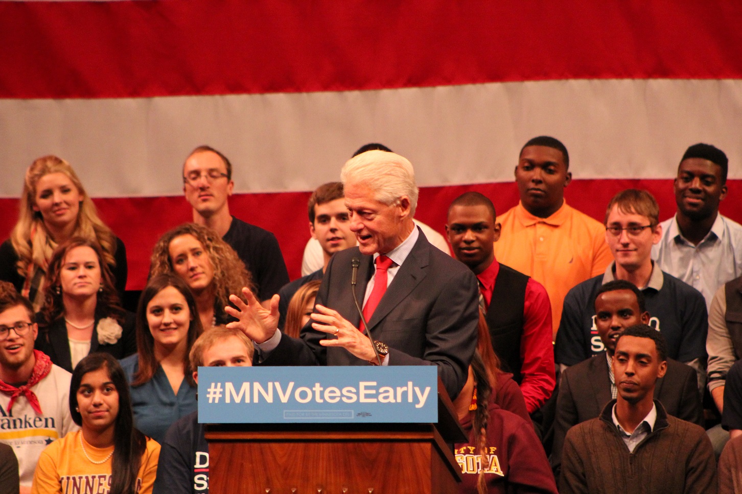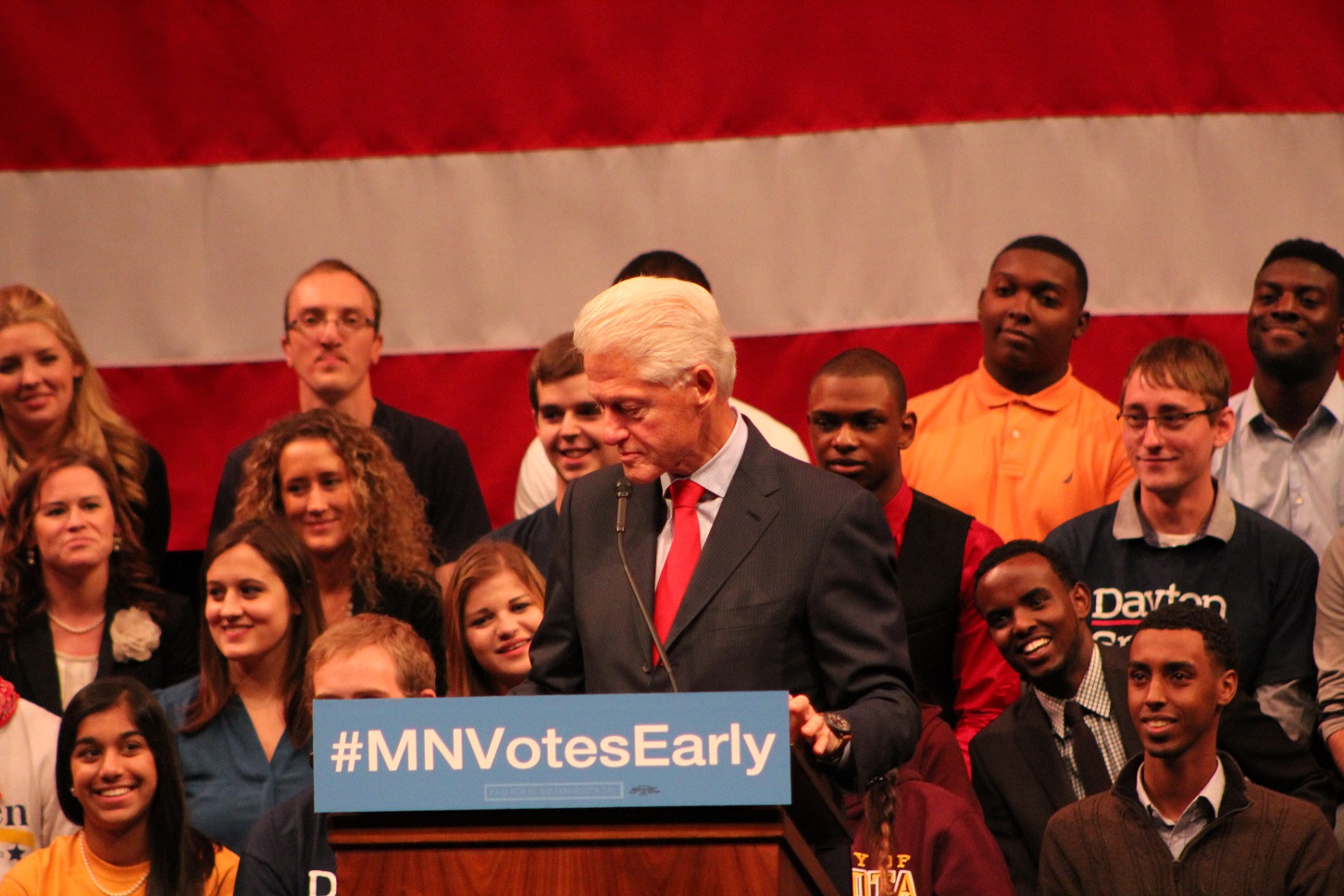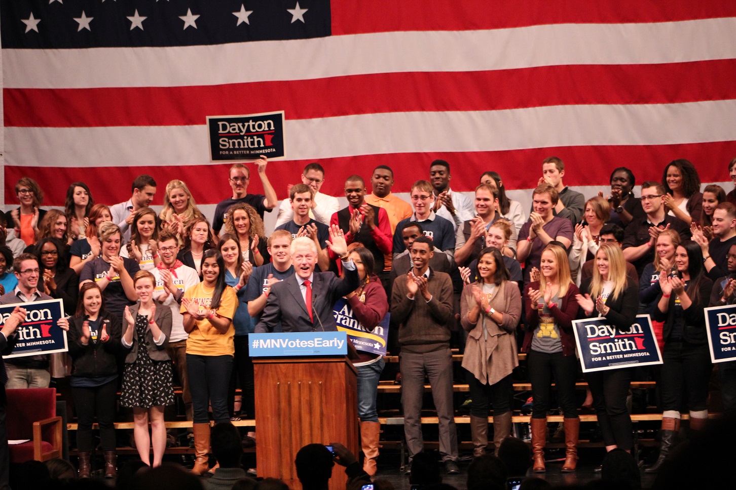 [We arrived early – by about two hours – to stand in line for the advertised appearances of Governor Mark Dayton, Senator Al Franken, and President William Jefferson Clinton. Although Clinton was my boss for eight years, I don’t recall ever seeing him live? And while standing in line, I noticed my cousin Barb Arrell, a St. Paulite, a couple groups behind us.]
