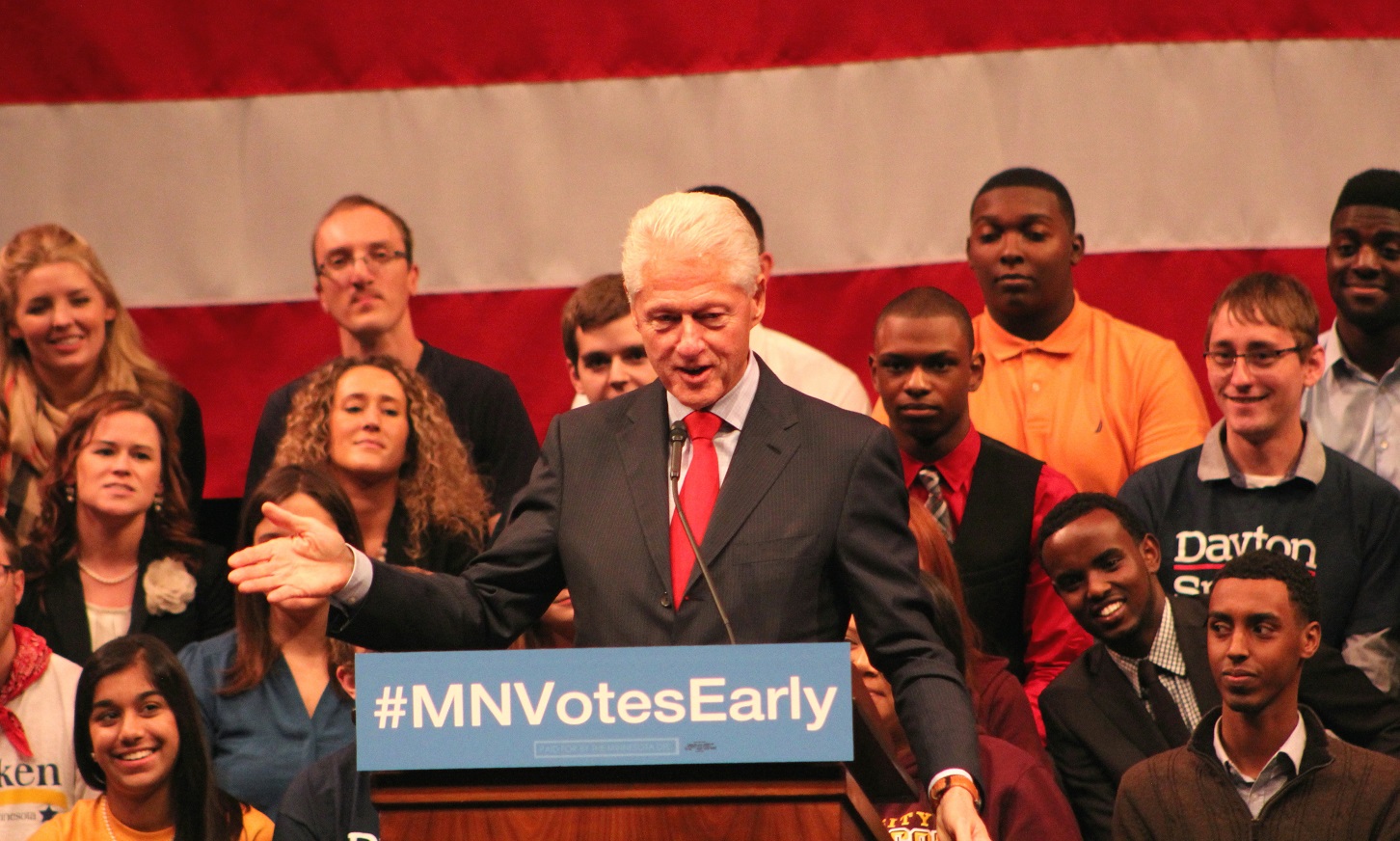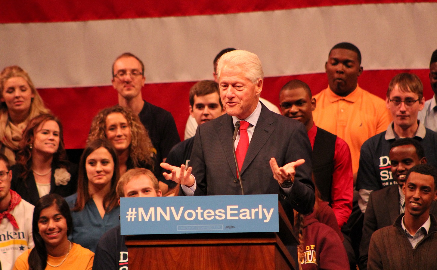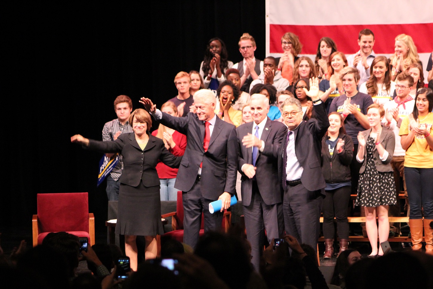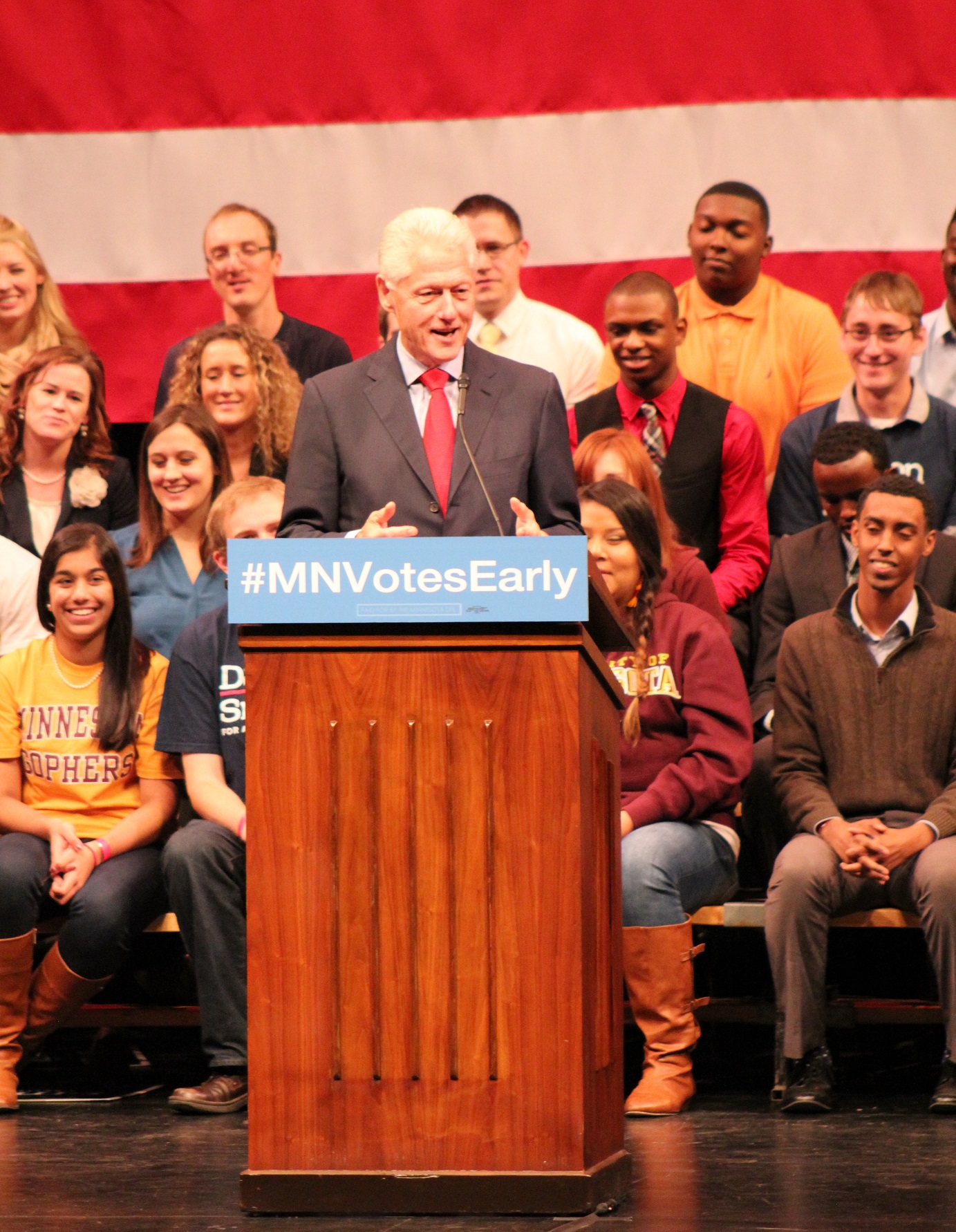 [We arrived early – by about two hours – to stand in line for the advertised appearances of Governor Mark Dayton, Senator Al Franken, and President William Jefferson Clinton. Although Clinton was my boss for eight years, I don’t recall ever seeing him live? And while standing in line, I noticed my cousin Barb Arrell, a St. Paulite, a couple groups behind us.]