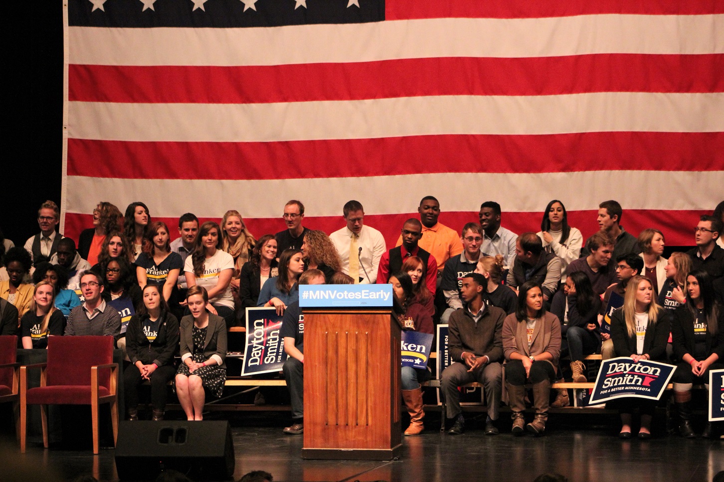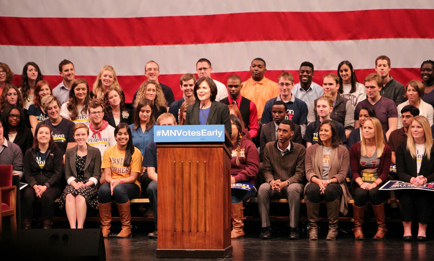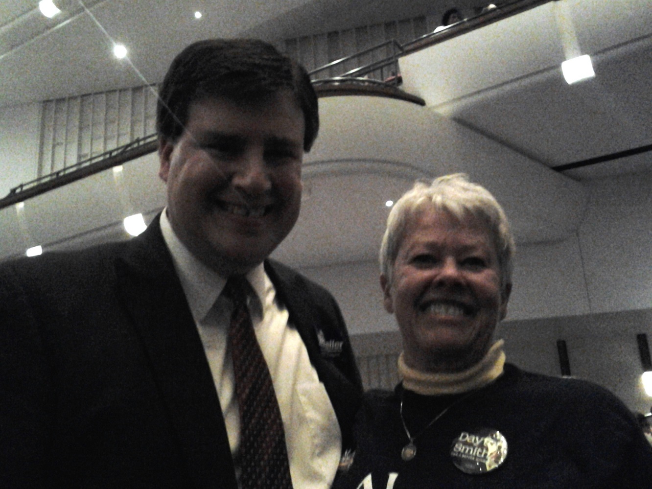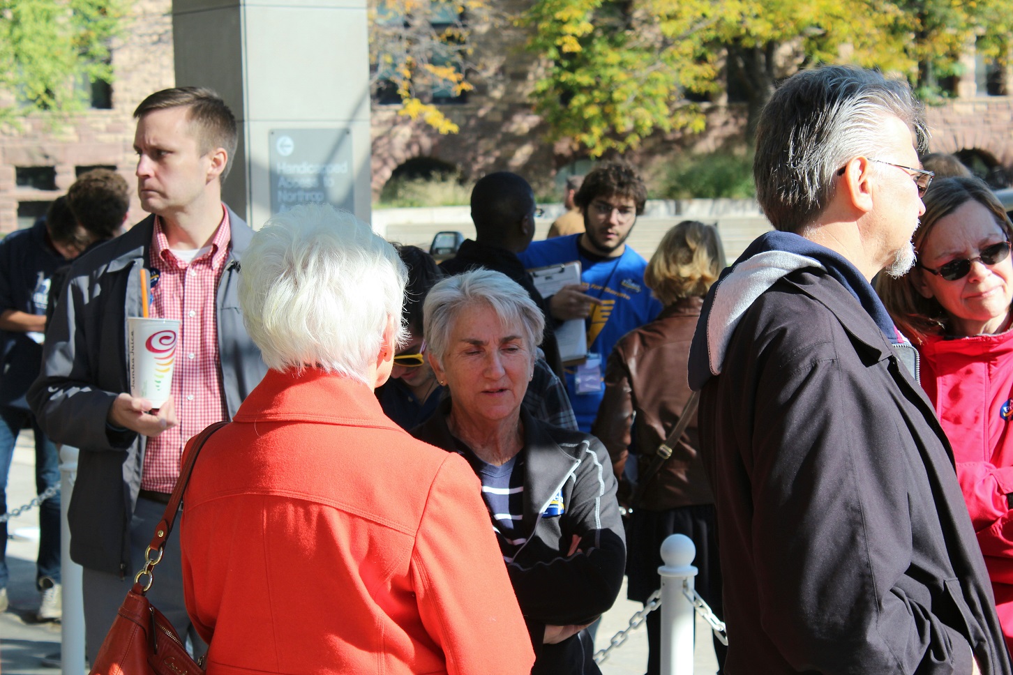 [We arrived early – by about two hours – to stand in line for the advertised appearances of Governor Mark Dayton, Senator Al Franken, and President William Jefferson Clinton. Although Clinton was my boss for eight years, I don’t recall ever seeing him live? And while standing in line, I noticed my cousin Barb Arrell, a St. Paulite, a couple groups behind us.]
