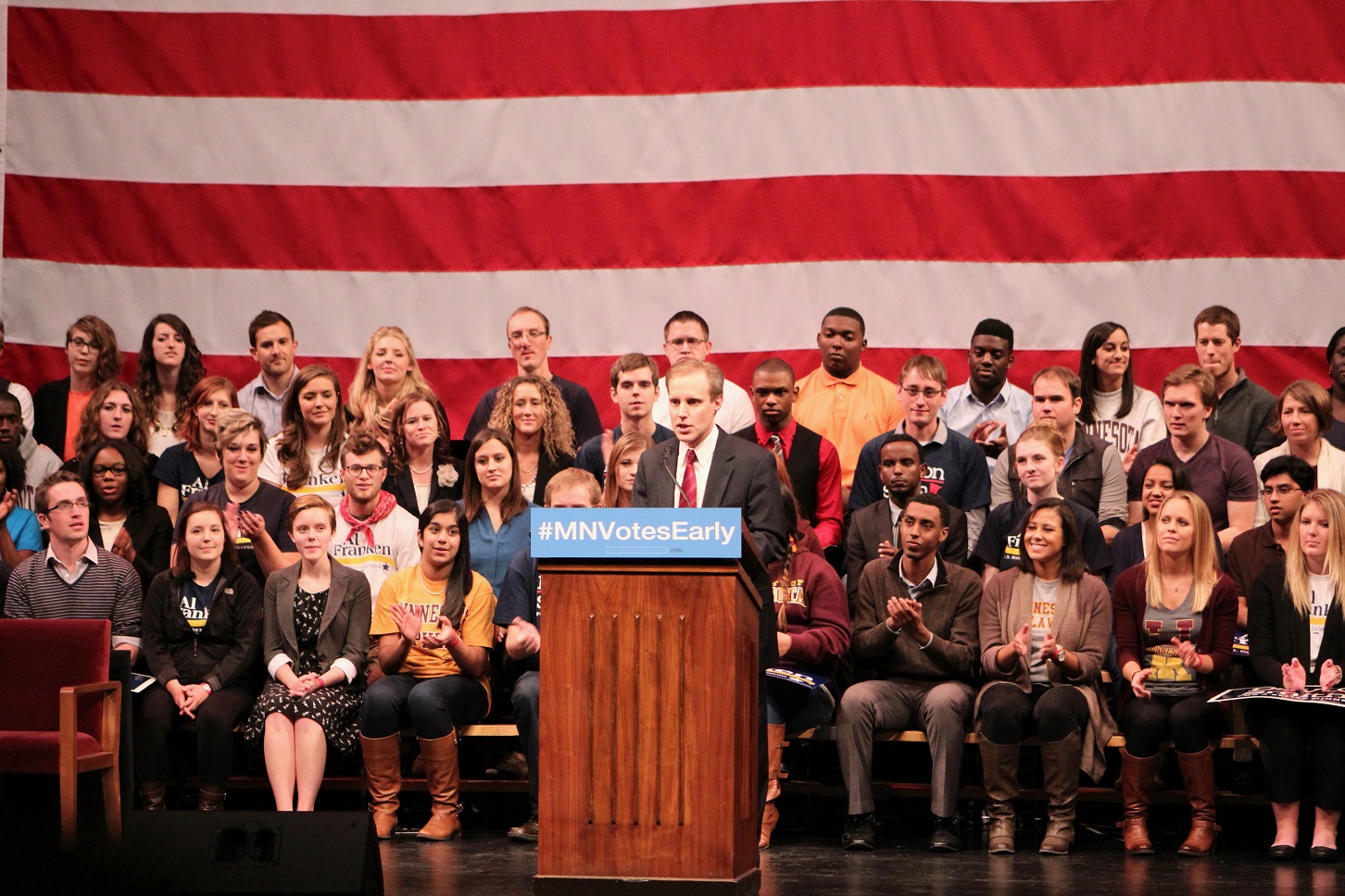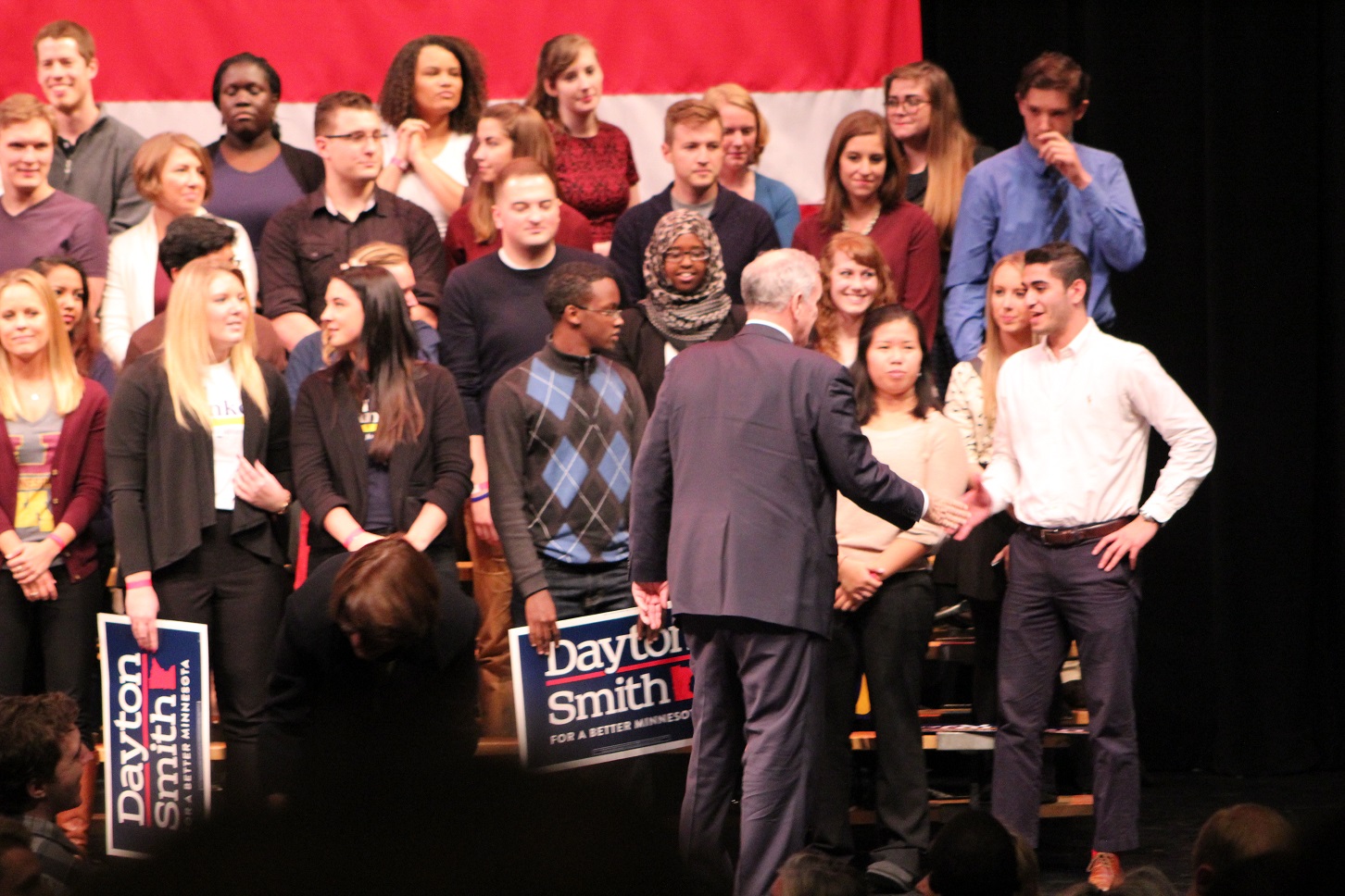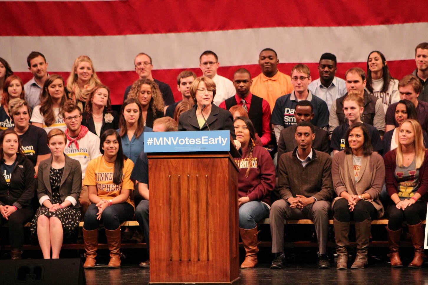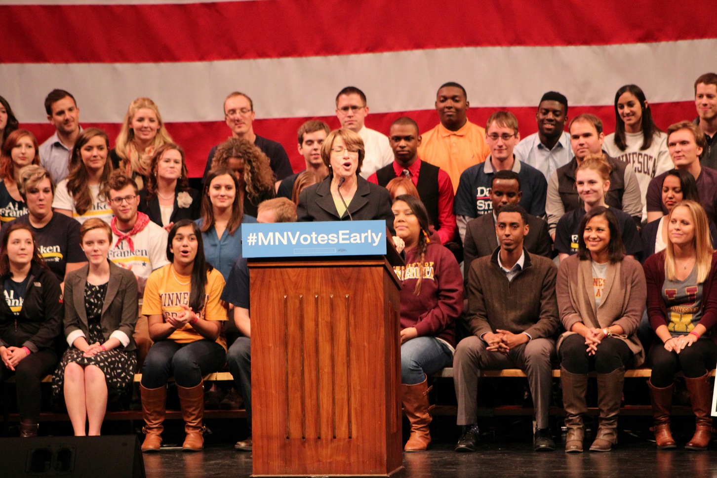 [We arrived early – by about two hours – to stand in line for the advertised appearances of Governor Mark Dayton, Senator Al Franken, and President William Jefferson Clinton. Although Clinton was my boss for eight years, I don’t recall ever seeing him live? And while standing in line, I noticed my cousin Barb Arrell, a St. Paulite, a couple groups behind us.]