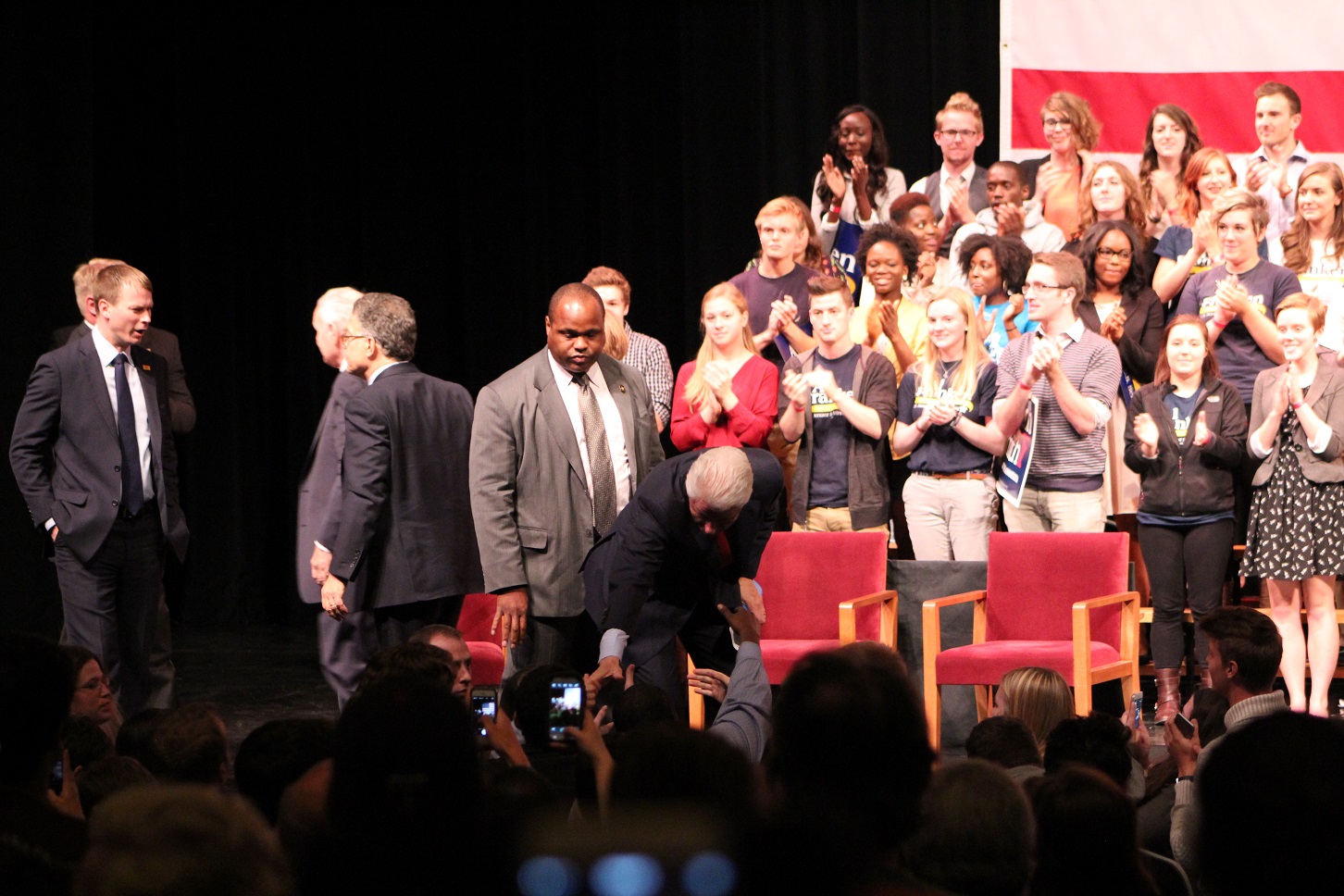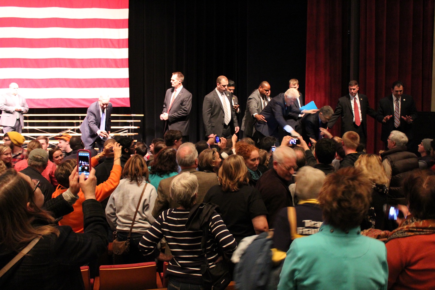 [The President in a rapidly evolving mosh pit. Cousin Barb in the black and white stripes is making her way forward.]