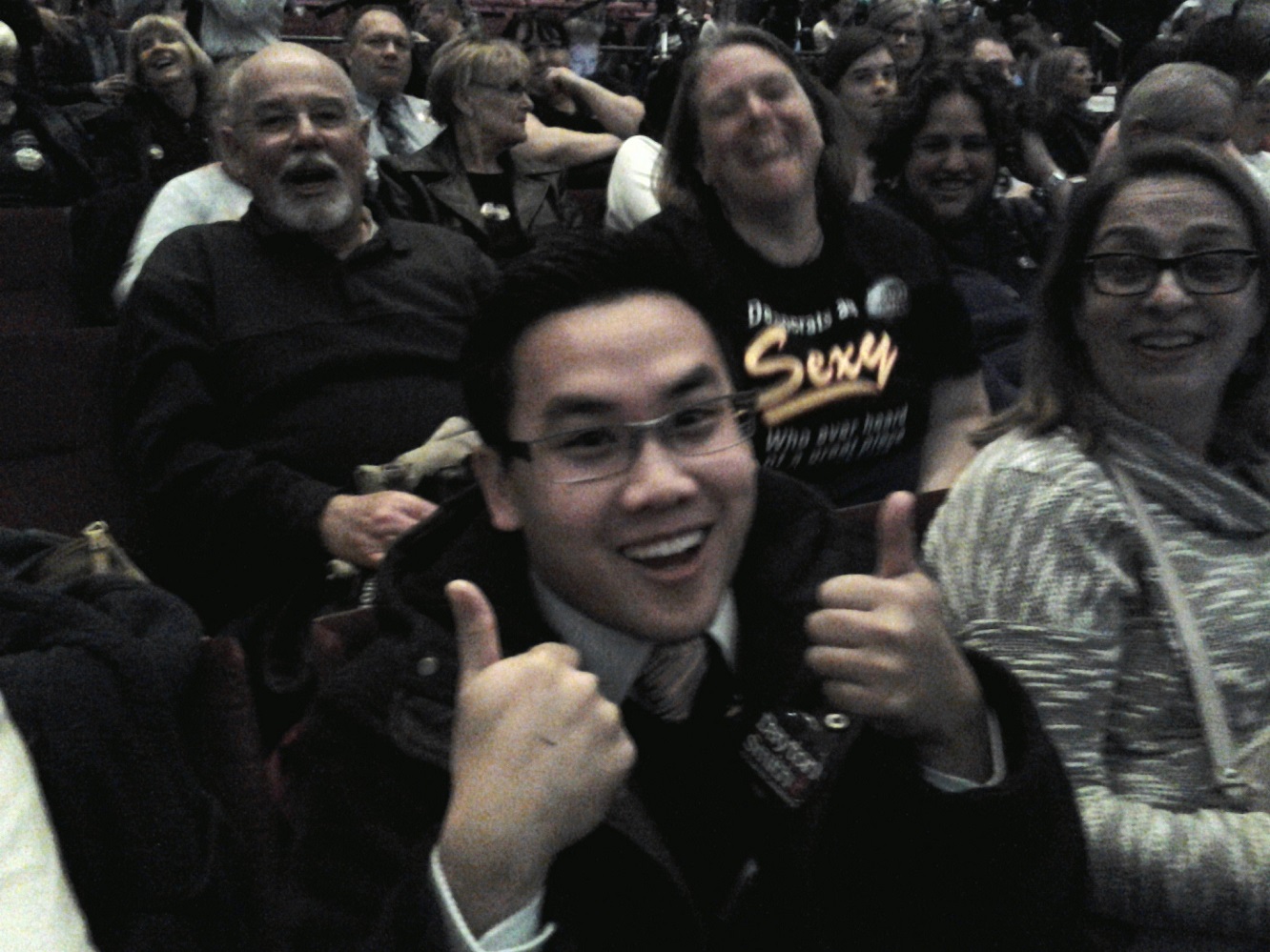 [Barb is fighting her way in – this is the best shot I got. I was being jostled, lost a lens cap (found trampled on the floor), but I did see Barb stretch out and shake the President’s hand as I was being pummeled to the floor. I’d lost track of Jami and the super in the crowd – Jami reported she got to shake Franken’s hand, the super said she got a salute and a big smile from him! 🙂 ]