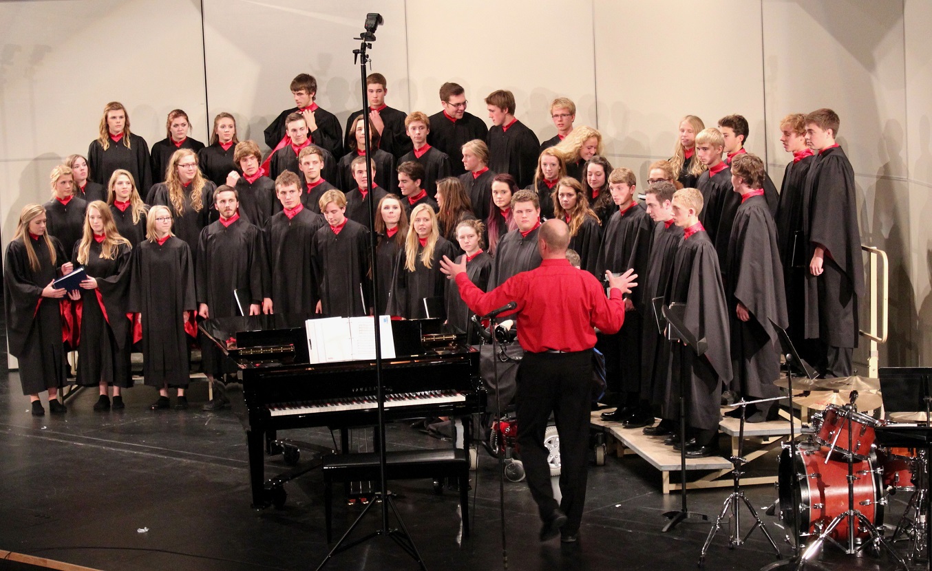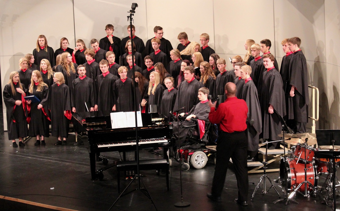 [Now the “to be explained . . .” part. That’s Mark Ripley. You may recognize him as “The Competition” in many previous posts. He’s the school’s photographer/media guy. He has retired twice but keeps coming back because . . . he loves the job and the kids, and he wanted to be part of the new school. Oh, as for the multiple shots of the choirs, the Amazing Mr. Ripley was having them all pose for the official school pictures, as long as they were all there and in “uniform.” I was sitting next to his set-up when I first arrived, but as “the regular crowd shuffled in” I could see I was going to have sight line problems for my photographic efforts. So I moved to where Ruthie and I sat for the first Central Lakes Concert Association event. The 2nd CLCA concert is tonight but the supervisor will go with Jami as I “have” to cover the first football section playoff game on the other side of the building.]