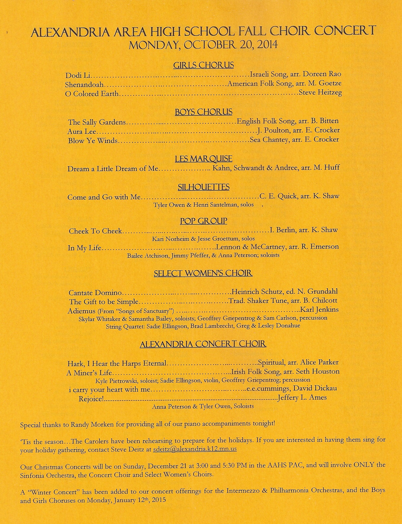 [Last night was the high school fall choir concert, the first school event to take place in the new auditorium. I was there because . . . well, it’s my job. As usual I had the wrong time and arrived a half hour early. As I entered the building I was nearly run down by a young lady who may have been all of 5-feet tall and 80 pounds barreling down the hall barefooted while lifting her black dress as to not impede her speed. If she would have hit me, I may have ended up in Miltona. The football coaches have been duly notified of this prospect.]