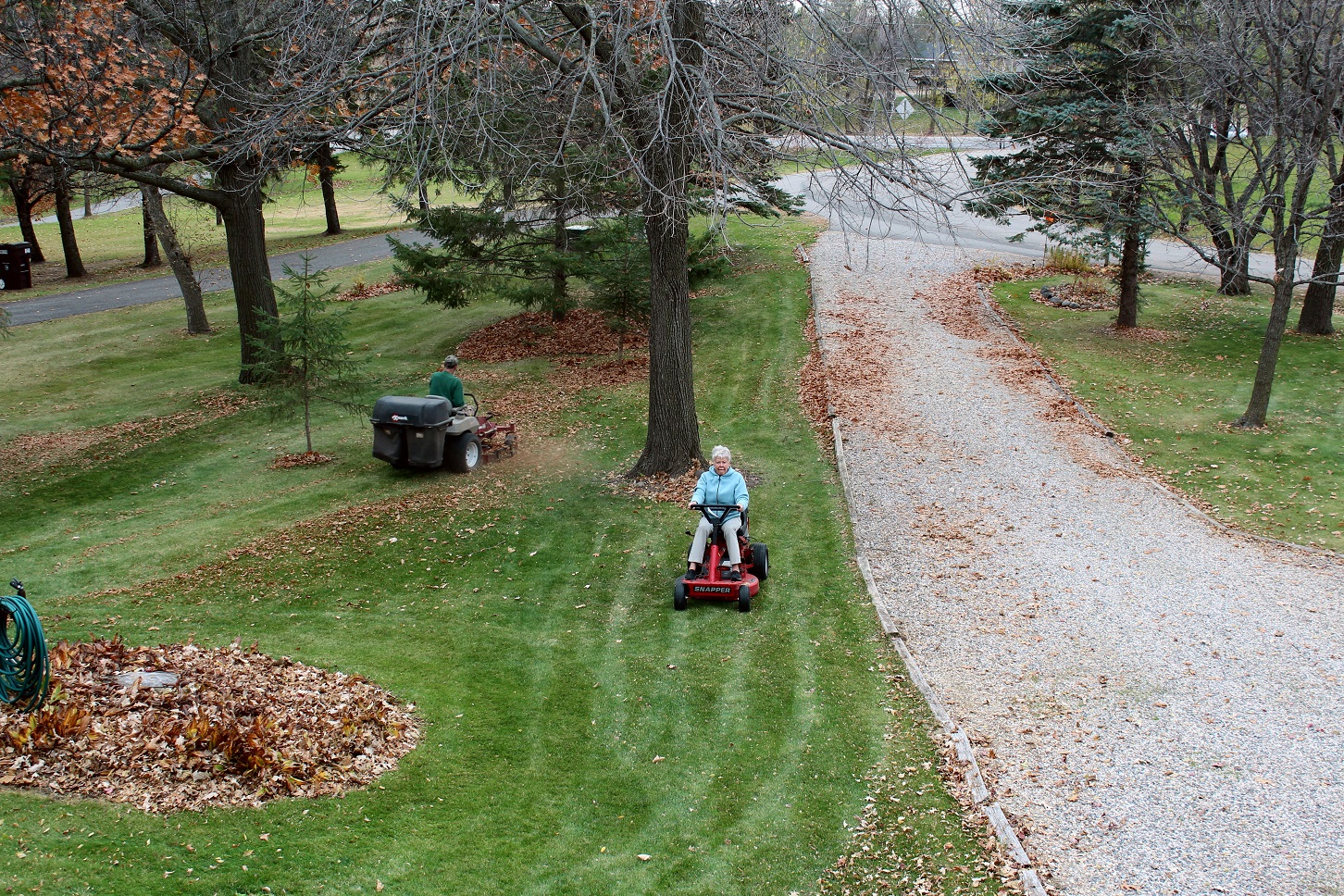 [When the trees went bare, neighbor Arnie came over and helped the supervisor double-team the leaves and make the final mow.]
