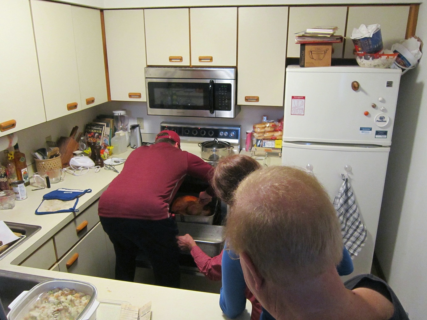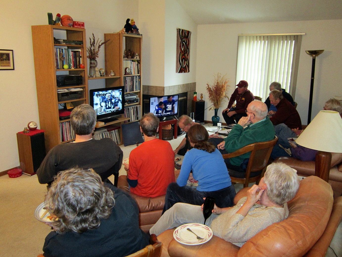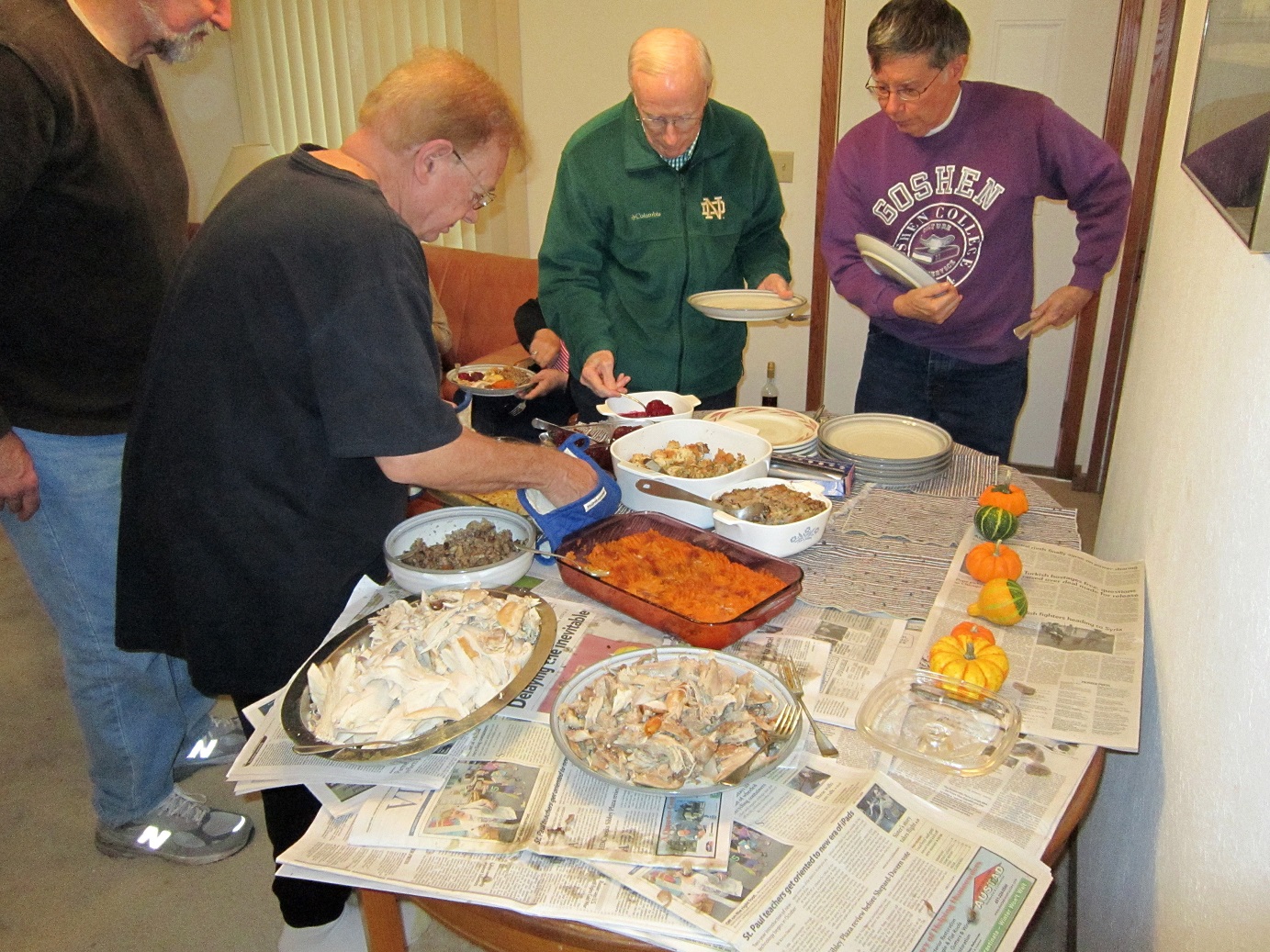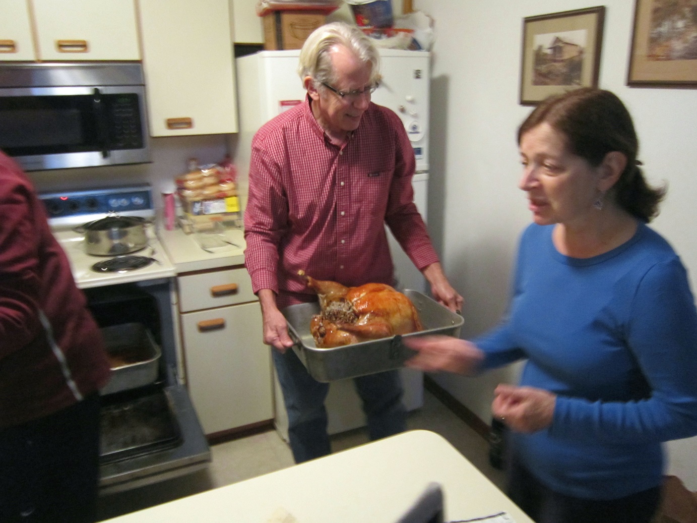 [This long running affair features friends and colleagues from those glorious college days of yesteryear, long before there was even a Woodbury, who meet at Dan’s for a full Thanksgiving dinner (a few weeks before the actual holiday) to gorge on a 26-pounder and all the fixings, and to watch as many college football games as possible. Most have assigned duties they repeat year after year . . . and a good time is had by all! 🙂 ]