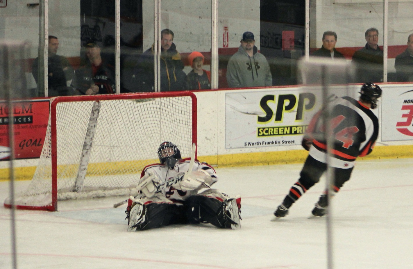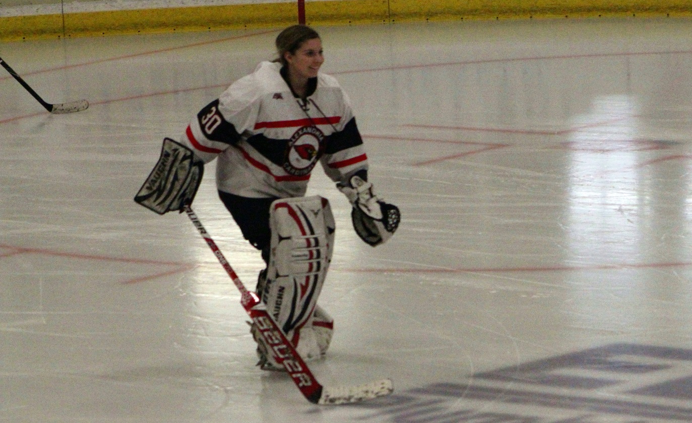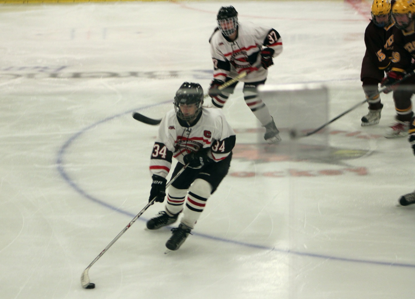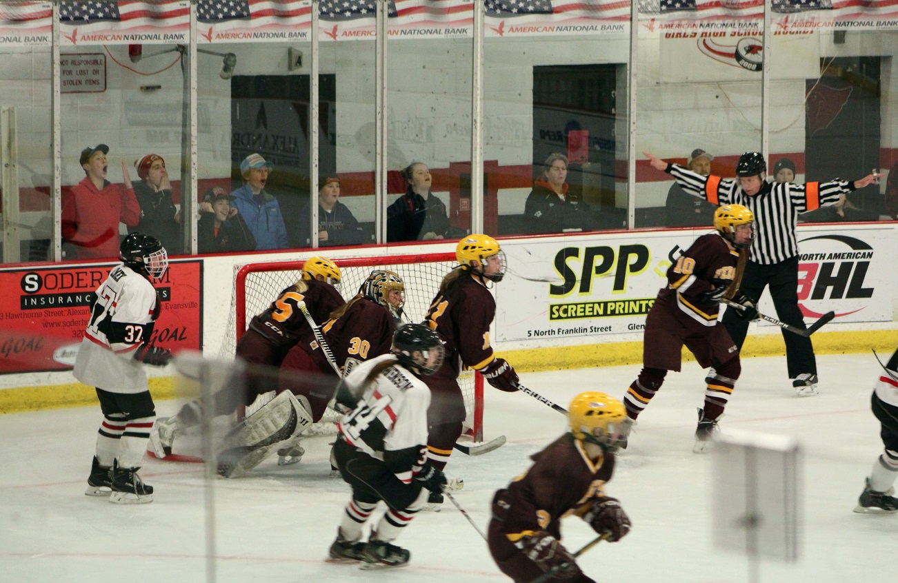 [Looks like another score! And it was so good, they duplicated it a bit later. Center Zach Johnson (17), senior, drew the face-off back to Ryan Marciniak (20) , senior forward, who one-timed into the net from the slot. Zach, incidentally, is one of three variations of “Zachs” on the team. We also have four brothers to four sister varsity hockey players – it’s a nice family affair.]