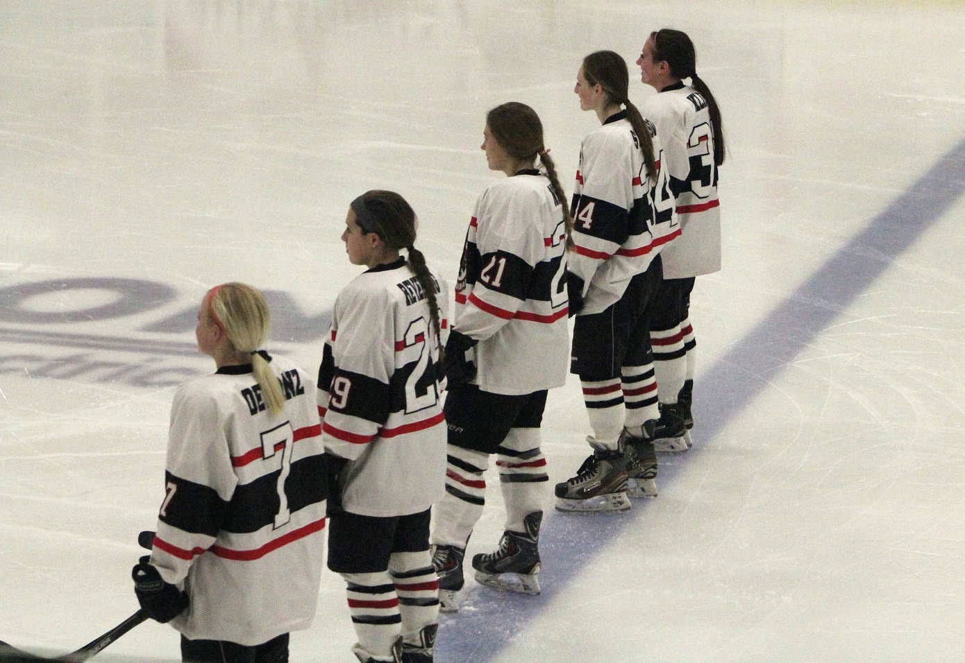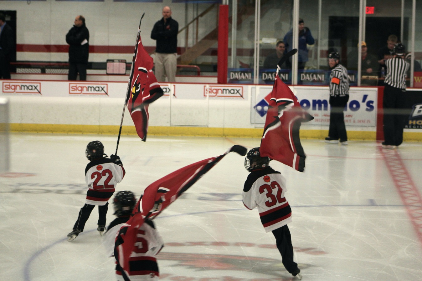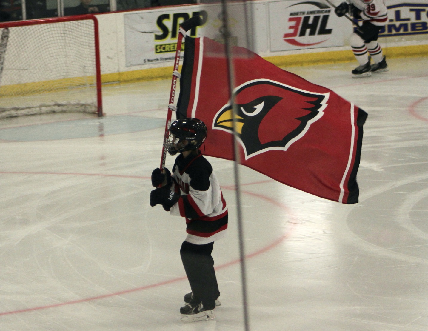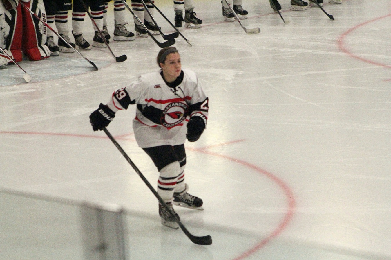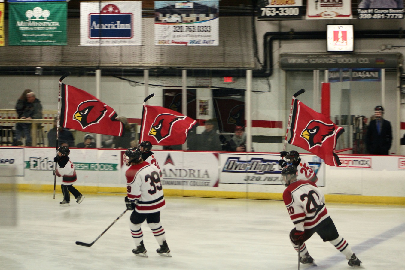 [I can’t get individual player introductions because they’re kinda done in a “disco” lighting atmosphere? The cool part is the young kids skating around with Cardinals banners. Can’t some young ladies do that do that for the girls’ games too?]
