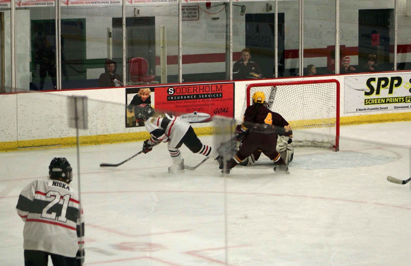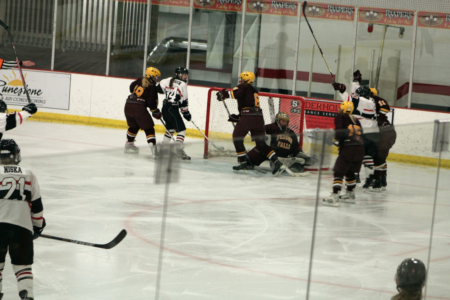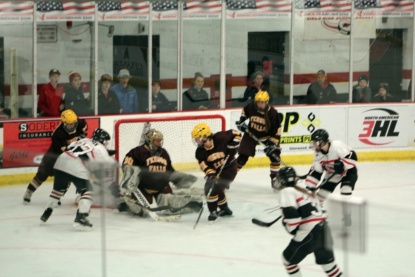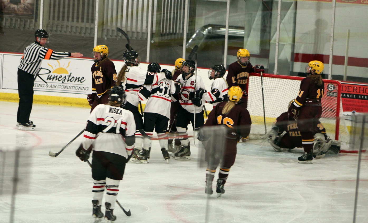 [Fergus Falls game, a conference and section rival. The Otters were not coming in with a good record, and our JV had just won by a score so lopsided they stopped posting any more goals on the scoreboard. It was time for the team to right the ship. I’ve noted that so far we have not had a 1st or 3rd line, we have three 2nd lines. For the first time (as I recall), this line was introduced to start the game, beginning with Kaila DeWanz (7), senior forward.]