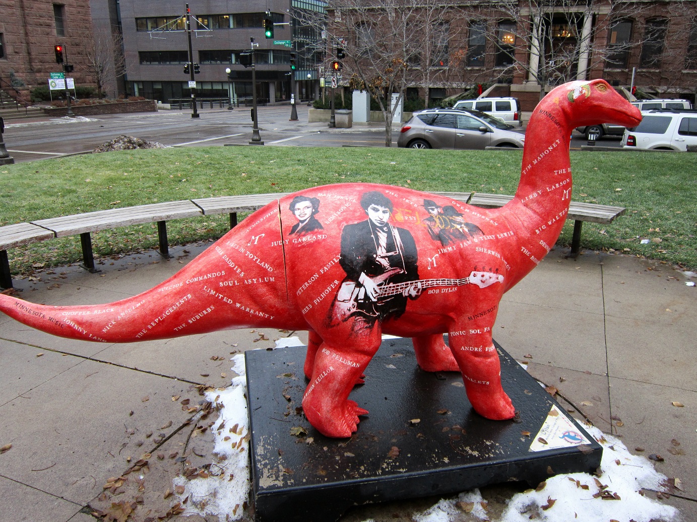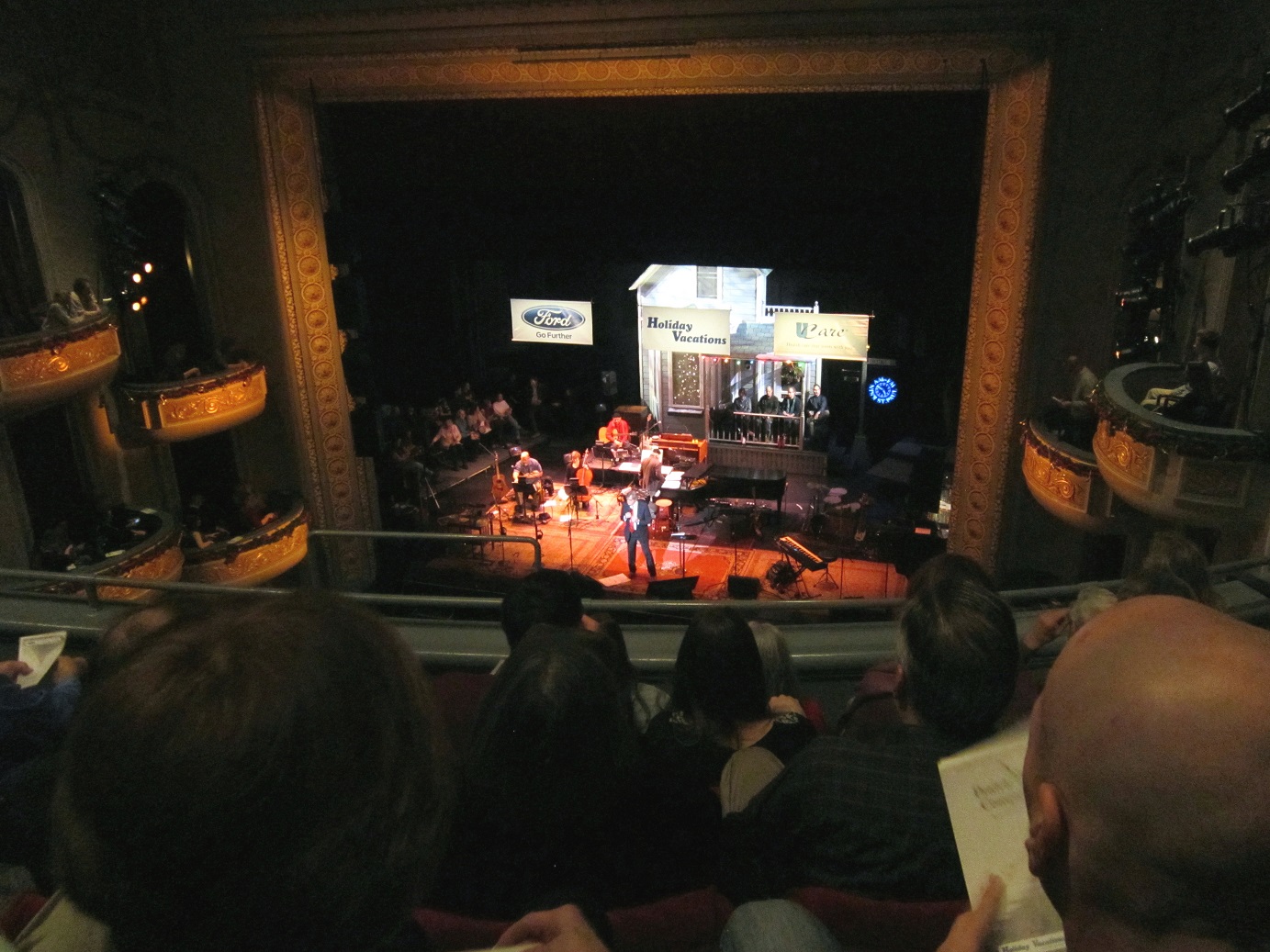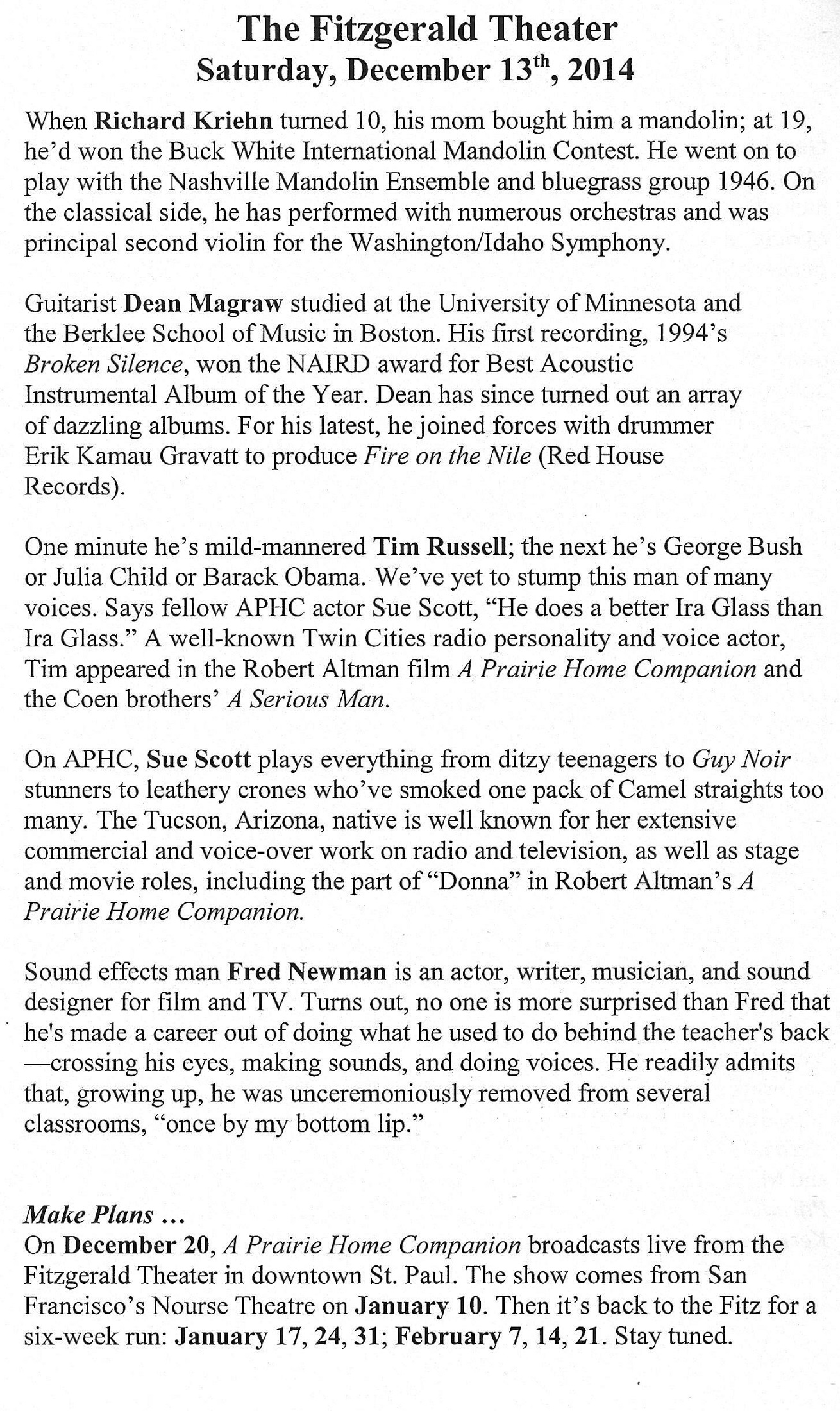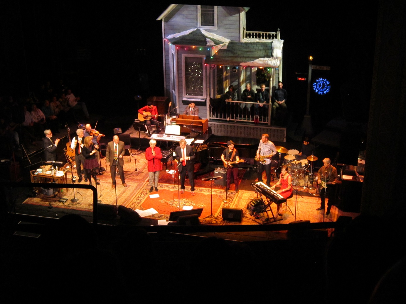 When a “Those Who Stay Behind” Annual Soiree isn’t enough to sate a weekend. How ’bout a trip to the Fitzgerald Theater on Exchange Street in St. Paul, kitty-corner from the Church of Scientology, across the street from the McNally Smith College of Music (and Dylan, the dinosaur), around the corner from the Minnesota Children’s Museum, and just down the block from Mickey’s Dining Car. It was a special date after all – twelve thirteen fourteen – and the guy is 72 years old now. We had seen him twice before, but never at his “home” at the Fitzgerald. It was 50 degrees in mid-December (it may have hit 30 twice the entire month of November) – the snow was almost gone from downtown St. Paul.
