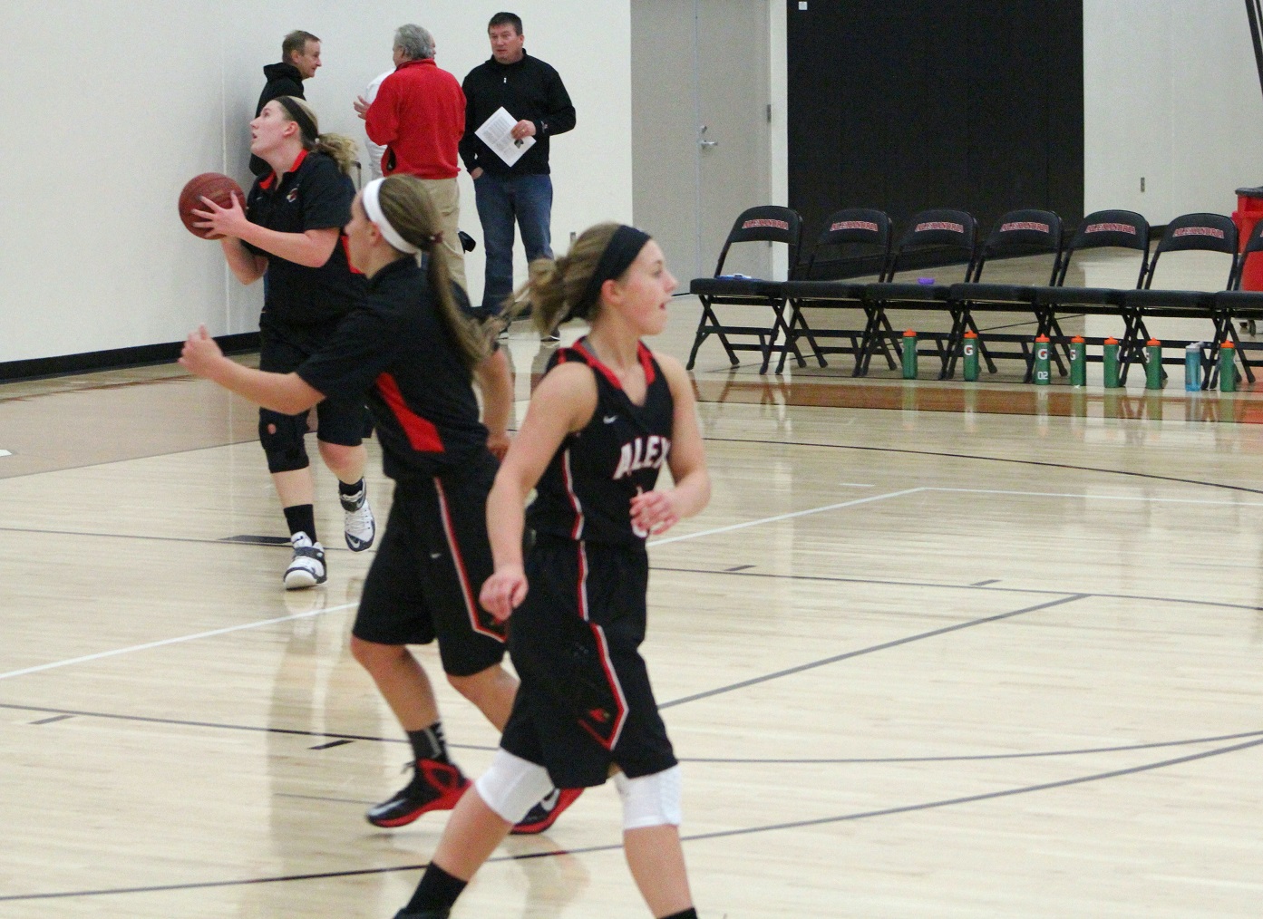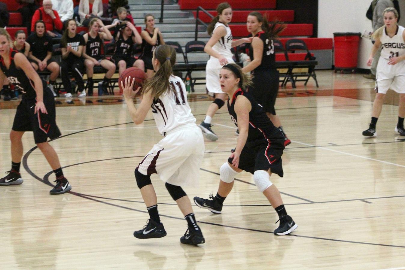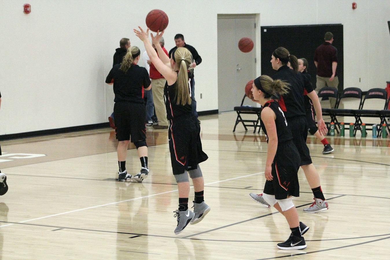 [Macy and Carly drop back on ‘D.’ I really like this photo, if I do say so myself. Probably something to do with finally getting a good shot into the bright lights of the scorer’s table in the background.]