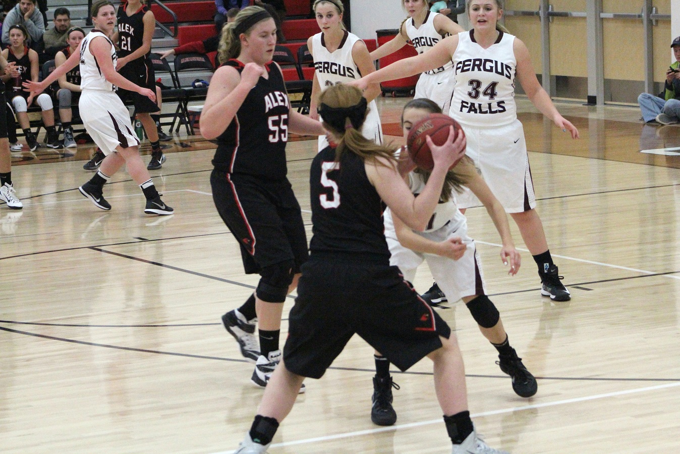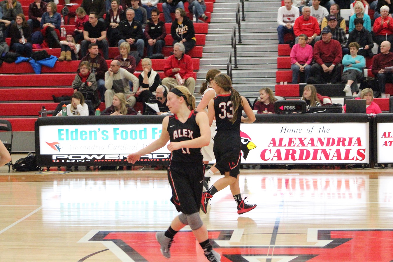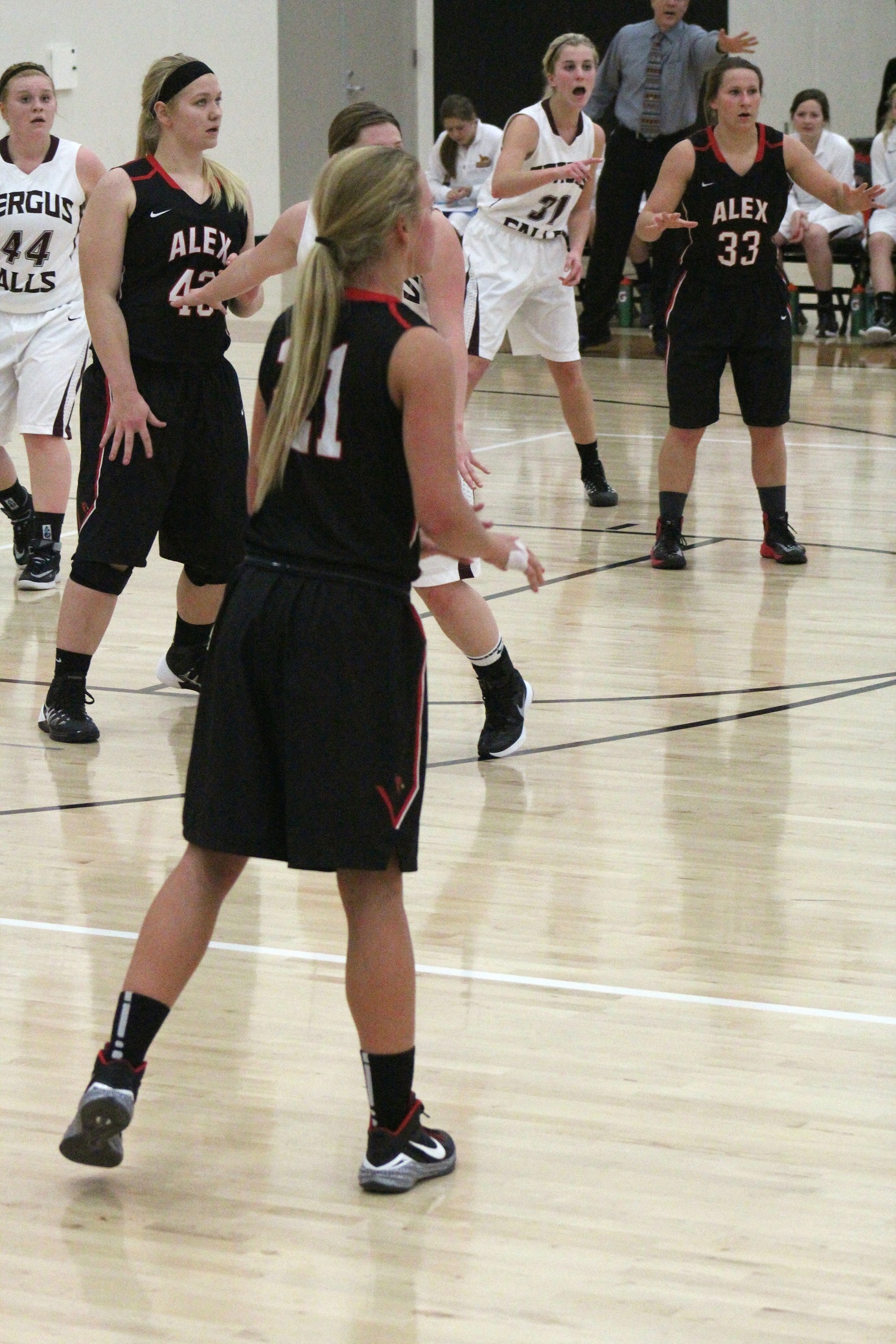 [Macy and Carly drop back on ‘D.’ I really like this photo, if I do say so myself. Probably something to do with finally getting a good shot into the bright lights of the scorer’s table in the background.]