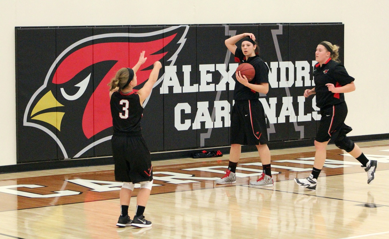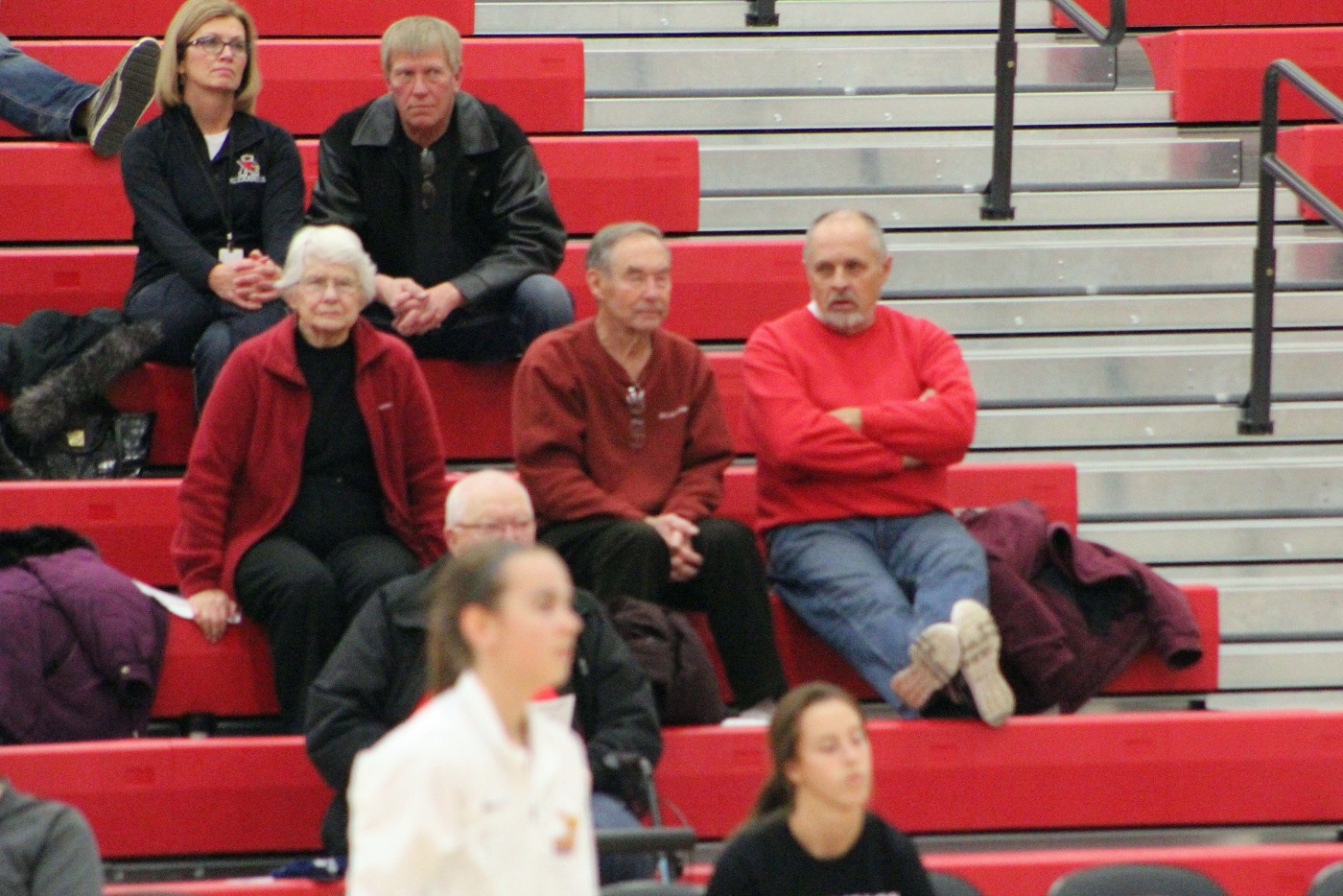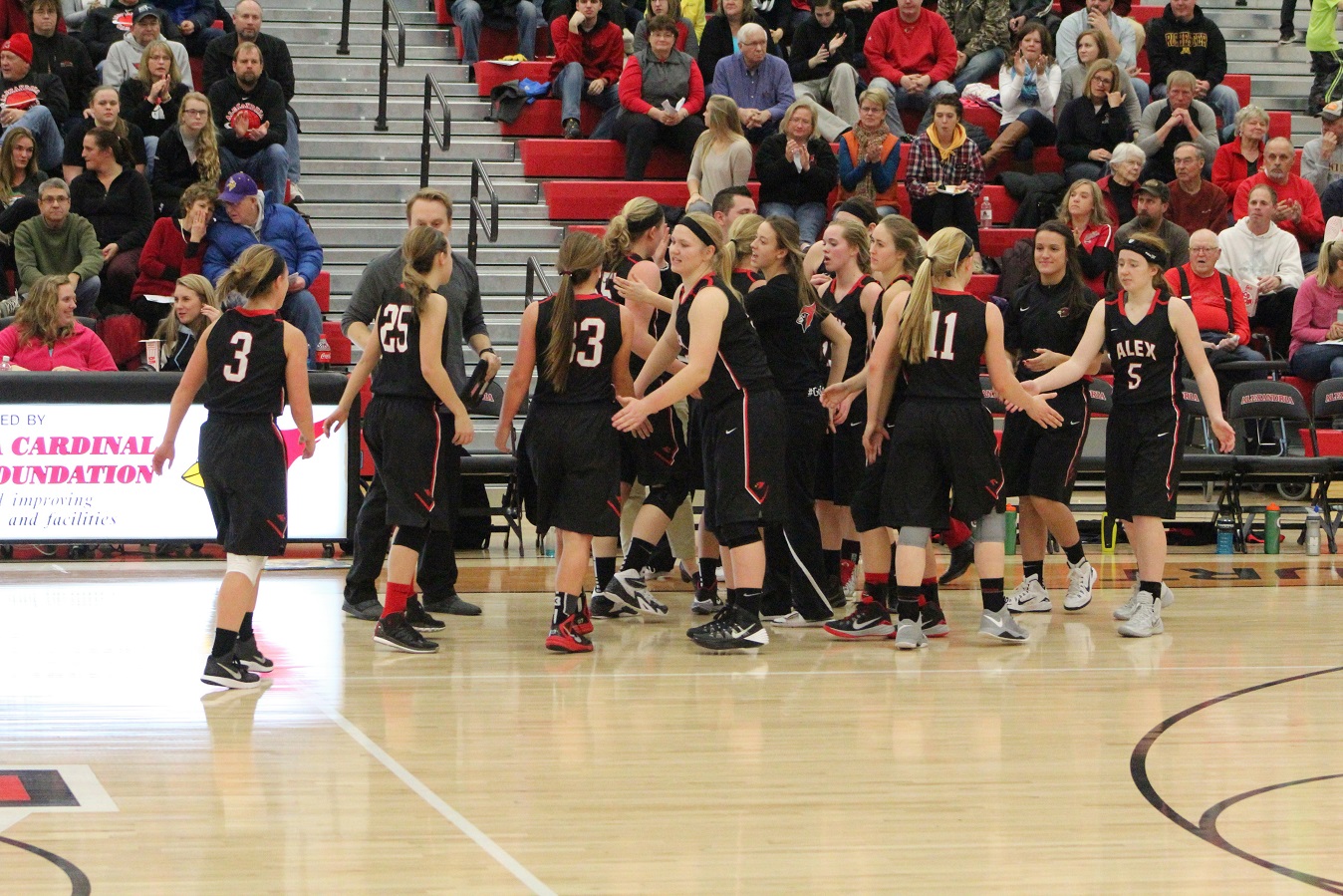 [Hey, did any of you guys notice the Flavor-of-the-Day at Culver’s when you were driving into town? Cardinal captains at the center court “meet and greet” are seniors Brooke Heggie (45), Cheyenne Hendrickson (55), and Anna Lee (23).]