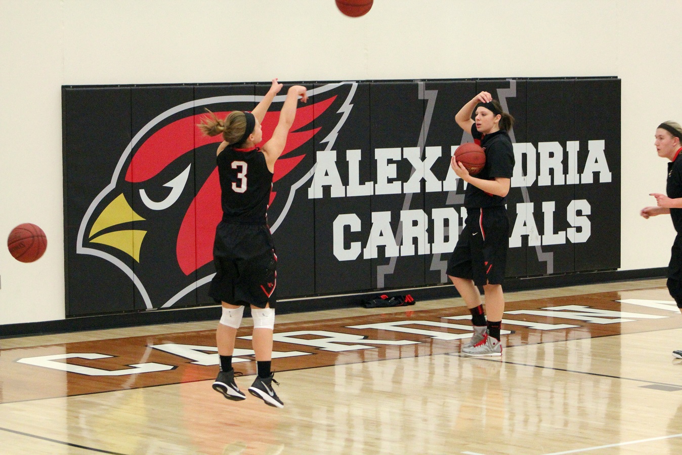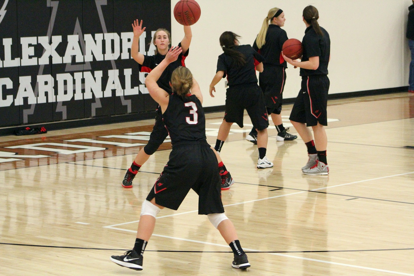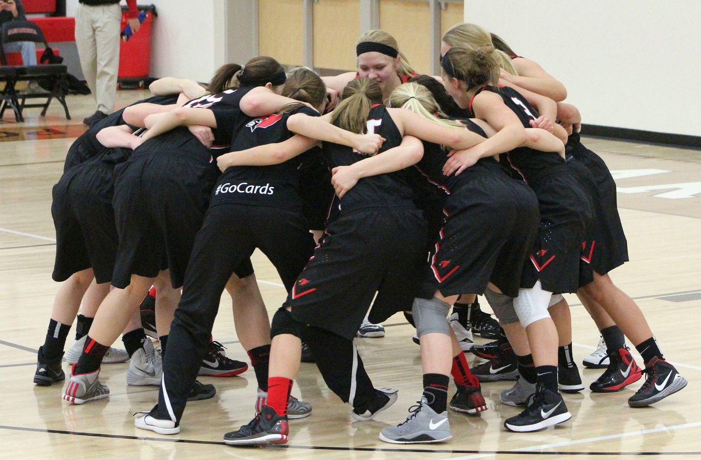 [Hey, did any of you guys notice the Flavor-of-the-Day at Culver’s when you were driving into town? Cardinal captains at the center court “meet and greet” are seniors Brooke Heggie (45), Cheyenne Hendrickson (55), and Anna Lee (23).]