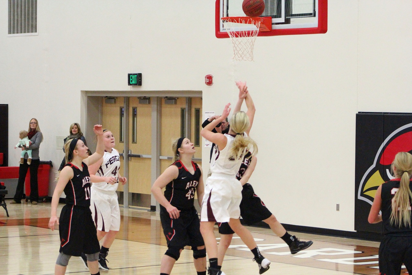[Kendall shoots; Kelby Olson-Roedel (13), sophomore forward, knows a rebound is not forthcoming.]