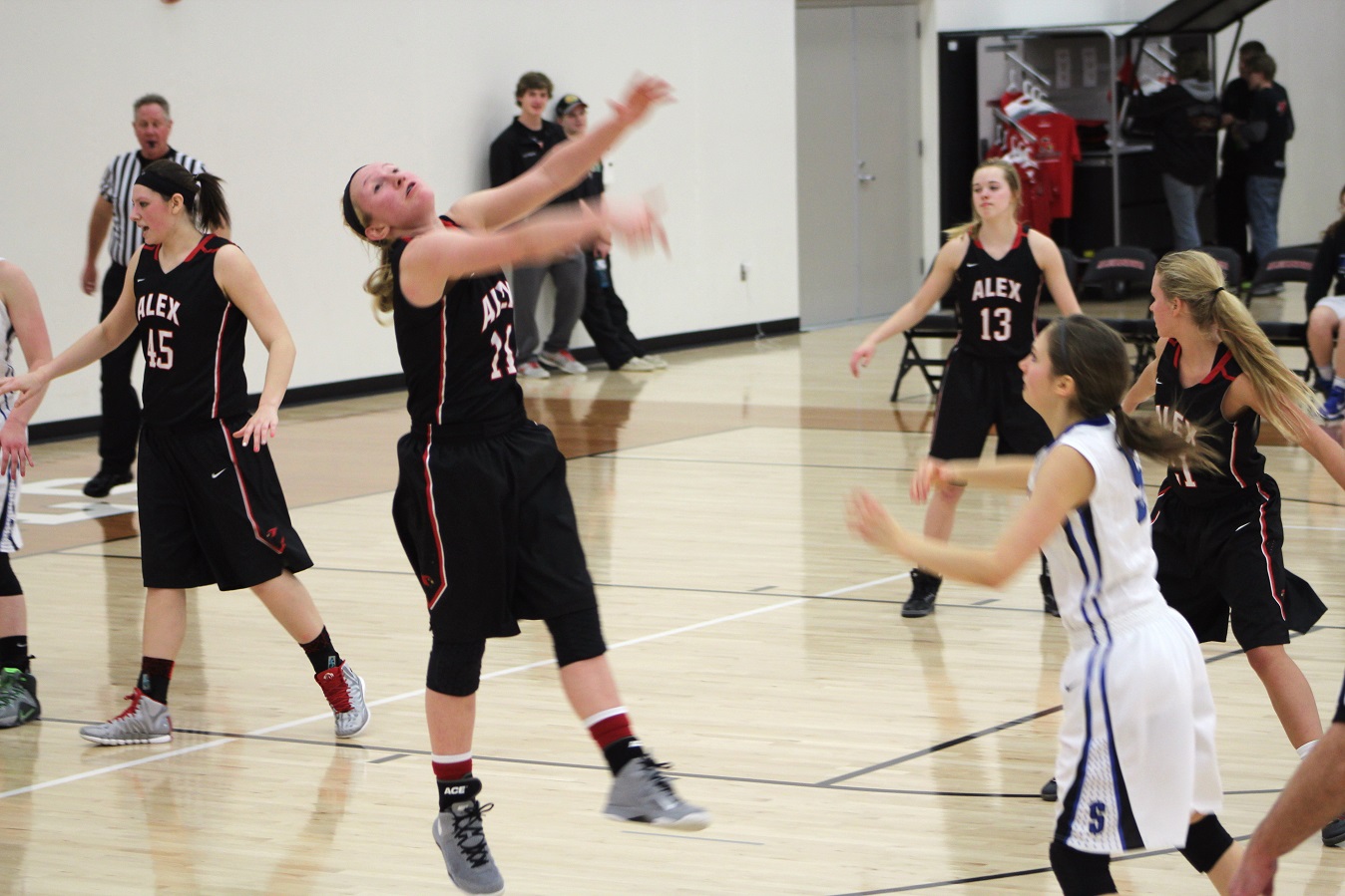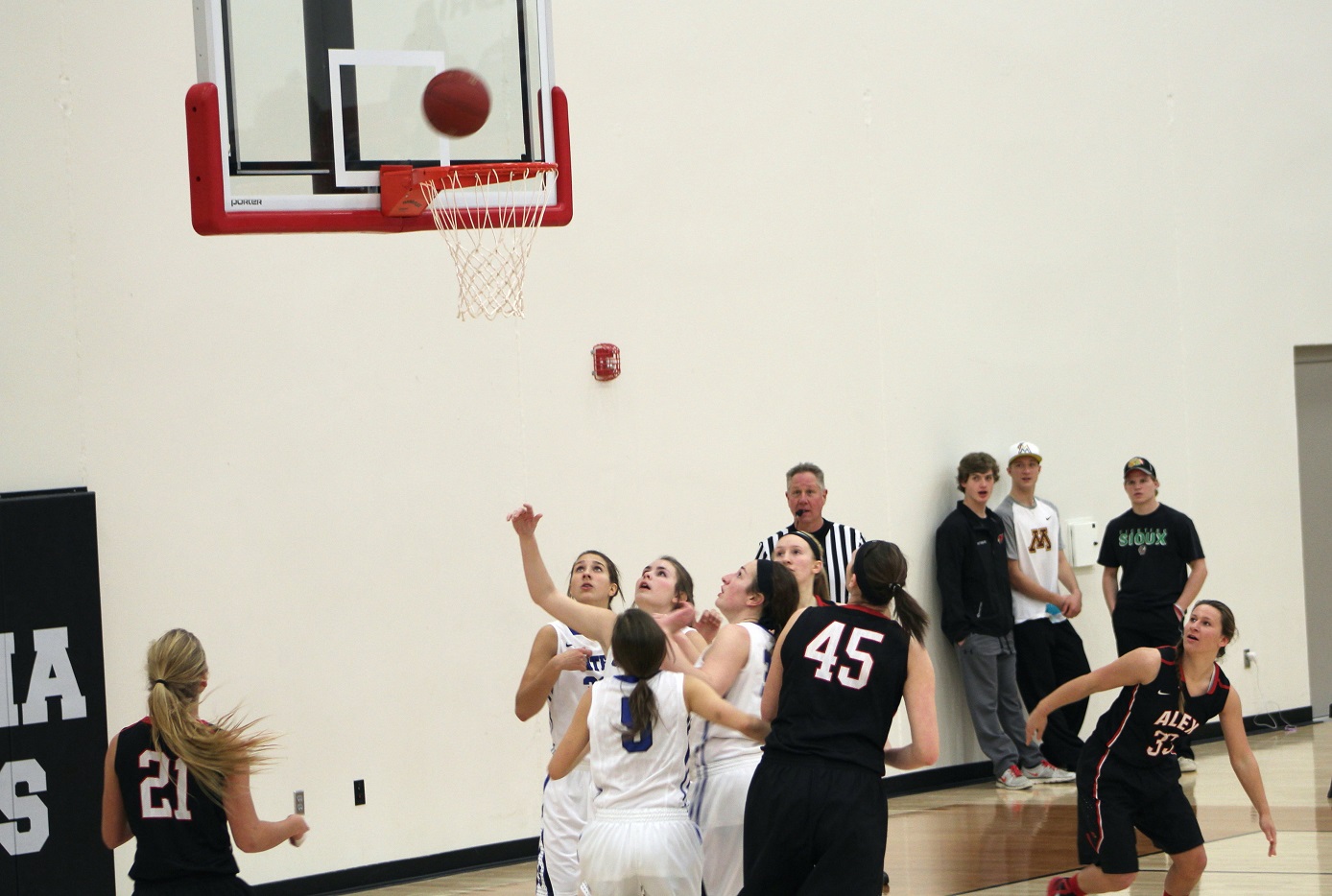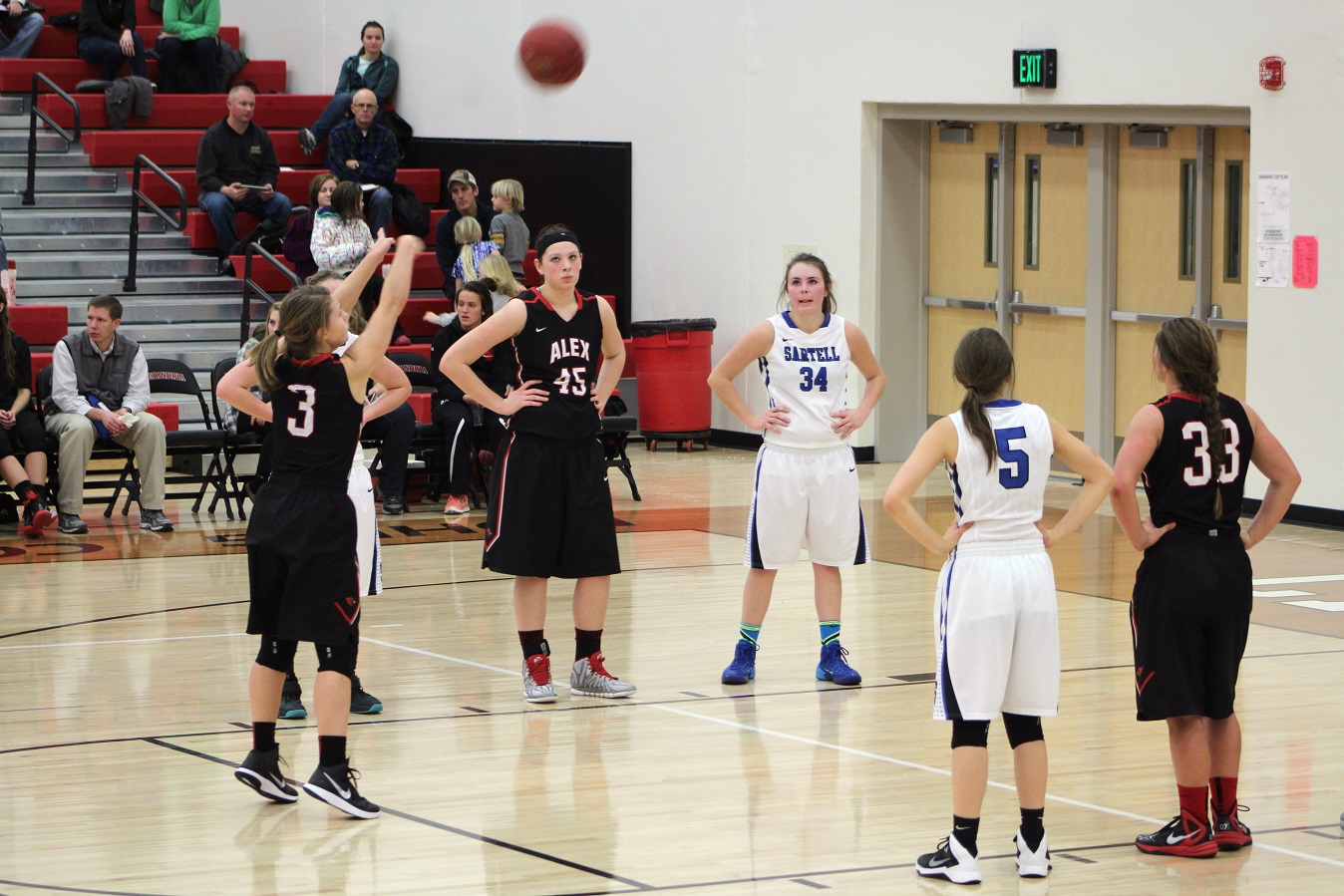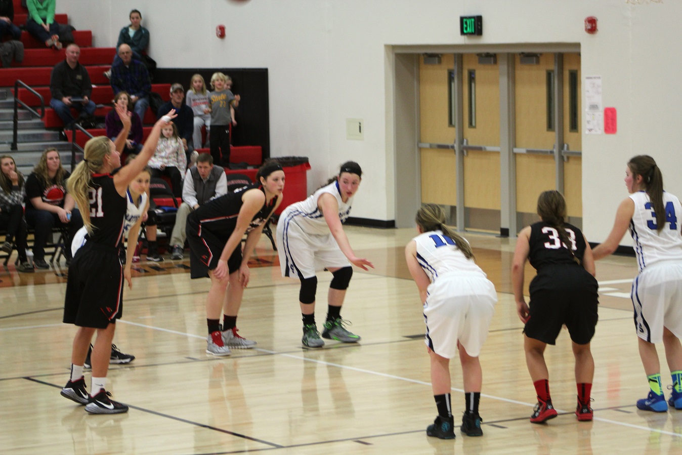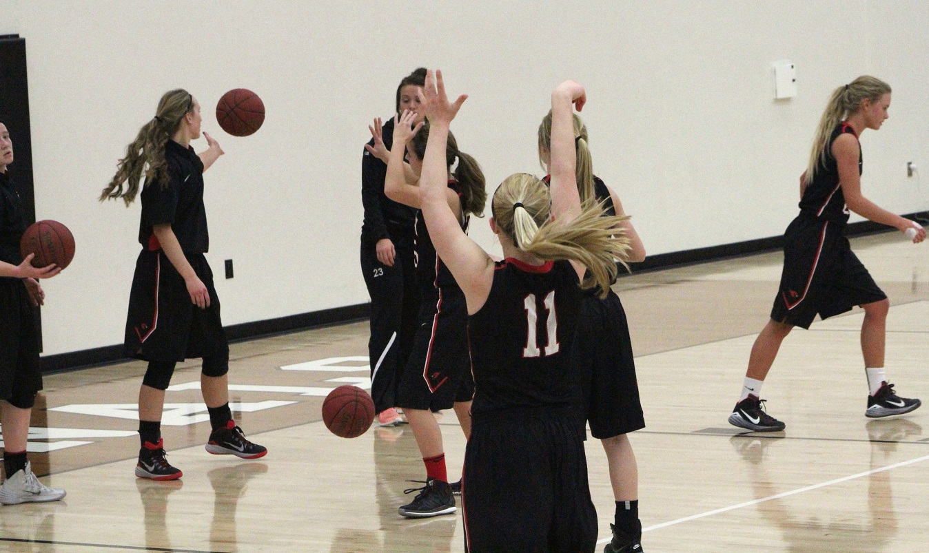 [Kendall and Brooke at the line. The team is generally good at this, but . . . I think in the 2nd half, the Sabres surprised me, and maybe the Cards(?), with their defensive abilities. Of course, the Cards are no slouch there either. The offenses ground to a halt in the second half, everybody got tired, and shooting percentages suffered. The Cards only made 1 of their last 7 free throw attempts, making the game way too close for fan comfort!]