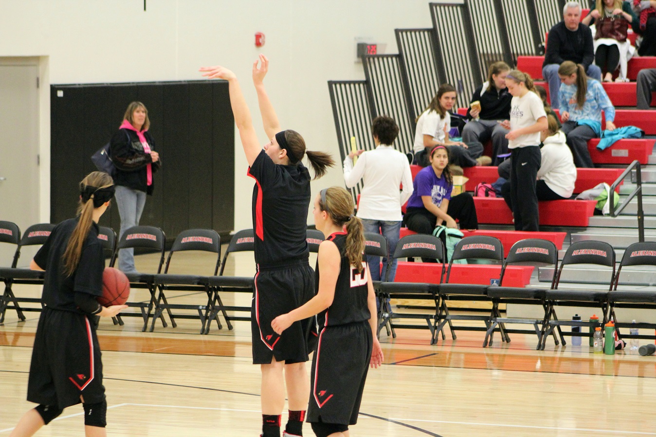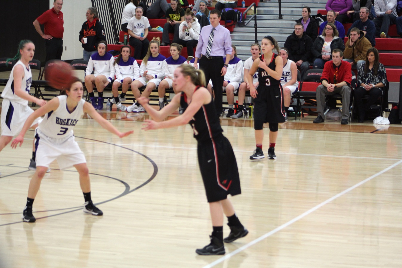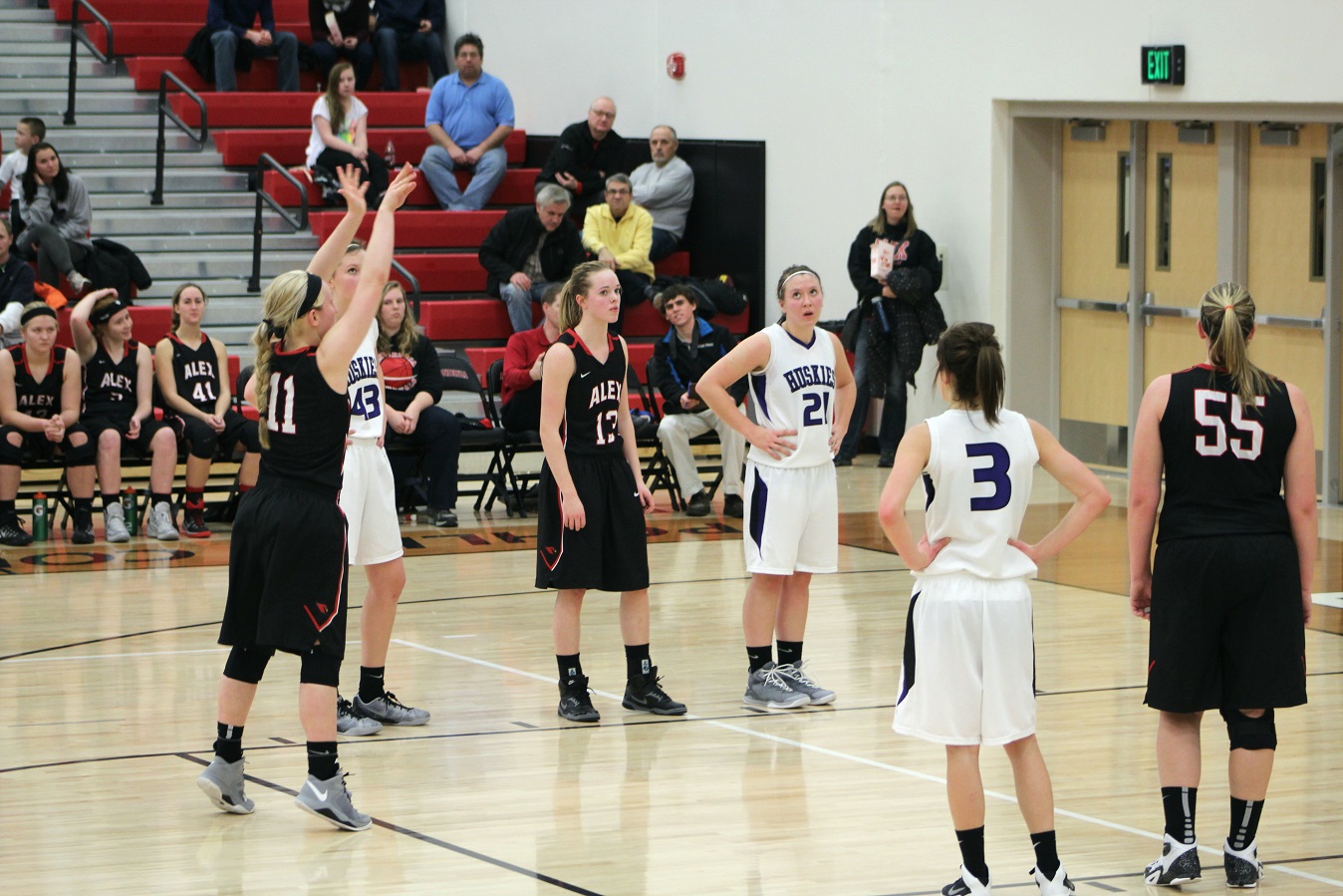 [The half ends, our best of the year. The Huskies were 14 – 14 from the free throw line in the half. Obviously, they can shoot. We didn’t let them shoot much from the floor. And we must have shot over 50% per cent from the floor, with 3’s from Kendall, Macy, Brooke, and Gretchen Revering (25), senior, came in to swish a long one. Now you can look at the video at the top for the first 5 minutes of the 2nd half – true, Kendall bricked a 3 in the video, but she also drained a howitzer from about 5-feet beyond the line.]
